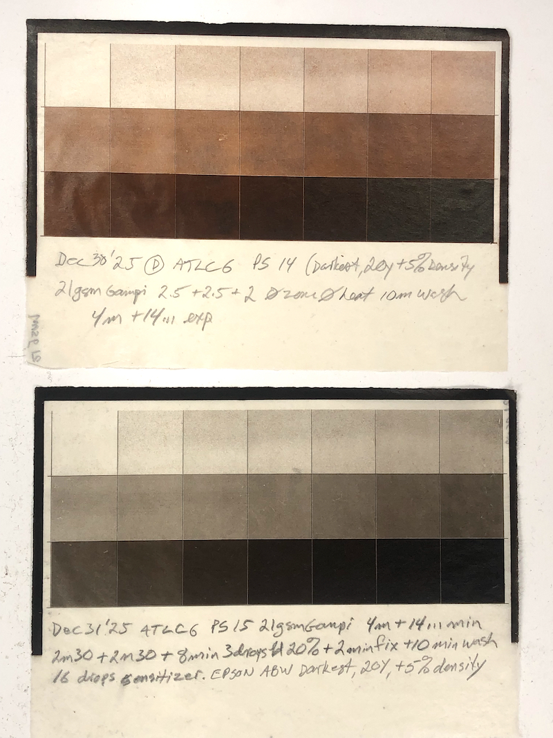 Identically exposed & processed on 21gsm Gampi, except for Palladium toned on the second one. Not fully affixed to support, just temporary tacky glue. Yes, there are coating issues, flaws in the paper, etc...work in progress!