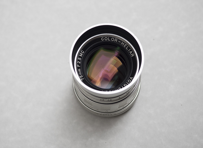 75mm Color Heliar f2.5 LTM, with apparent fungus and lots of dust as shown in photo. I am not going to have this cleaned; that is up to the buyer and the price reflects it. Lenses have front and back caps and lens hoods. Reserved. Sold
