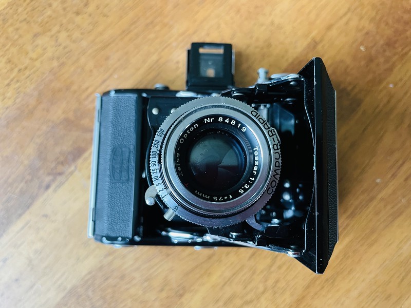 Sold. The Zeiss is a 521a I think. Tiny 645 camera with a nice clean and sharp Tessar lens. CLA and new bellows done by Jurgen Kreckel about a year ago. $130. Sold