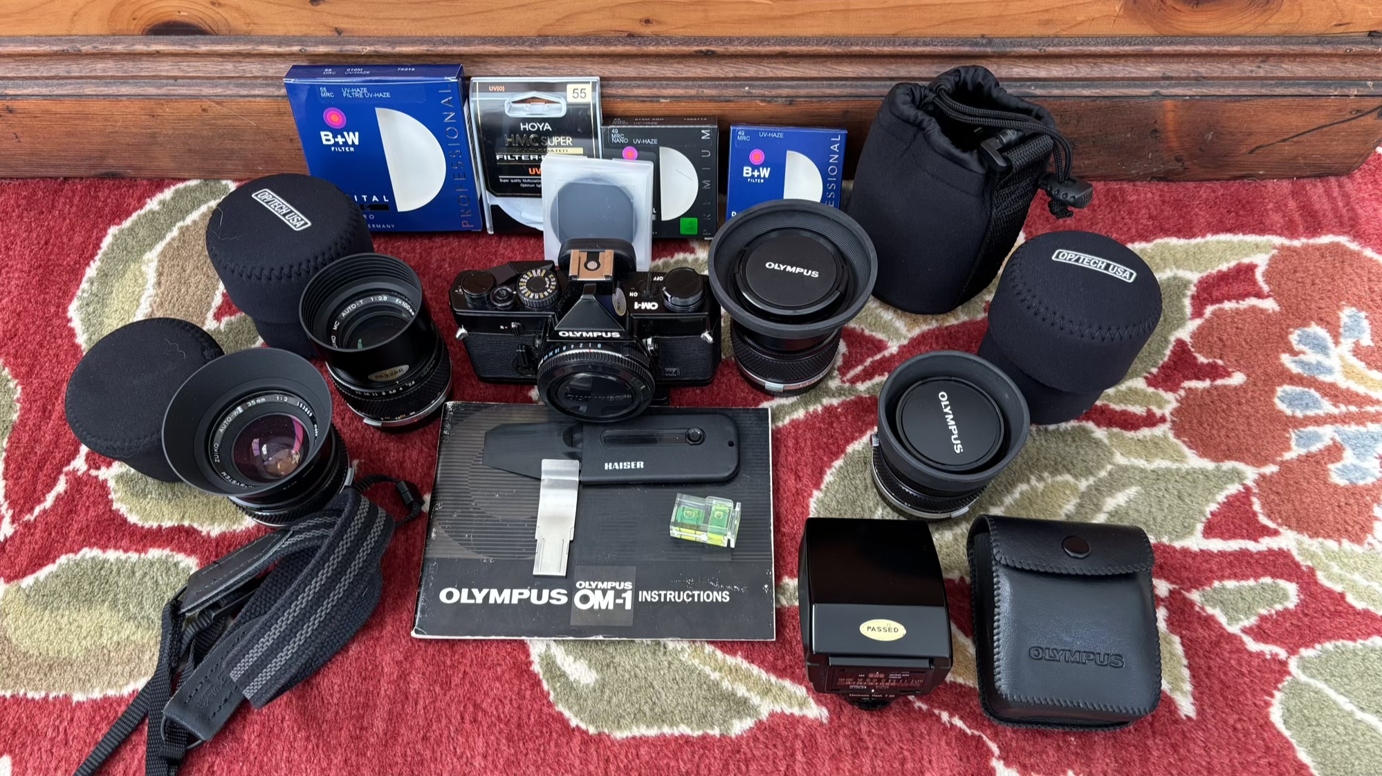 This listing is for an amazingly complete Olympus camera kit, with everything in fantastic cosmetic and working condition. This kit consists of a black OM-1 MD camera body, a working T-20 flash unit and FOUR FAST top-of the line Olympus OM Zuiko multicoated lenses with shades, UV filters and caps, plus a number of accessories. All four lenses are easily in near-mint condition, with flawless optics, no discernable dust, properly working aperture blades and buttery smooth focusing. Many of the items included are hard enough to find on their own, let alone in such a complete outfit as this. Here is everything that is included: