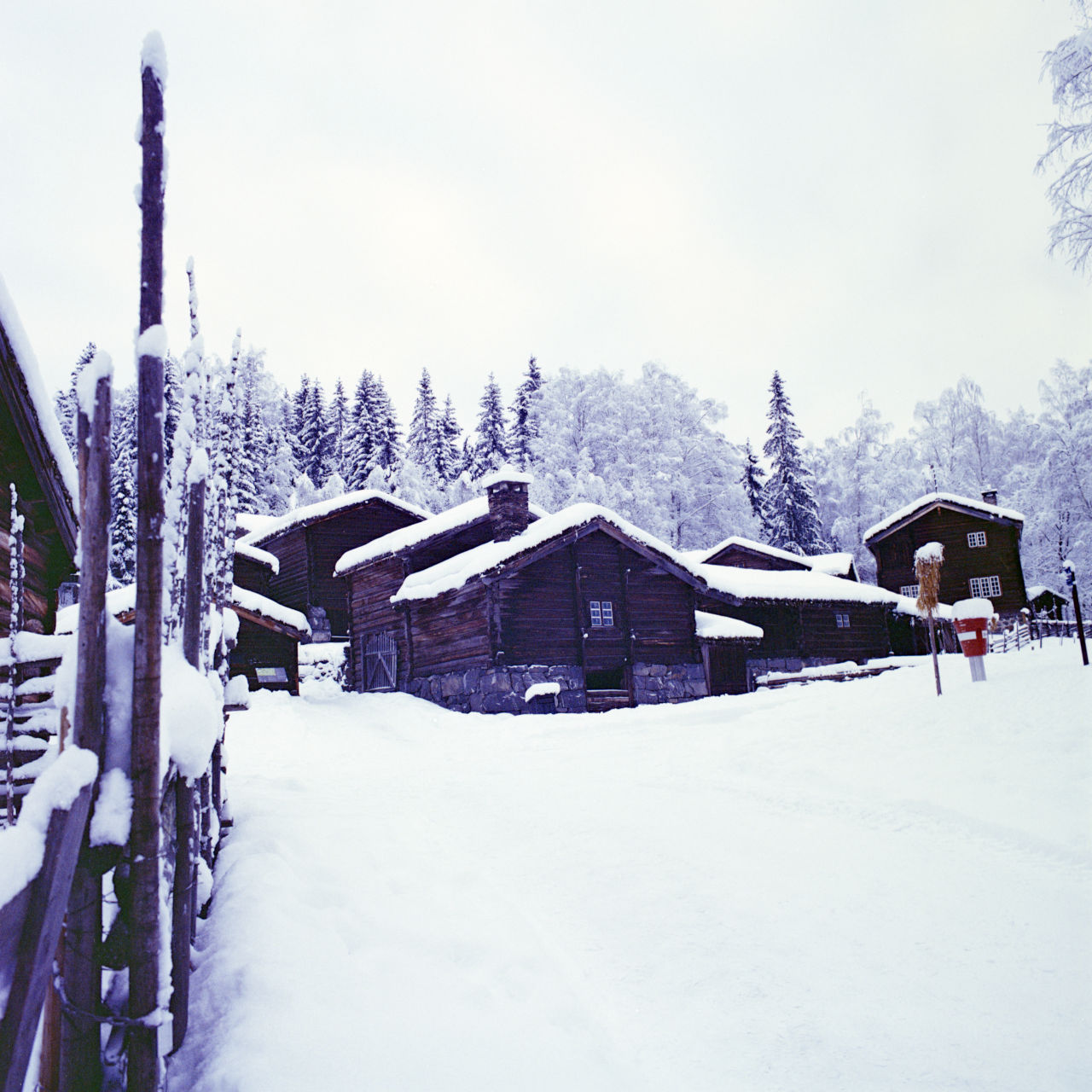 but first, it's just too damn bright. When I took that picture it was quite dark, not only a thick grey snow sky, but also it was end of the daylight, I metered the Lomography-400 at iso 800 and had to use slow speeds only. So the luminous white of the snow and the sky there are wrong and the dark brown of the tarred houses pops out too much.