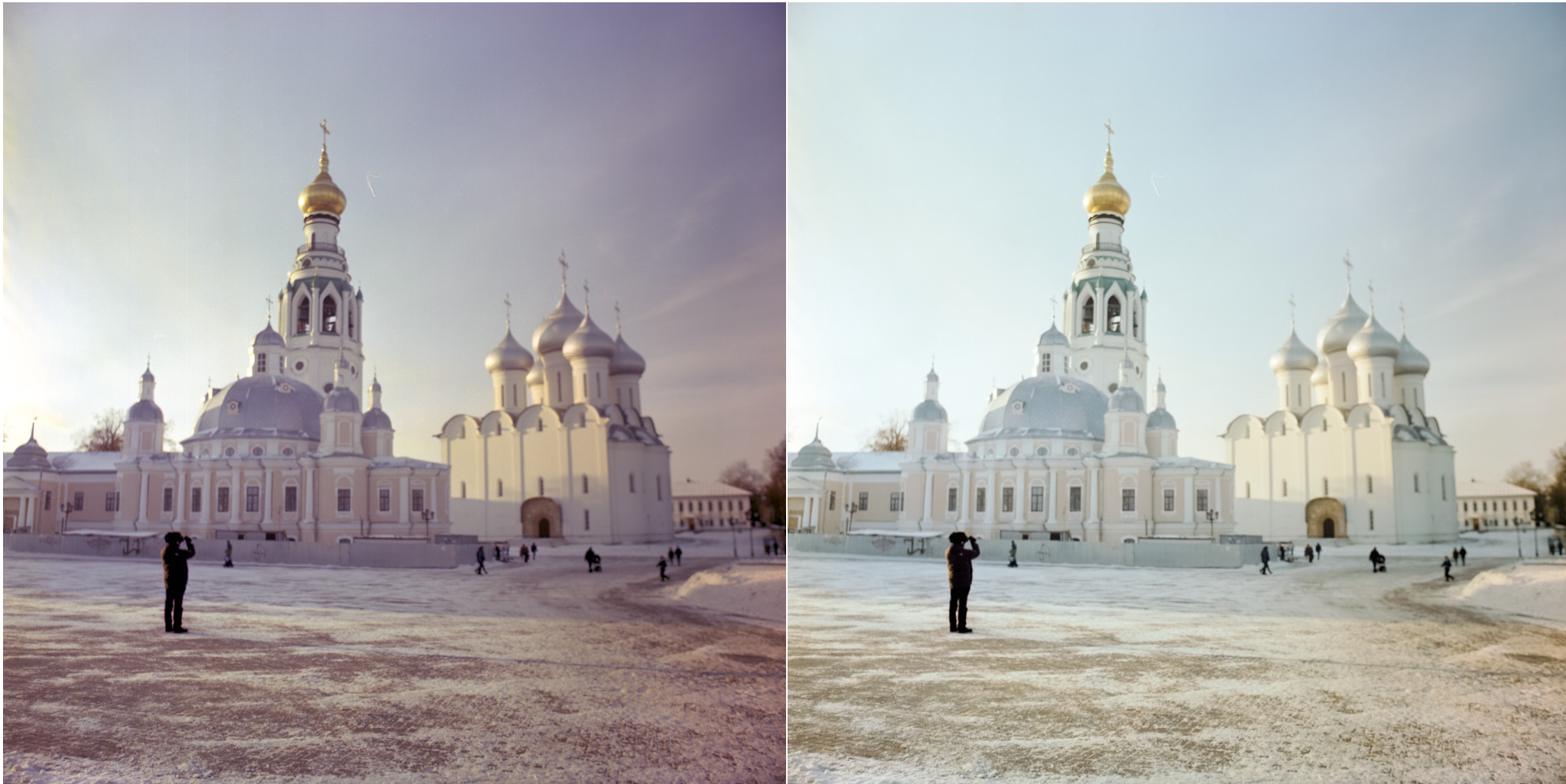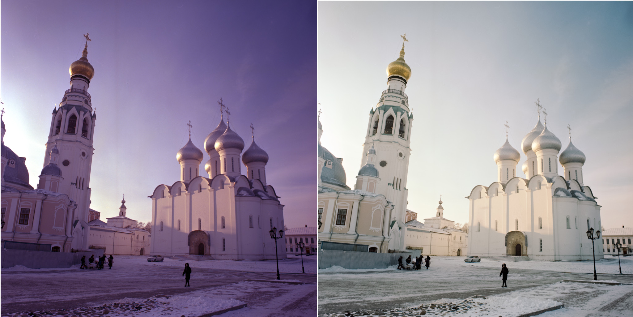 now the very purple picture of the cathedrals and towers were taken at a similar moment. It was the 28 dec. 2019 (last Christmas) around 14:00 to 15:00. Vologda is at the same latitude than my place, ~60N.