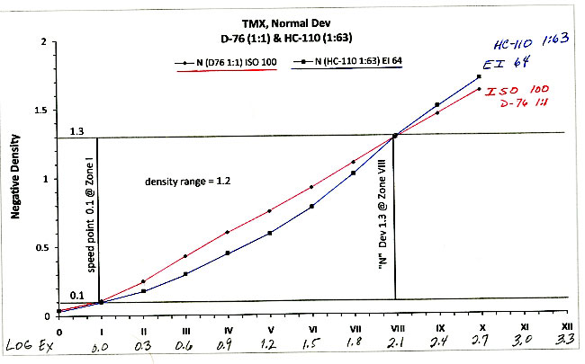 Best visualized in curve terms, IMO, when comparing one curve directly to another. Although not greatly upswept, the point is there. Just look at the curves themselves not any of the zone density data, that's not really relative to the point, IMO. Observe the slope of the HC110 curve from Zone VI to VII and VII to VIII, VIII to IX---the actual slope i.e. steepness of the curve in that region compared to the D76 curve is greater---you would expect somewhat greater highlight separation in that negative versus that same highlight developed in D76. I think with Tri-X with HC110, the length of the toe would be even longer and the steepness of the "upswept" curve would be more pronounced, IDK. Hope that was helpful.
