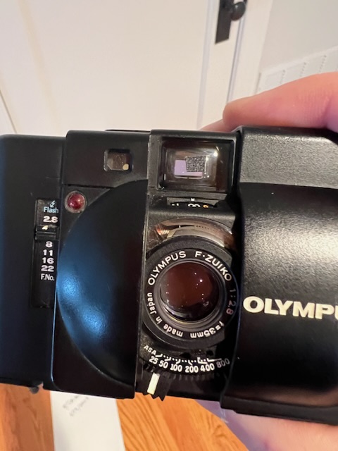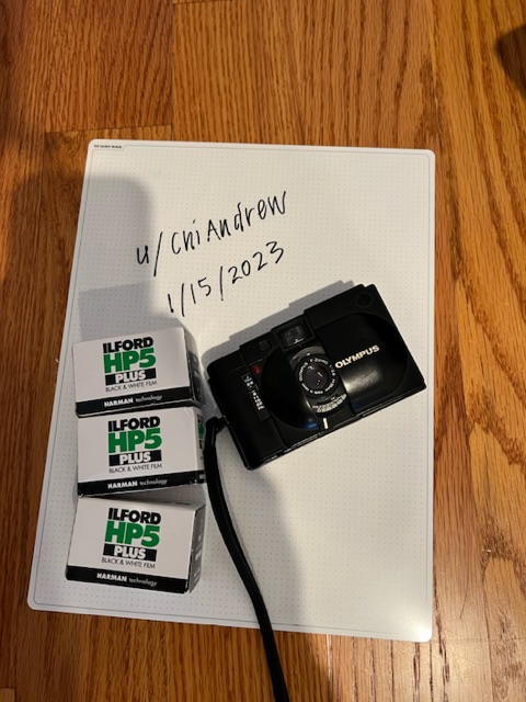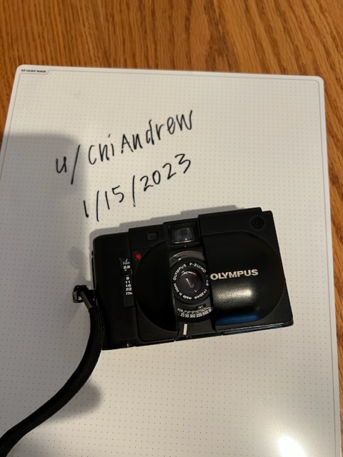 Olympus XA and three fresh rolls of Ilford HP5+. Camera is old and used but works well. Glass in clean and clear. Body has marks, viewfinder a little marked up and dirty. Also has the small black tape square on it to help with focusing. Priced very fairly with film. Images are really nice and sharp out of camera. Condition 7.5/ 10