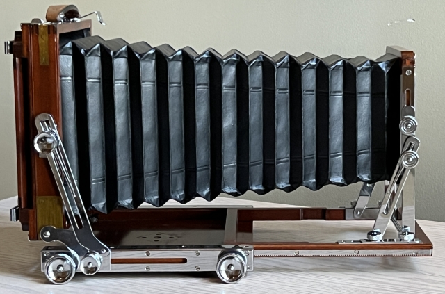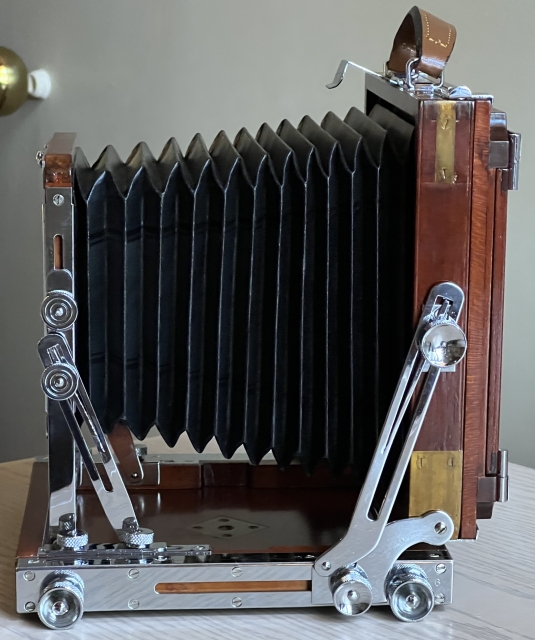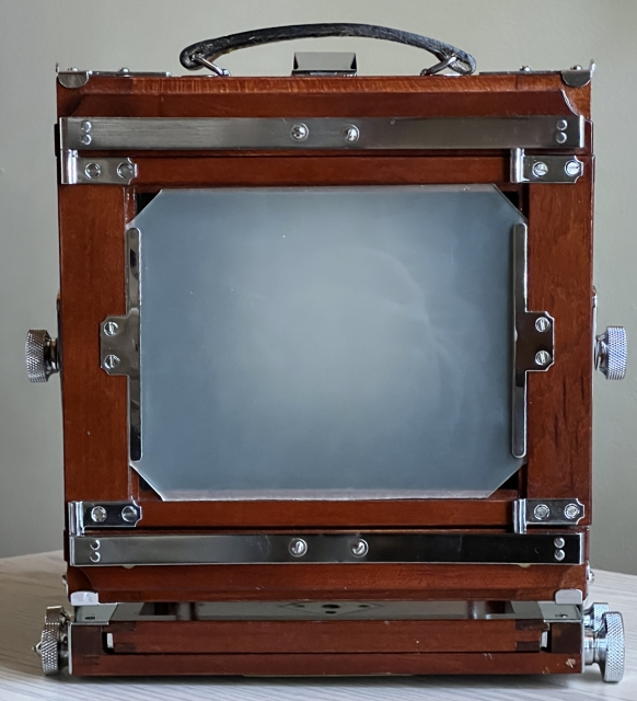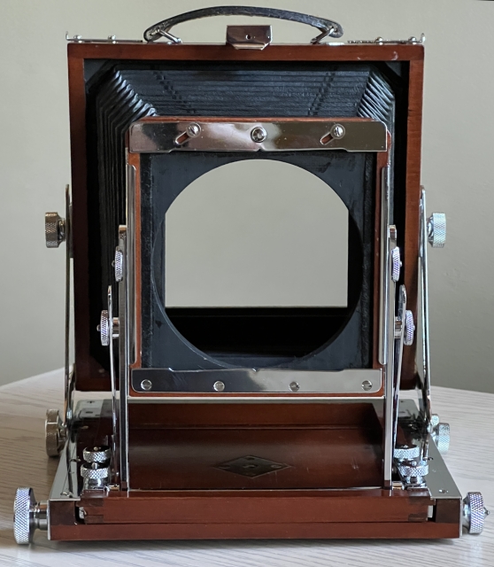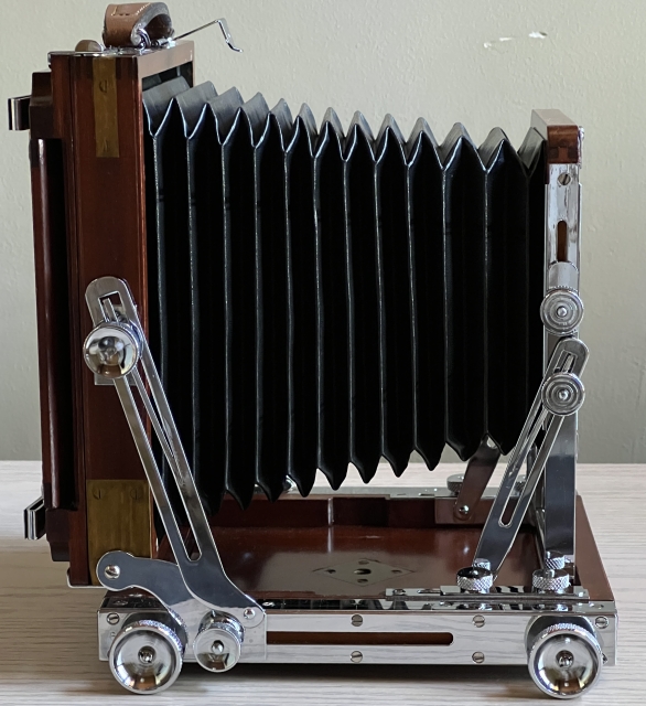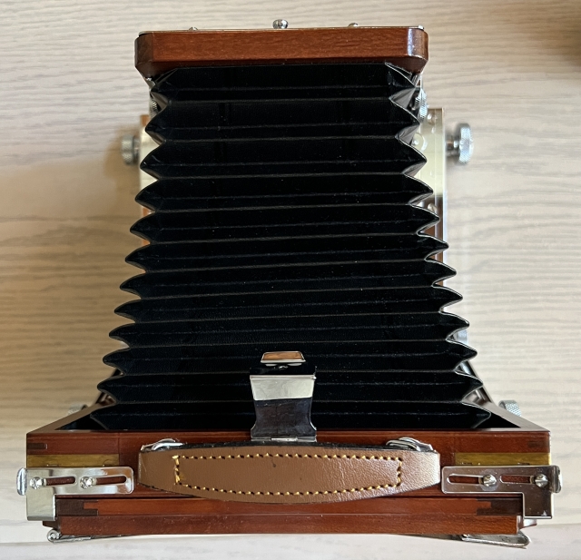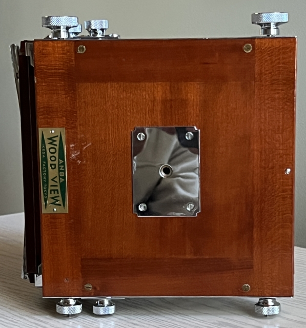 This Anba Ikeda Wood View 4x5 appears to be unused. The only obvious flaw I can find is a small scuffed/imprinted area on the bottom - it looks like it was pressed against some screws. The camera has no signs of having been mounted on a tripod, the wood finish is in excellent condition all around other than the marks already noted on the bottom, all the metal is unscratched and shiny, and the leather handle looks new. All the various knobs are present and functional. The bellows looks new and passed the flashlight test in my darkroom. Maximum usable extension is around 12-1/2". My kitchen scale puts the weight at 1.232kg, or 2 pounds 11.5 ounces. Racking out the extension is a little tight as it hasn't been used enough to wear in.