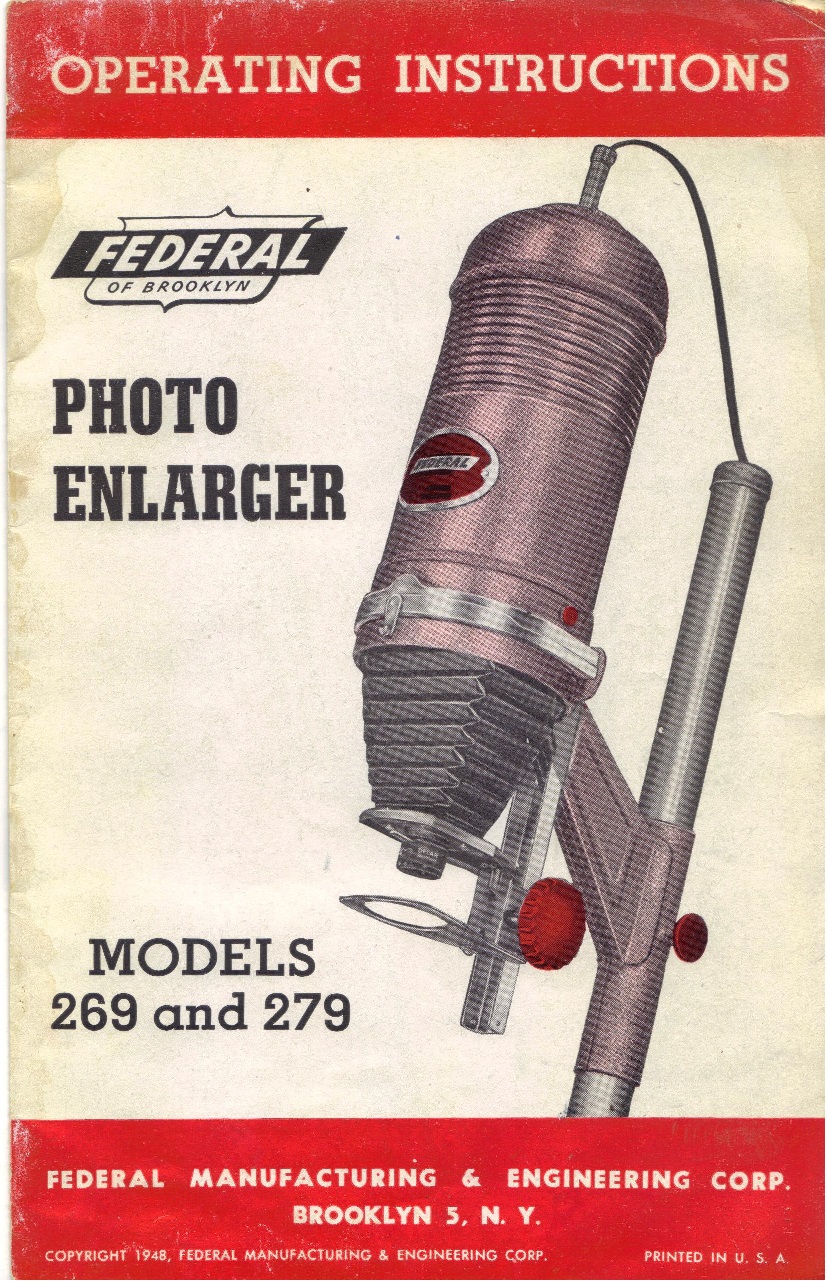 In a heap of old books I found this ancient (1948) booklet of operating instructions for Federal enlarger models 269 and 279: 12 pages of detailed description & advice, 5½ by 8½ inches and in fair condition. It must almost have museal value.