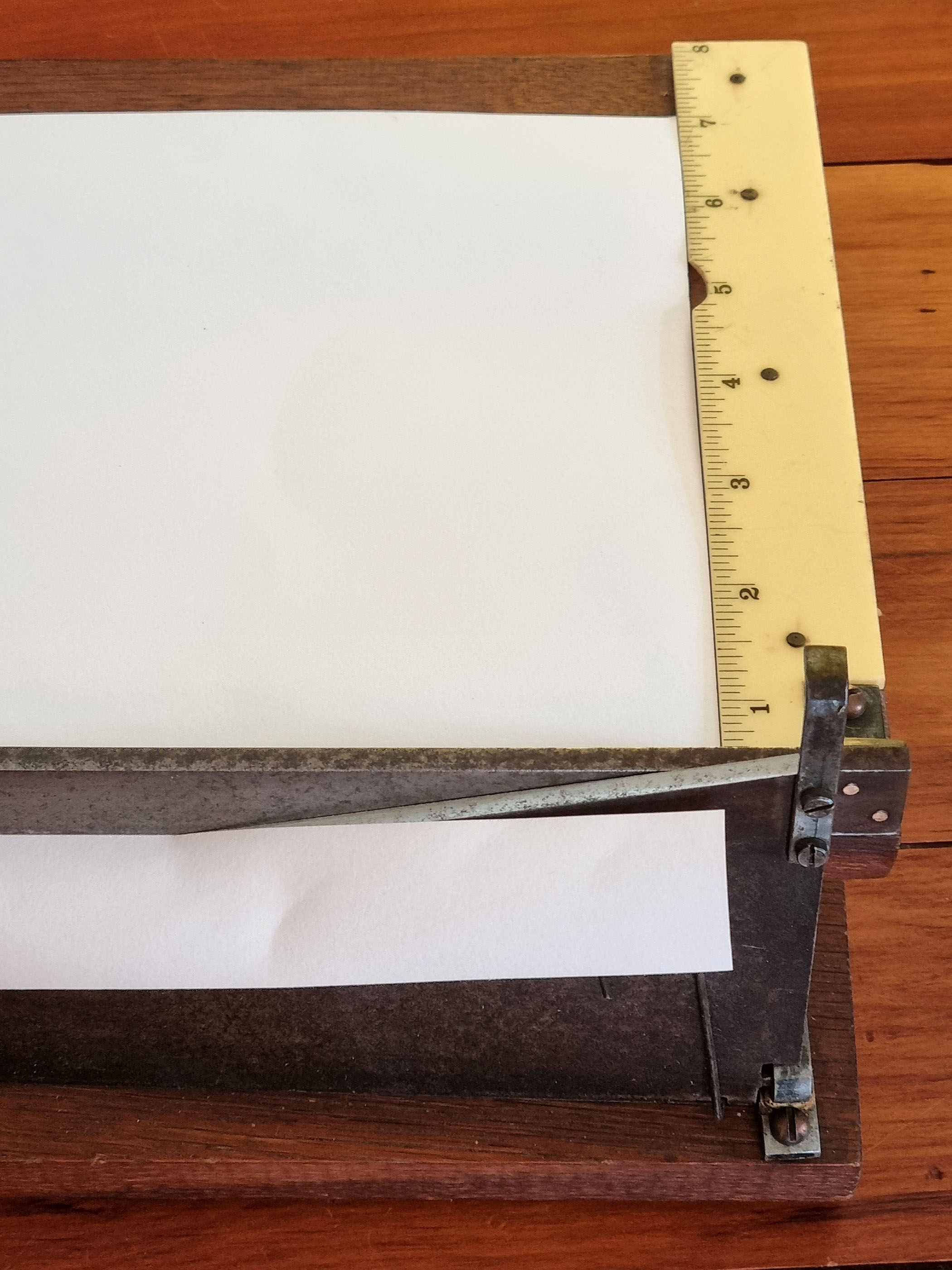 Sold Antique English 8x10" paper guillotine for sale. Clean, sharp and in good working order.