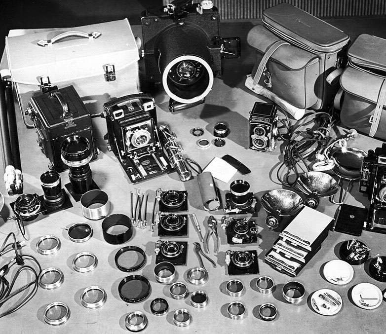 But, I wonder why she considered a (small-) gas pipe wrench and pliers as being a part of her photographic equipment (look in the middle of the lenses)...
