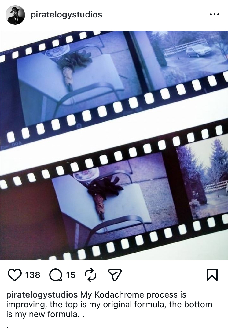 He was using mostly original kodachrome chemistry (which came in tins mind you right to the very end) with an improvised yellow using the older 1930's patents.