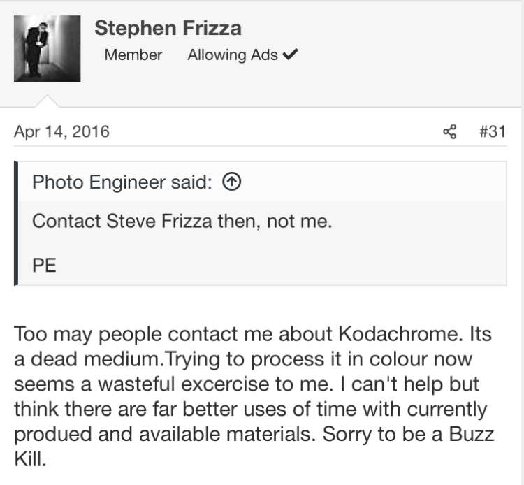 The guy on here from Australia who figured out how to do it was Stephen (Steven?) Frizza. He hasn't been on here or on his social media for ages, so I don't know what's going on with him. He ran a commercial photo lab in Sydney for a while and so had the tools and facilities to try and do it. He was also independently wealthy.