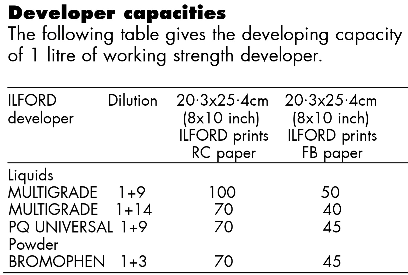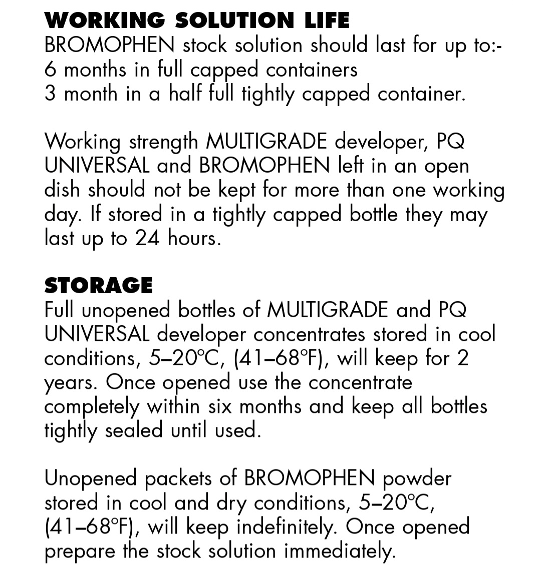 However, once mixed to a stock solution the keeping isn't as good as the liquid concentrate. Ilford says the Bromophen stock solution has a life of 6 months, the working solution life is the same for both.