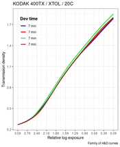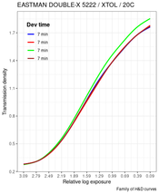 I guess I overcooked the "green" development a bit, but, overall, the results show reasonable consistency. The curves of both films are well-formed, showing a long, smooth tonality and excellent tonal separation along virtually the entire range. Given enough exposure, these two films are obviously capable of excellent results. Yes, the two curve families have a slightly different overall shape, but it remains to be seen whether XTOL and XTOL-R differ in how they affect contrast, tonality and film speed.