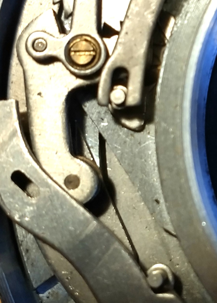 Thanks to to the both of you. Referencing the images on the german website I wonder if the screw might have broken off inside of the lower lever that seems to have a hole going through it in the pictures. The screw does seem to be quite short. Or is that something coming through from the bottom? Going off what is written, would I be correct in assuming that the selector pin on the dial should grab on to the cutout rather than the screw being screwed into it?