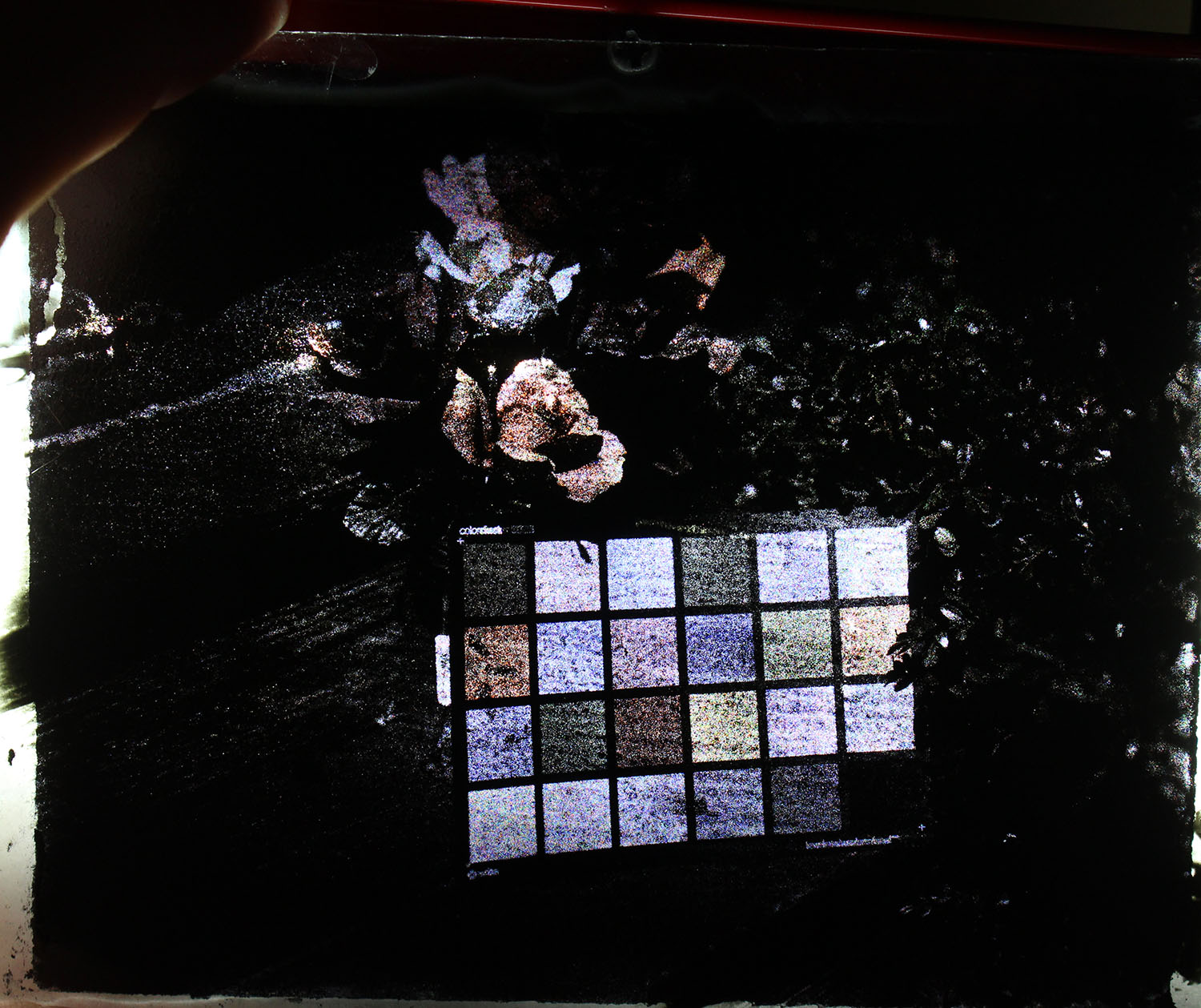 As you can see, the colors here are very weak compared to some of my previous shots. It was an overcast day, ~EV11, exposed for 20 seconds. IIRC another stop would have increased the saturation a bit (and another plate shot at 10s seems to back this up, as the colors were even less distinct). I think the emulsion was a bit too dilute this time, as the shadows were fairly weak. I'll coat four more plates tonight with 8mL of emulsion each and see how that performs. As you can see from the exposed screen, this is an older one and hardly neutral in tone -- so I won't be basing any dye concentration adjustment decisions off of this.