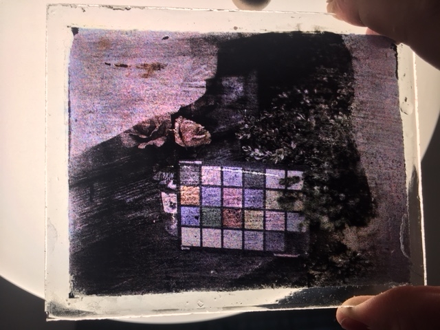 Here's a new successful test. And it only took me 8 plates to get there! I was annoyed with inconsistent results with the Dufay Color FD, so for fun I went back to something I tried in December - just using plain old D76 as the FD. And now that my coating technique has improved significantly, this didn't turn out all that bad! Using D76, it appears the plate is a lot less contrasty, and much more like a normal looking photograph. This is at the cost of speed (this was 15 seconds with an EV 15 subject!) and brightness - this plate is quite dim.