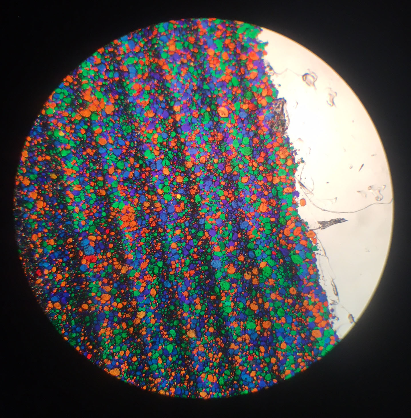 In IMG_2753, you can see the difference in transmitted light between one 45 minute pressing, and a second 45 minute pressing (the plate shifted near the end of the second pressing, giving us a neat little comparison). You can see the differences through the microscope in IMG_2754. It's hard to see, but the grains are a bit more rounded with only one pressing, and there seems to be a bit more interstitial spaces between them. I think, to get things to a satisfactory level, this second pressing may be necessary.