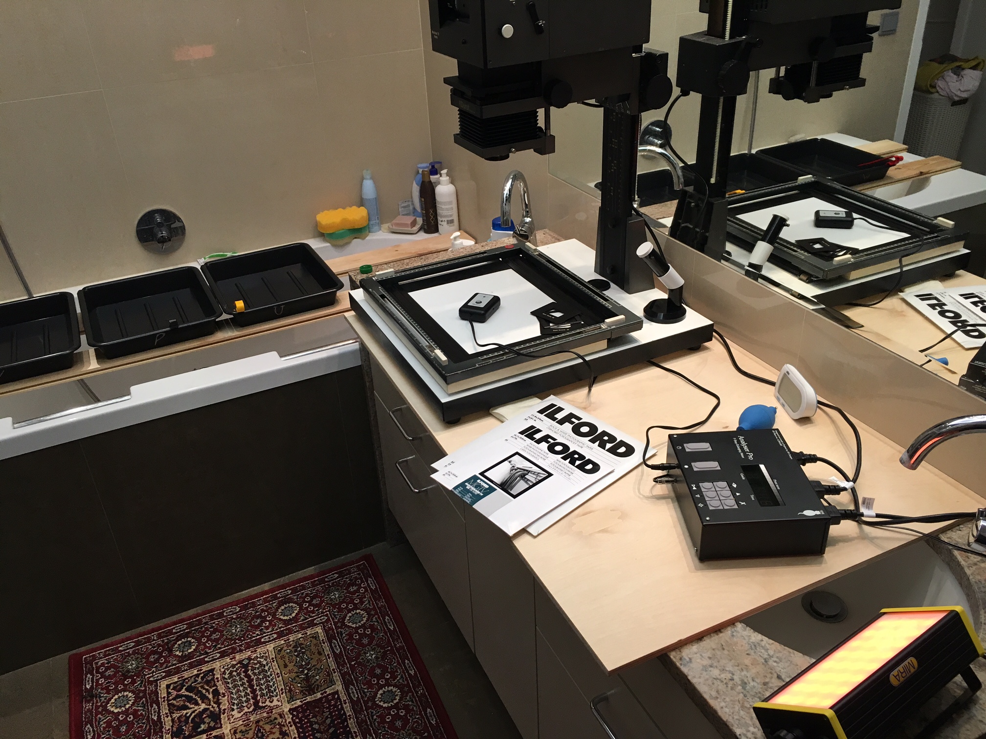 Nice use of space, Goros! The Novatech really helps to cut down on tray space. A couple of pieces of black card to the right of, and behind, the enlarger will reduce a bit of glare of the shiny white walls during exposure.