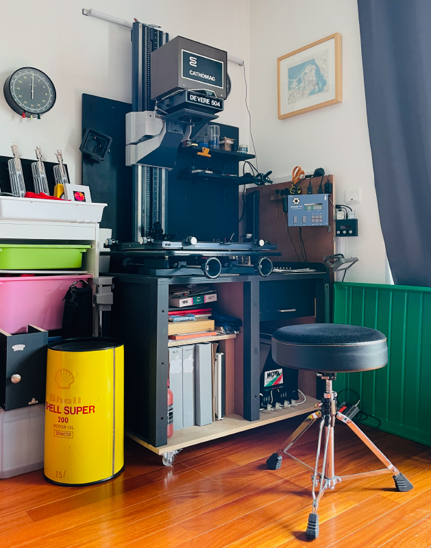 I’ve worked 15 plus years in this small space. Every aspect has been thought out to keep things simple. Everything is reachable from a seated position. The enlarger does not move. It takes me 15 min to make coffee, set up to print and cleanup. DR work is fun and satisfying. The key is to make the DR easy to use and comfortable to work in.