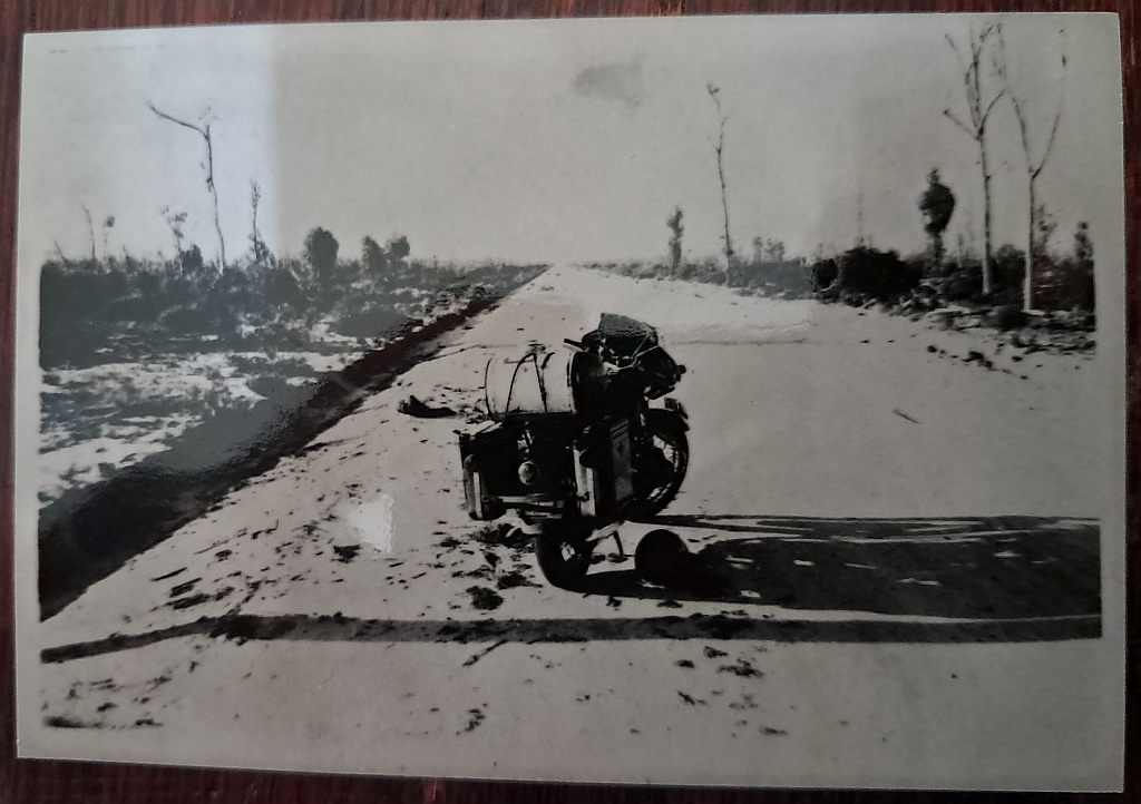 The next one, is a fuel stop on a longish trip. Strapped to the rear pillion seat is a 20 litre drum of fuel, which after the picture was taken, was removed and partially put into the motorcycle fuel tank. The roads here, although back then they were mostly really tracks, were extremely straight, with corners sometimes around 80km apart.