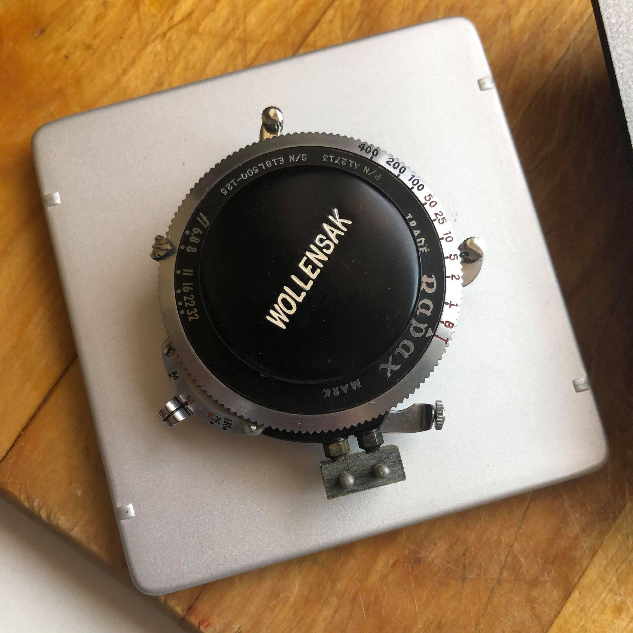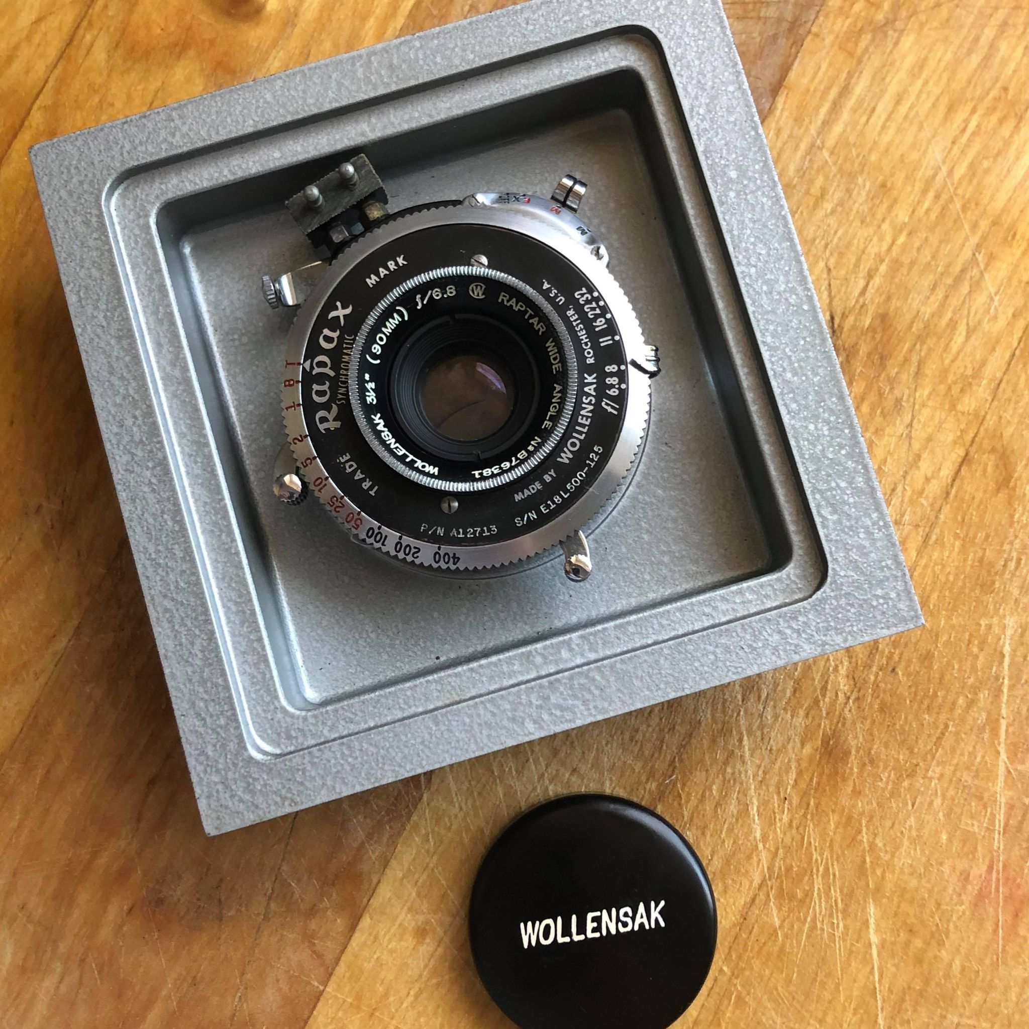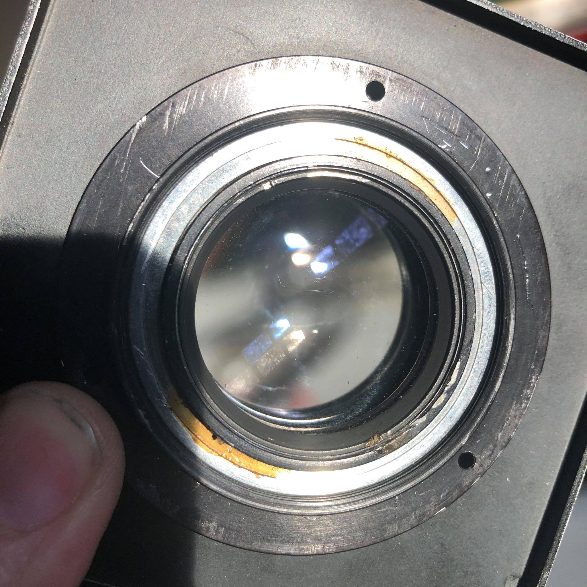 Also selling a pretty slick Wollensak 90mm f/6.8 lens in box. The box is probably the coolest part of the whole package. The lens is mounted on a recessed board. I’m also tossing in a standard Speed Graphic lens board if you want to give that a go. Glass looks good. Has some internal dust. Pretty easy to open up if you want to clean it, but doesn’t look like it would impact images to me.