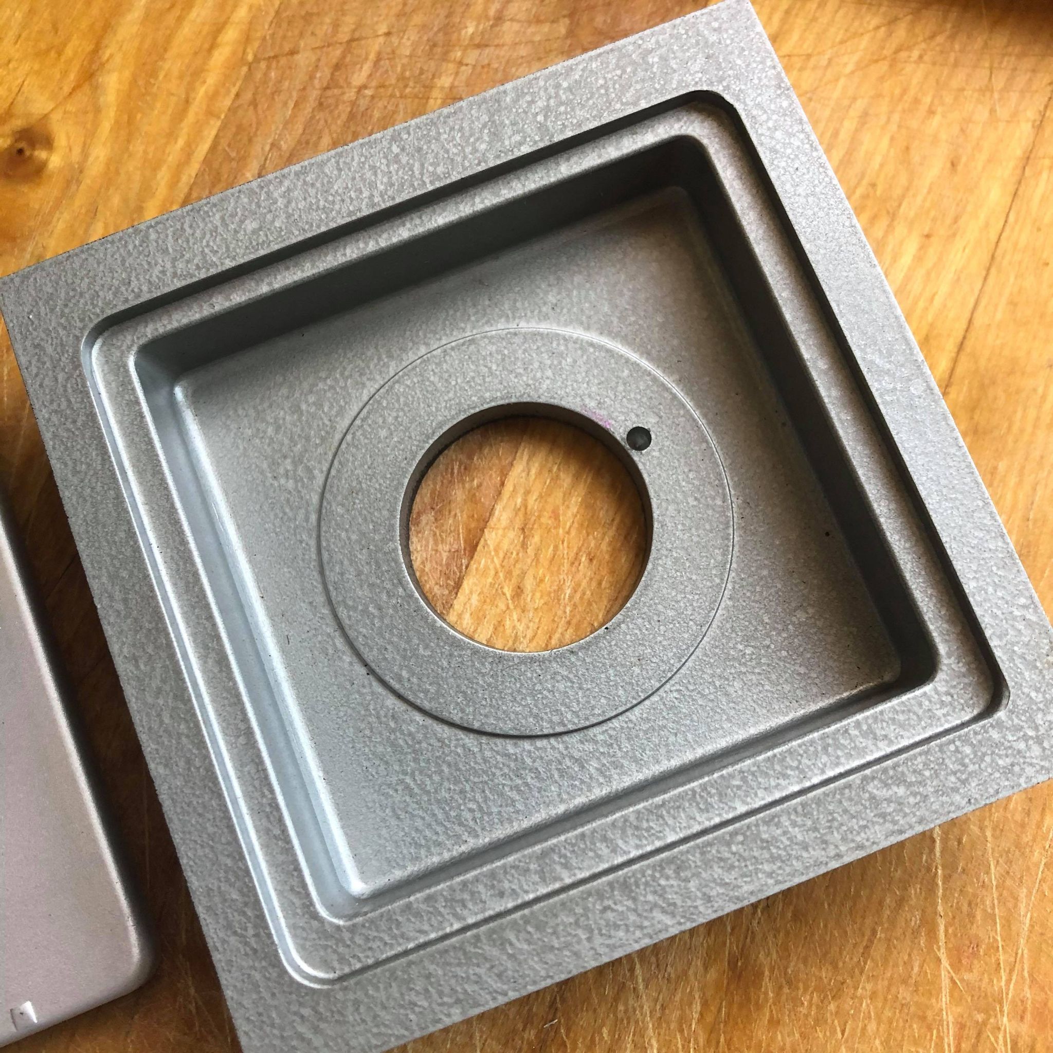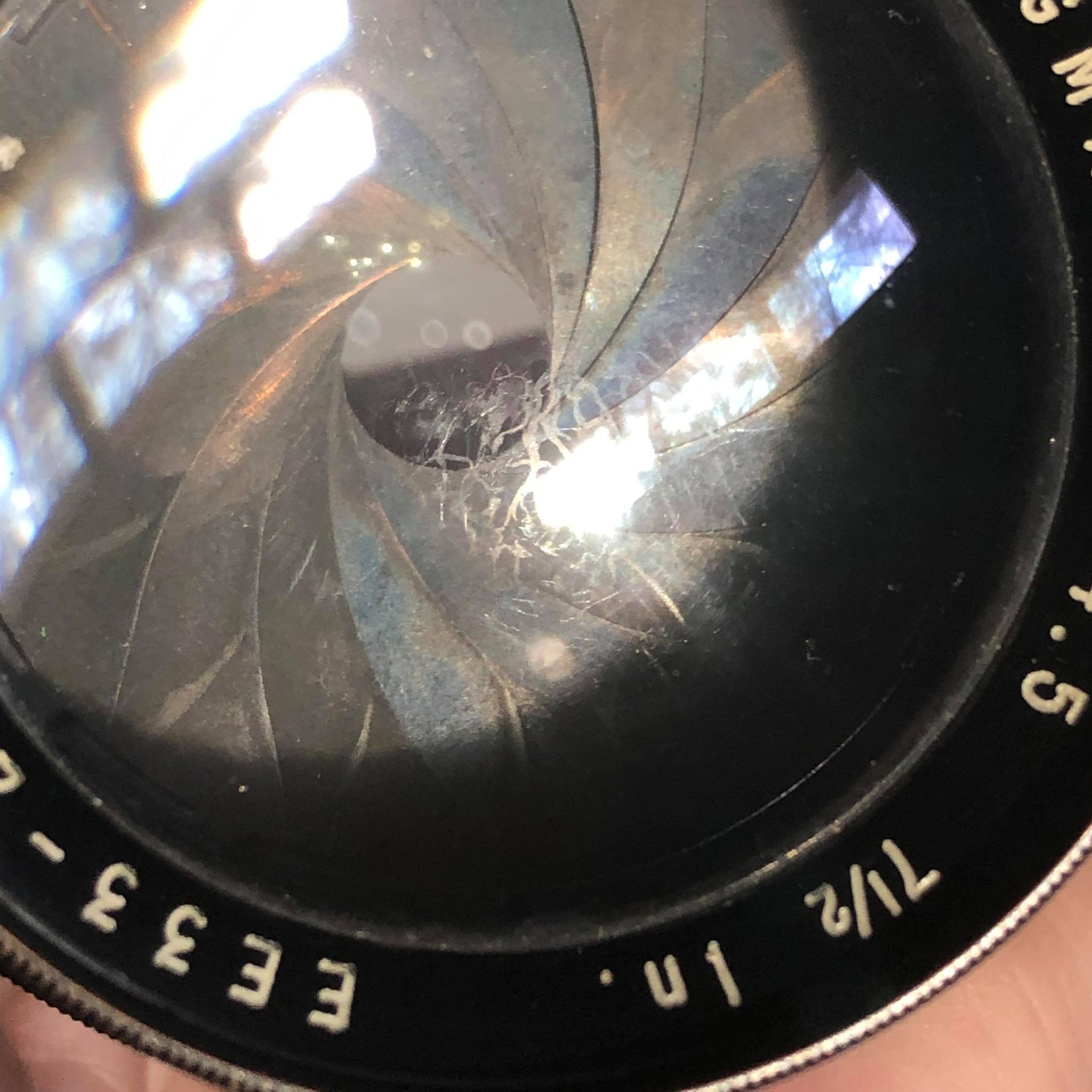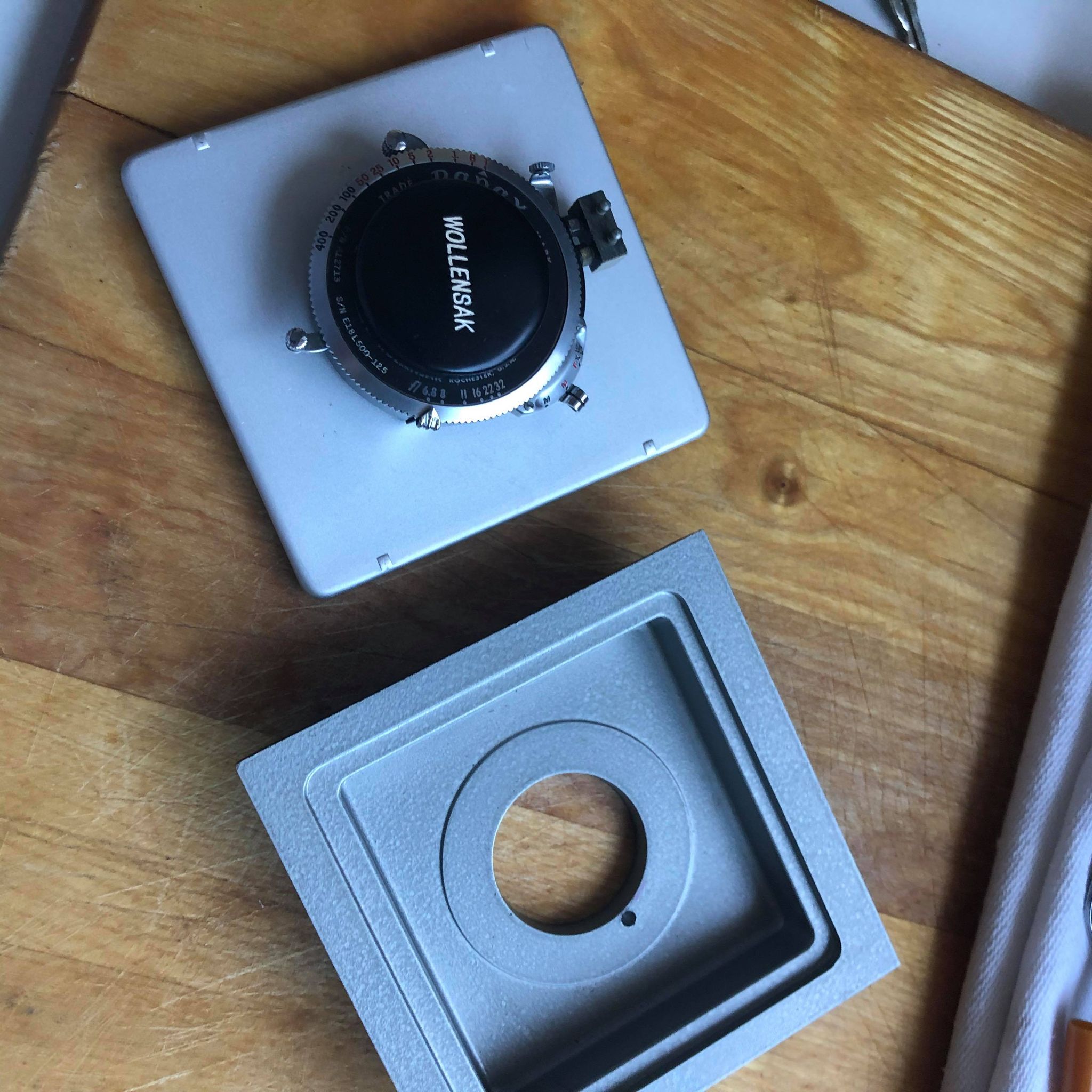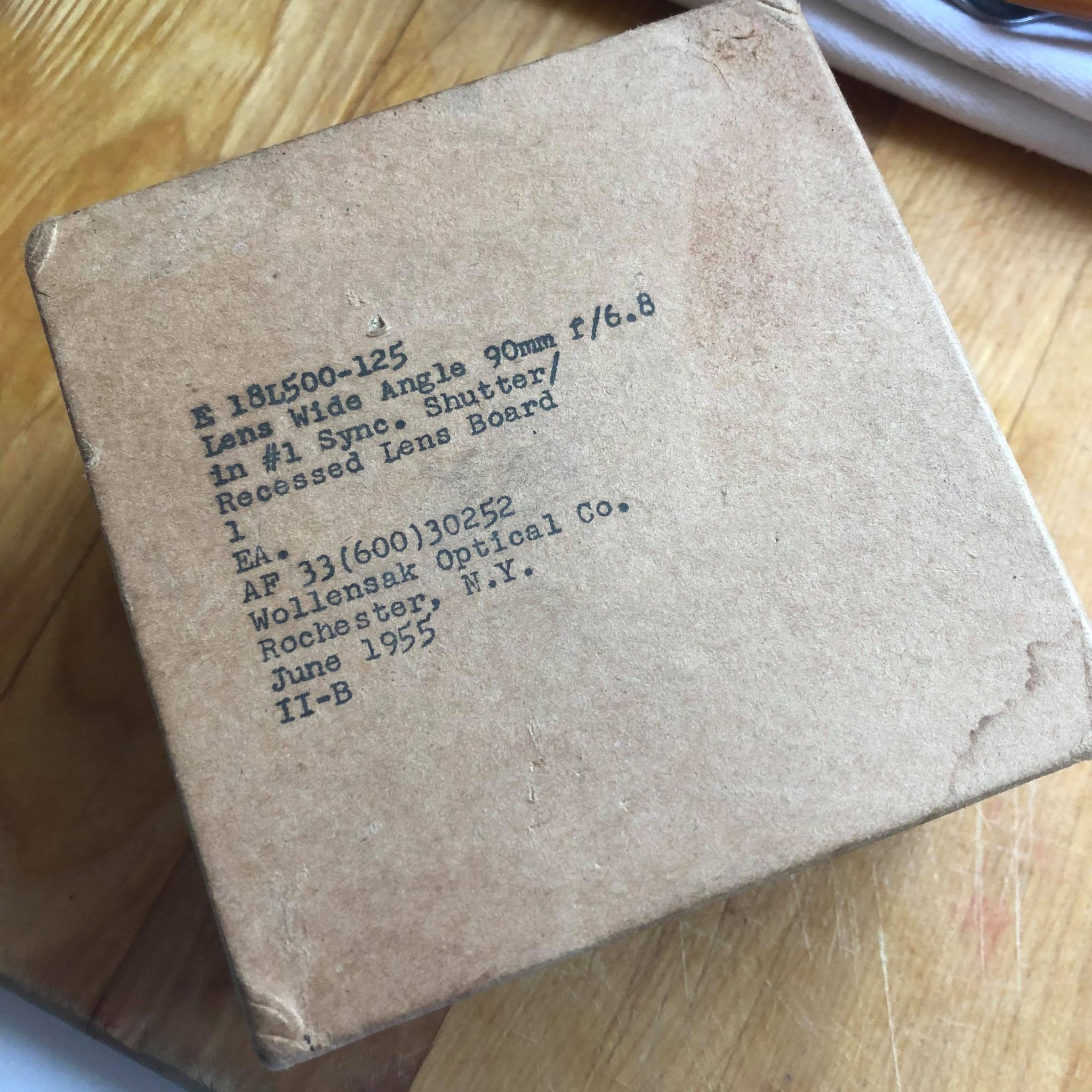 Also selling a pretty slick Wollensak 90mm f/6.8 lens in box. The box is probably the coolest part of the whole package. The lens is mounted on a recessed board. I’m also tossing in a standard Speed Graphic lens board if you want to give that a go. Glass looks good. Has some internal dust. Pretty easy to open up if you want to clean it, but doesn’t look like it would impact images to me.