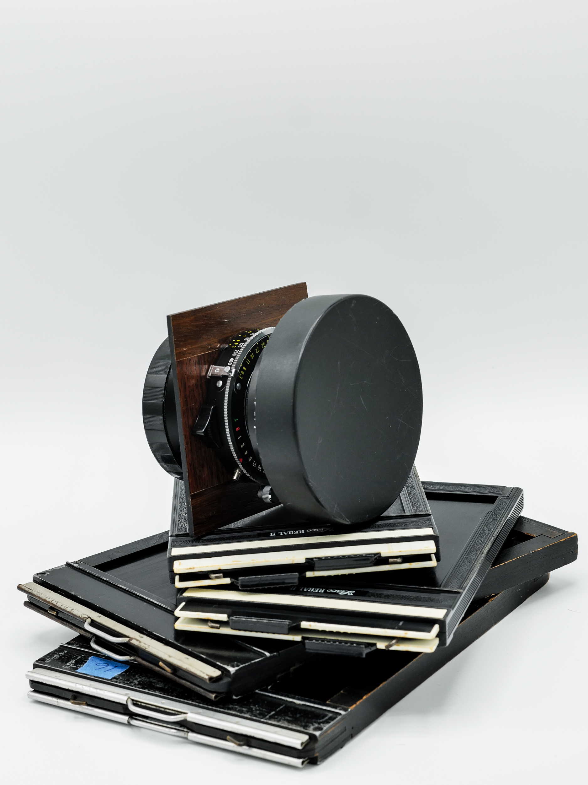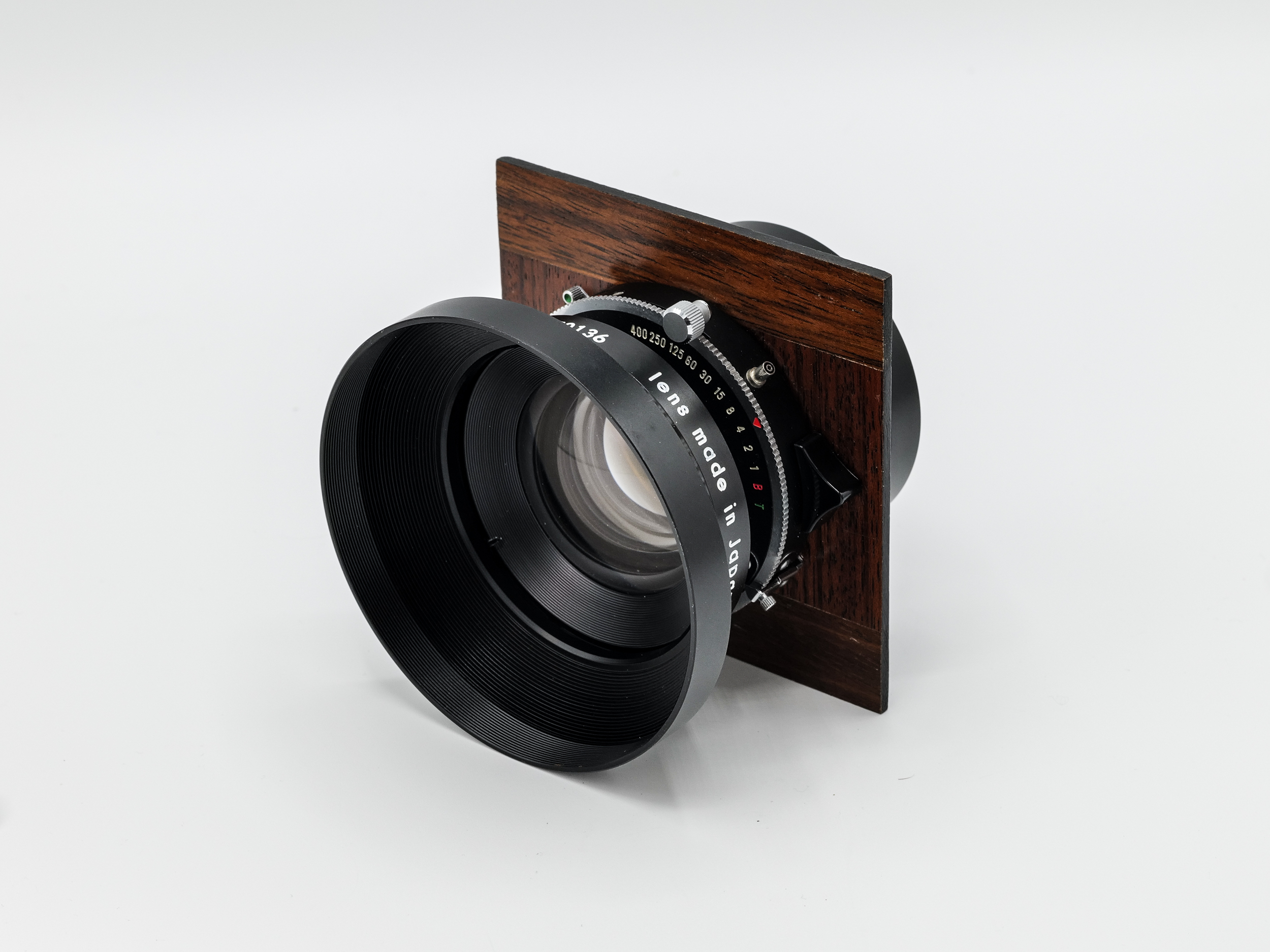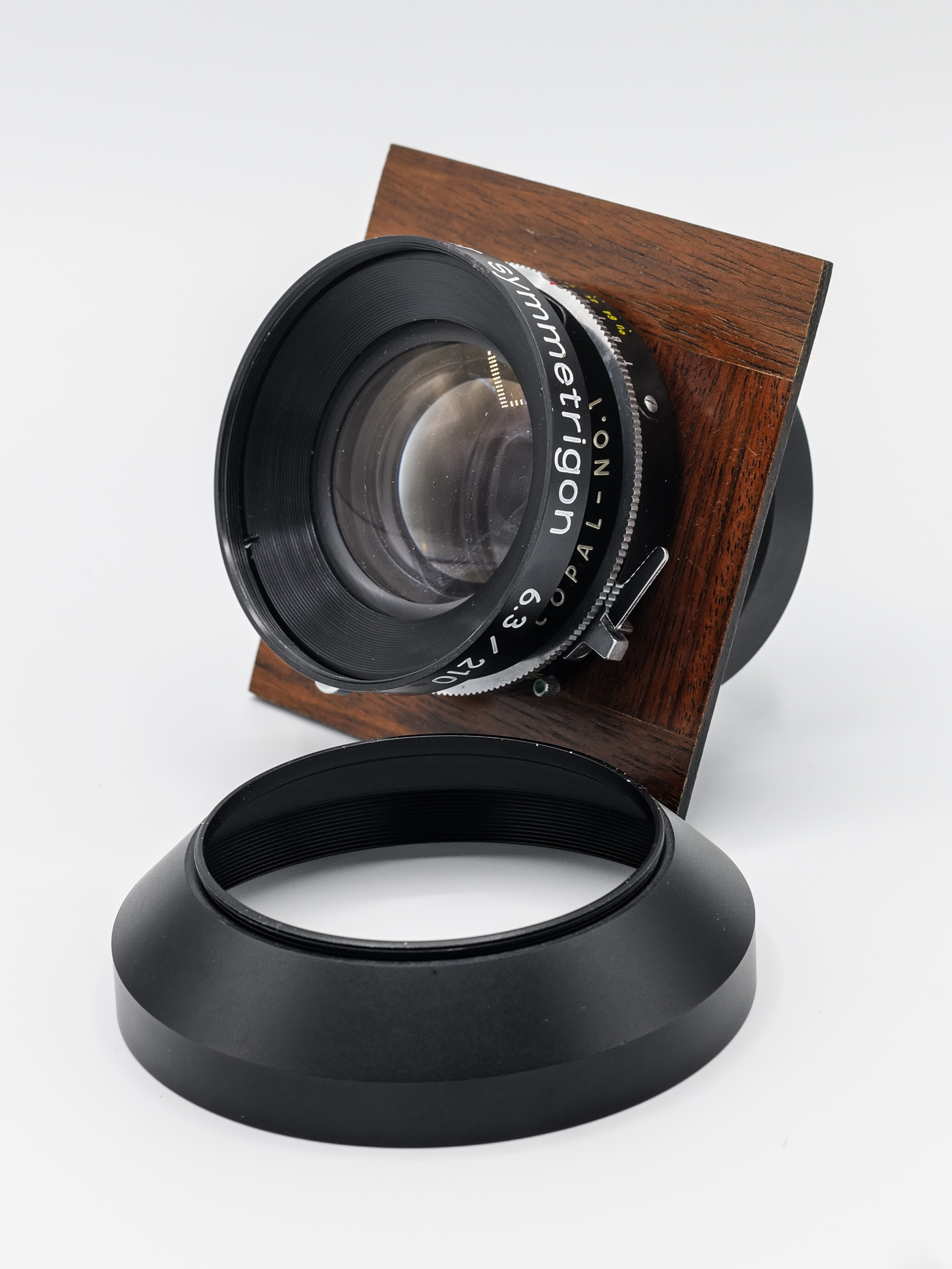 • 210 mm f/6.3 Computar Symmetrigon (This lens is a real sleeper) in shutter with its original factory metal shade, on a proper wooden Deardorff-style lens board