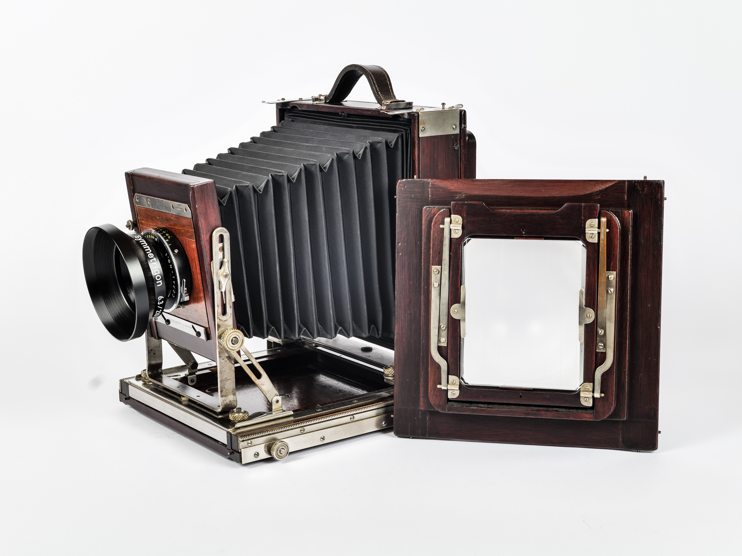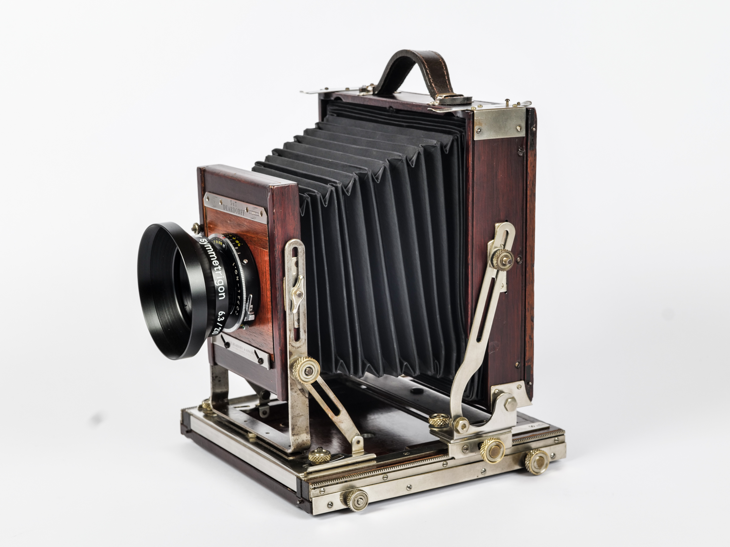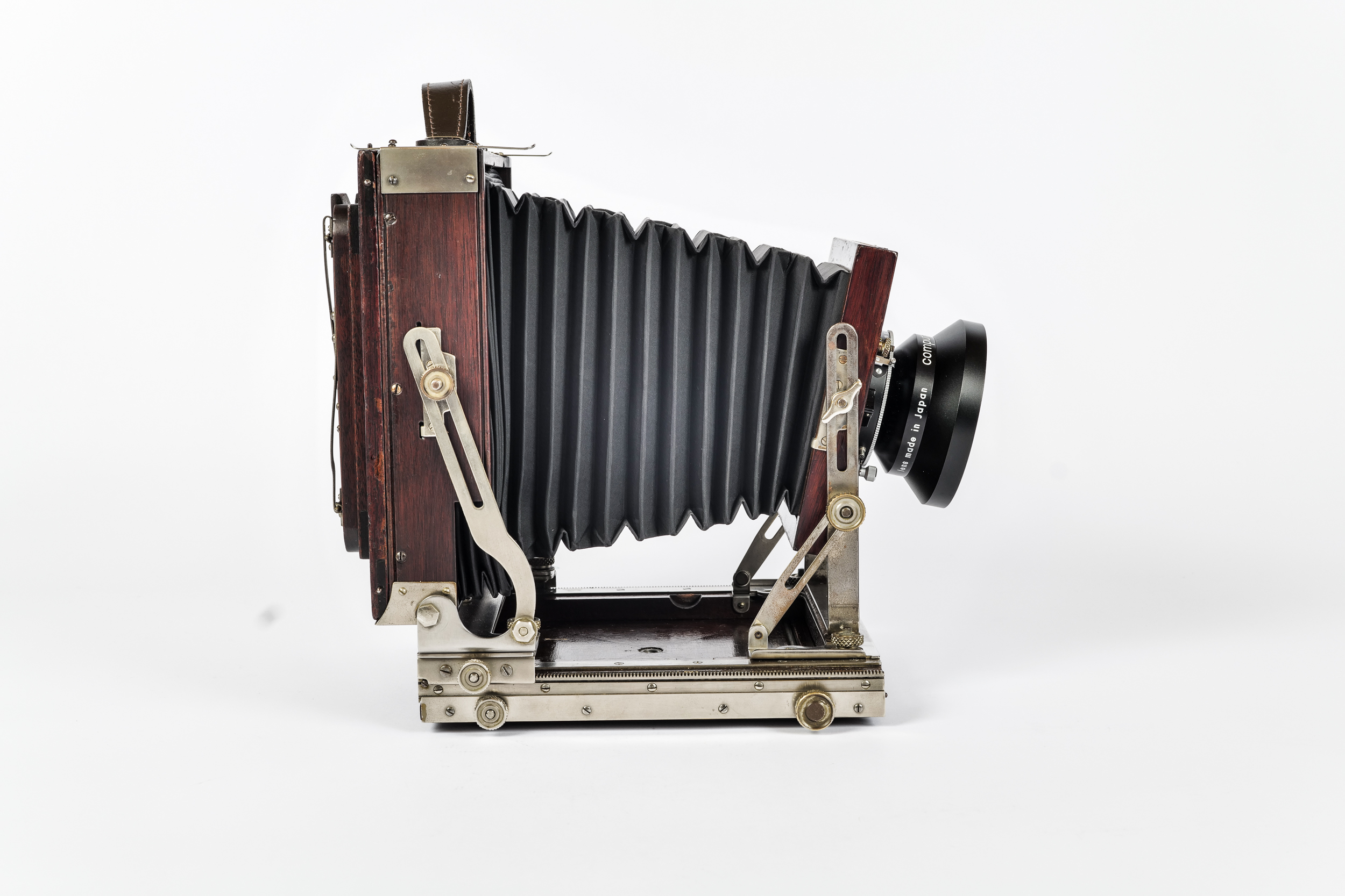 • 210 mm f/6.3 Computar Symmetrigon (This lens is a real sleeper) in shutter with its original factory metal shade, on a proper wooden Deardorff-style lens board