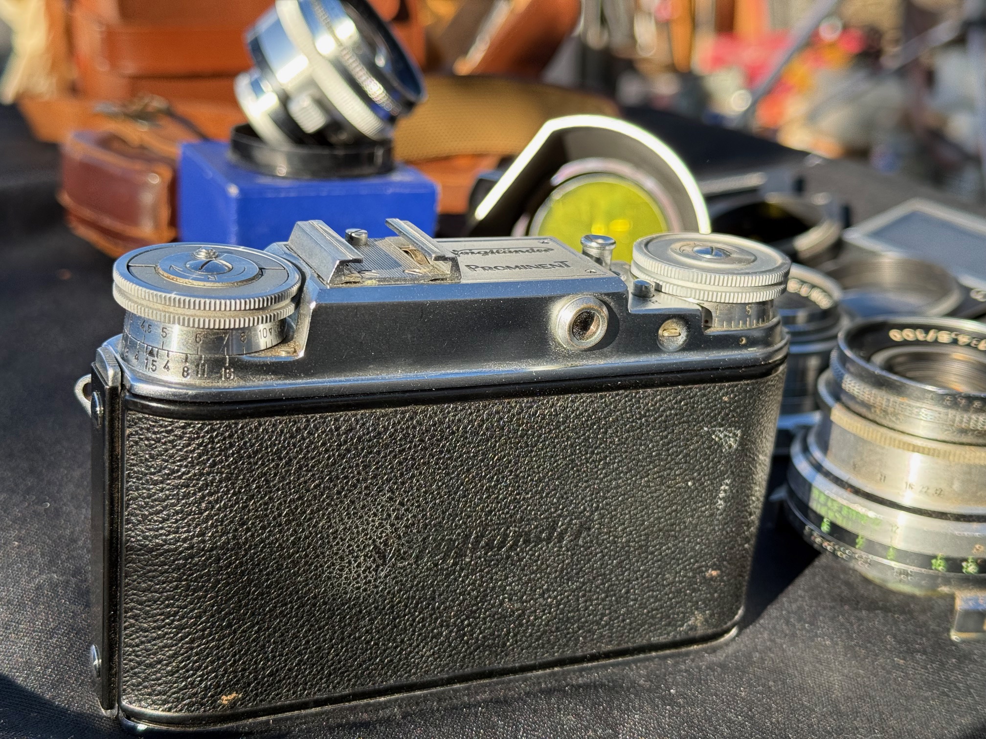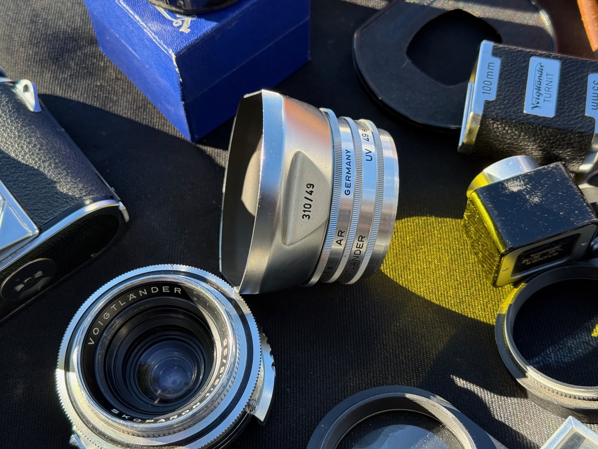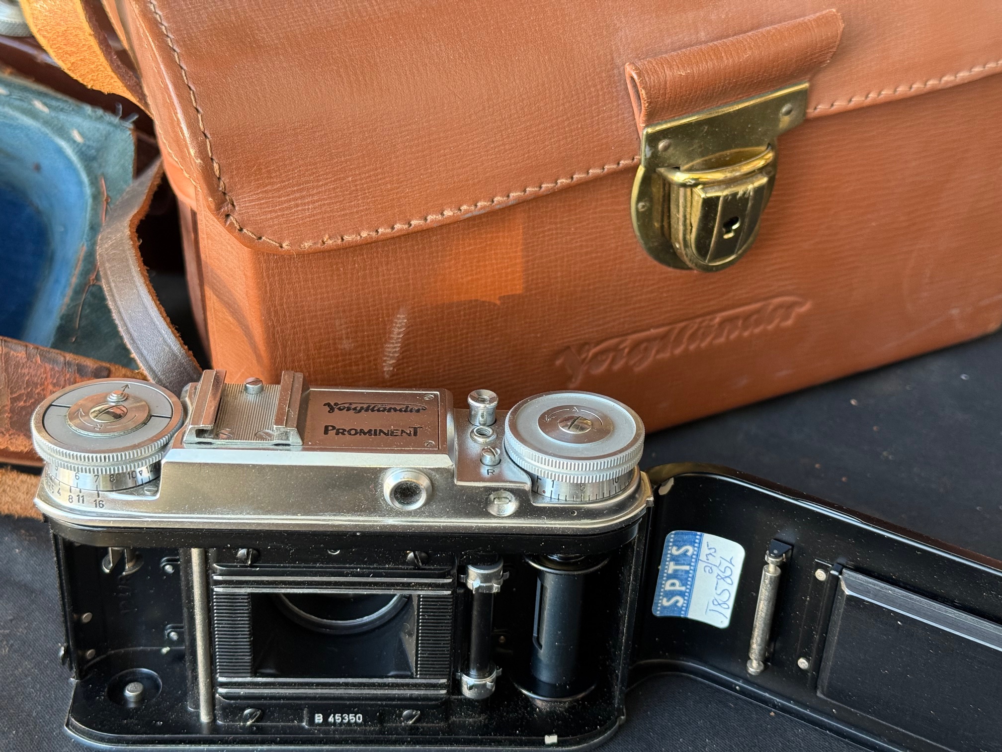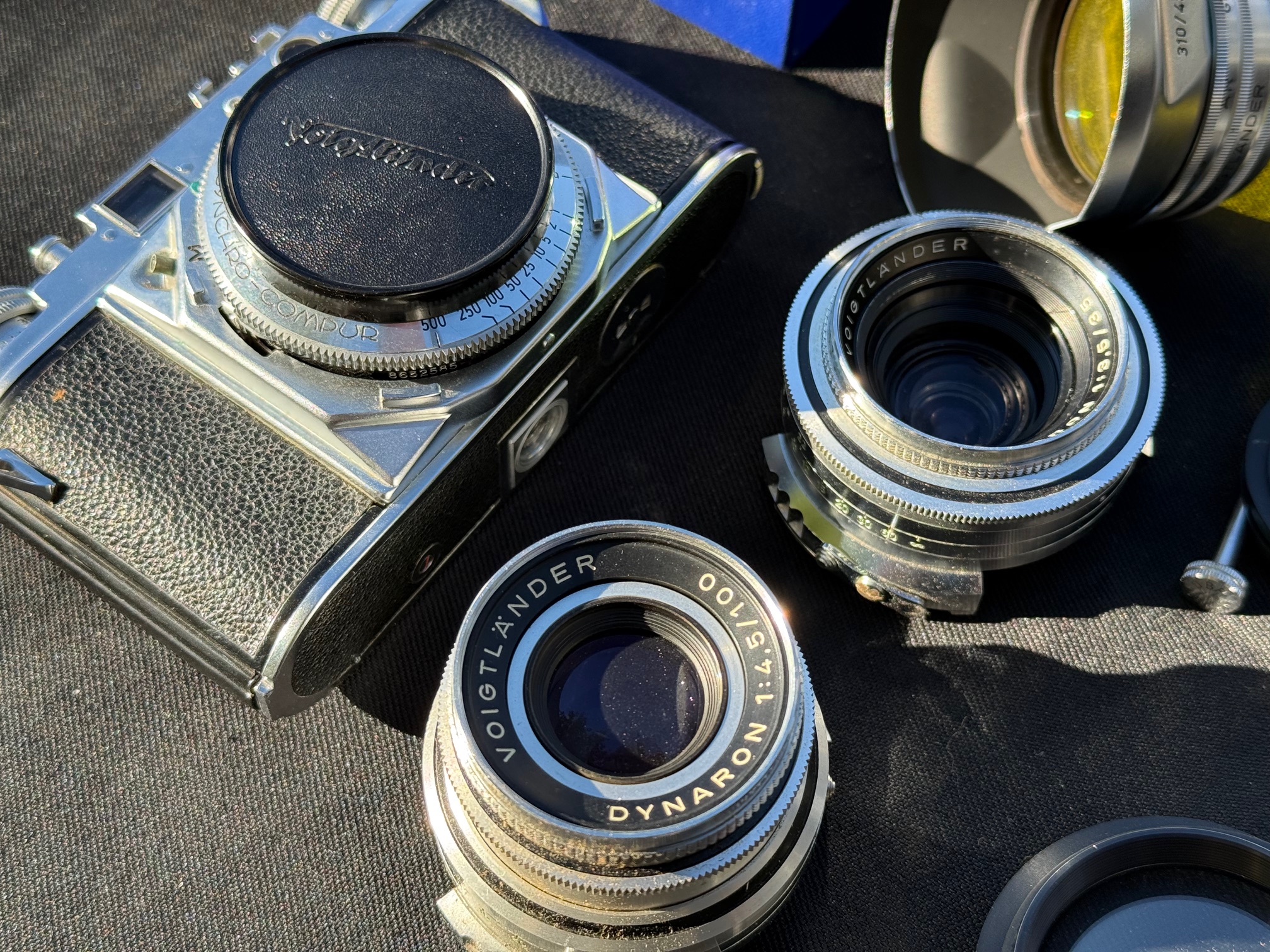 The Voigltander Prominent 35mm Rangefinder series Camera System was in neck to neck competition with Leica. These lenses are every bit as fine as Leica and some would say, they are better. Camera is in superb working condition with all accessories. Includes 35mm f3.5 Skoparon,, 50mm f1.5 Nokton & 100mm f4.5 Dynaron telephoto. Everything you see is included. TRADES. I'm a large format ~ soft focus guy. Open to interesting trades. Not going to miss a house payment, don't need to sell. Shipping is possible on your dime of course. Ask questions. The time delay feature on the shutter doesn't work but the shutter sounds great at all speeds. 1/2 second sounds like 1/2 second etc. Compur leaf shutter, not a curtain like the Leica.
