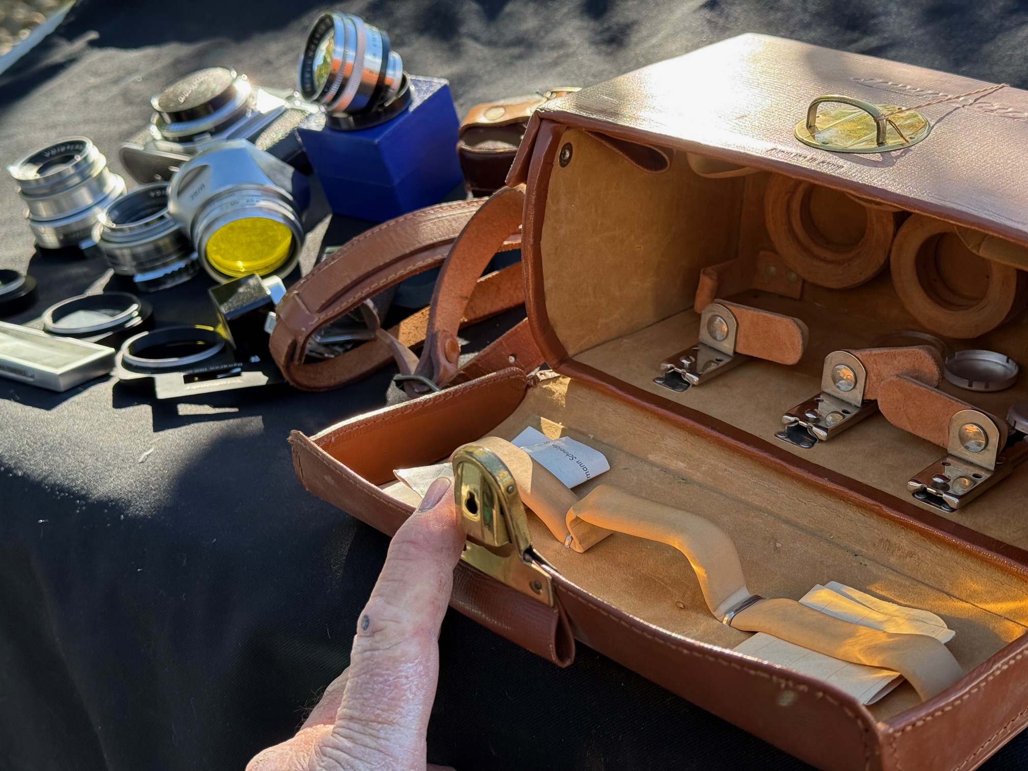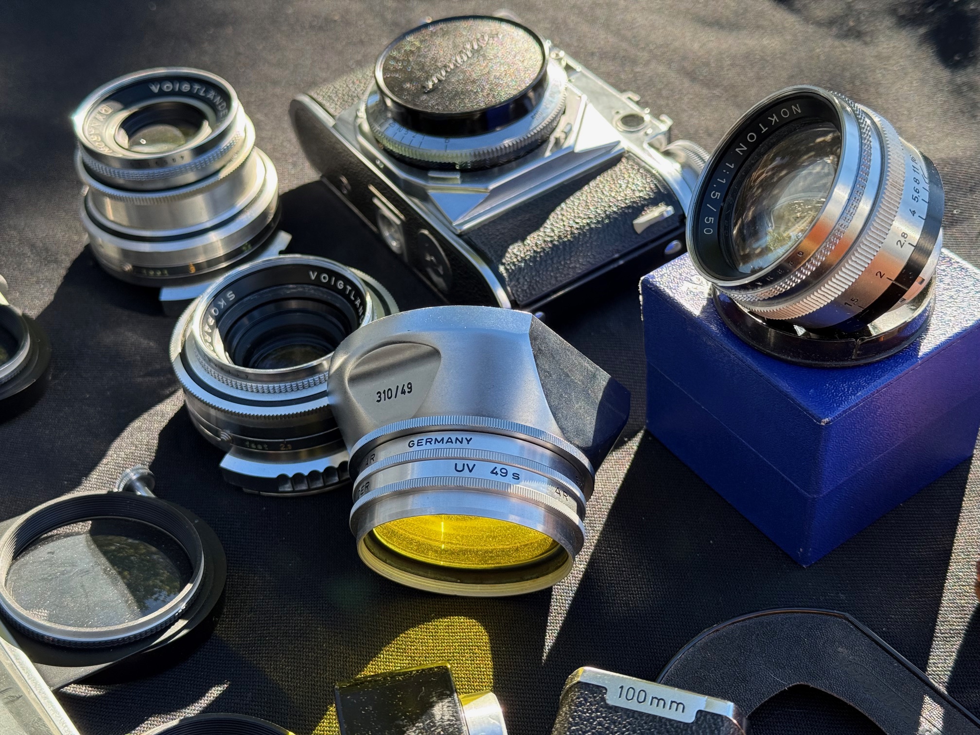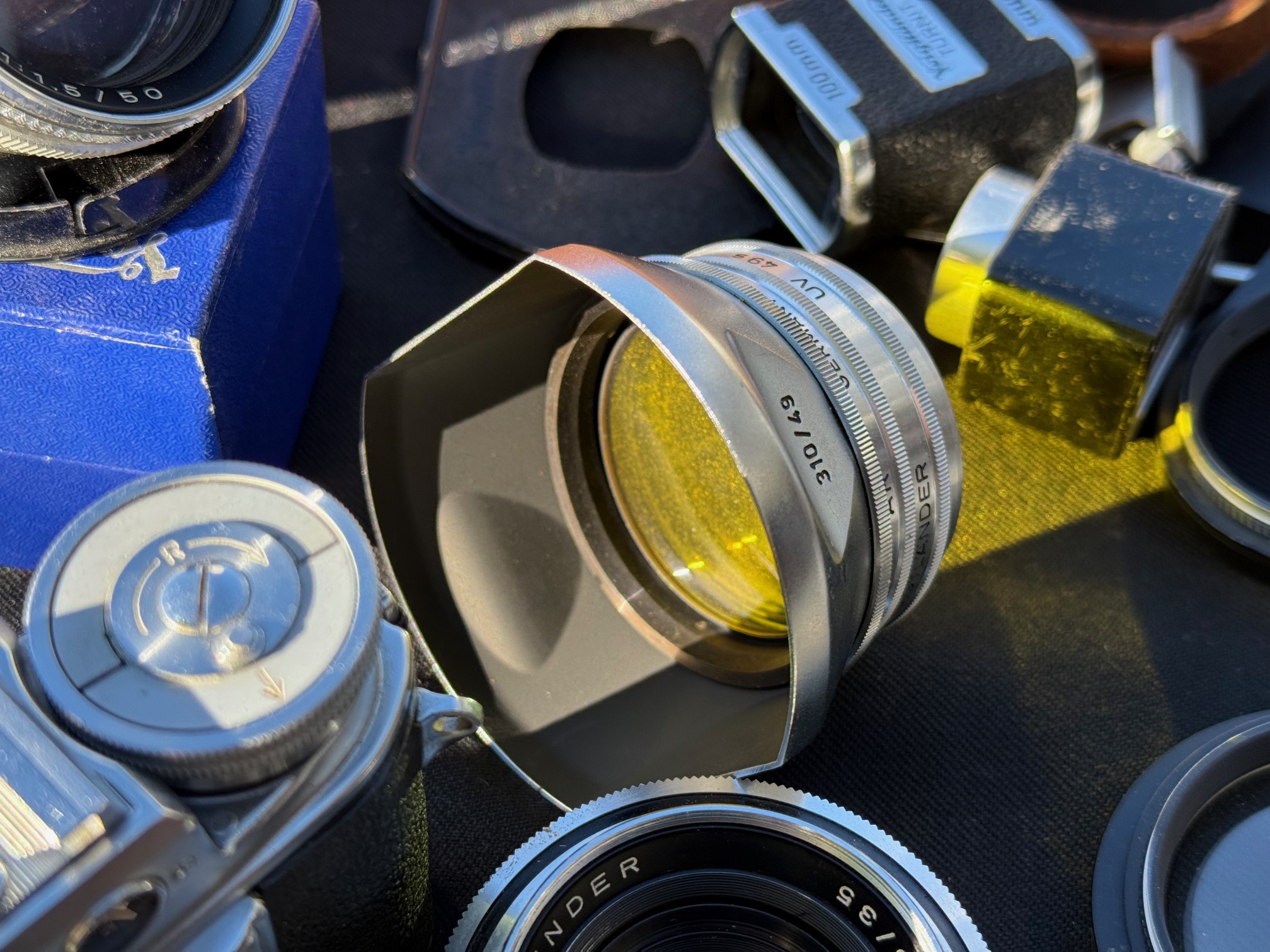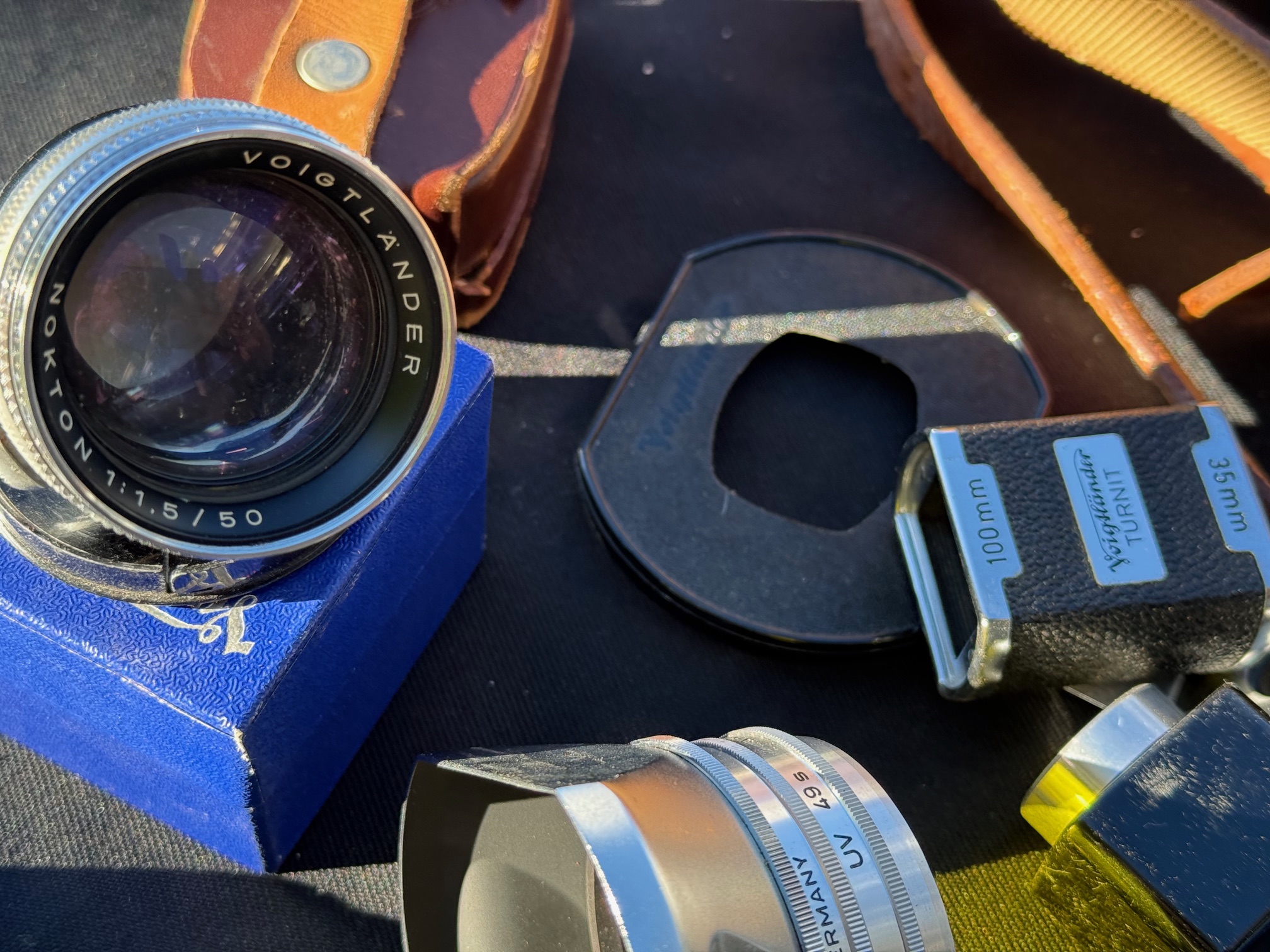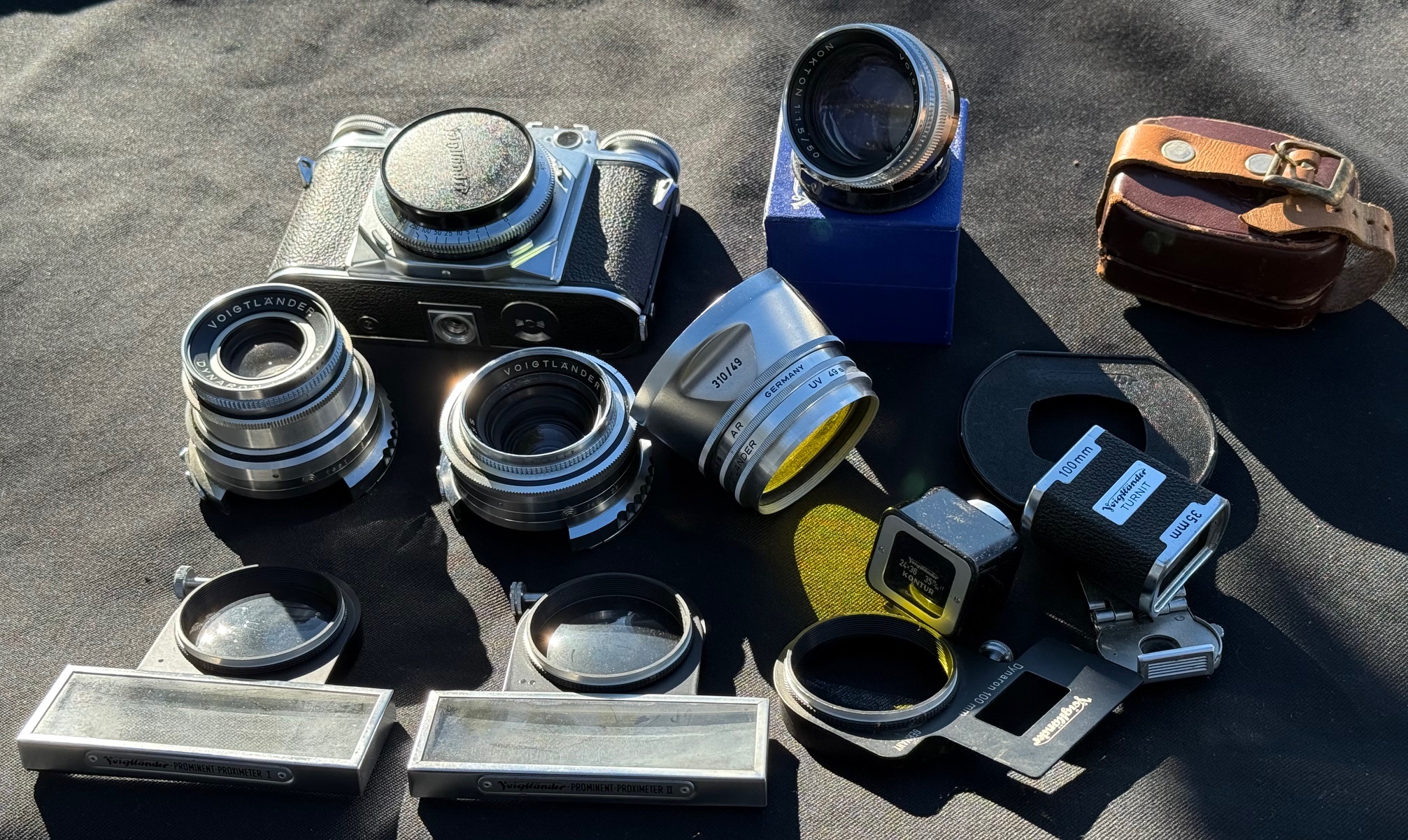 The Voigltander Prominent 35mm Rangefinder series Camera System was in neck to neck competition with Leica. These lenses are every bit as fine as Leica and some would say, they are better. Camera is in superb working condition with all accessories. Includes 35mm f3.5 Skoparon,, 50mm f1.5 Nokton & 100mm f4.5 Dynaron telephoto. Everything you see is included. TRADES. I'm a large format ~ soft focus guy. Open to interesting trades. Not going to miss a house payment, don't need to sell. Shipping is possible on your dime of course. Ask questions. The time delay feature on the shutter doesn't work but the shutter sounds great at all speeds. 1/2 second sounds like 1/2 second etc. Compur leaf shutter, not a curtain like the Leica.