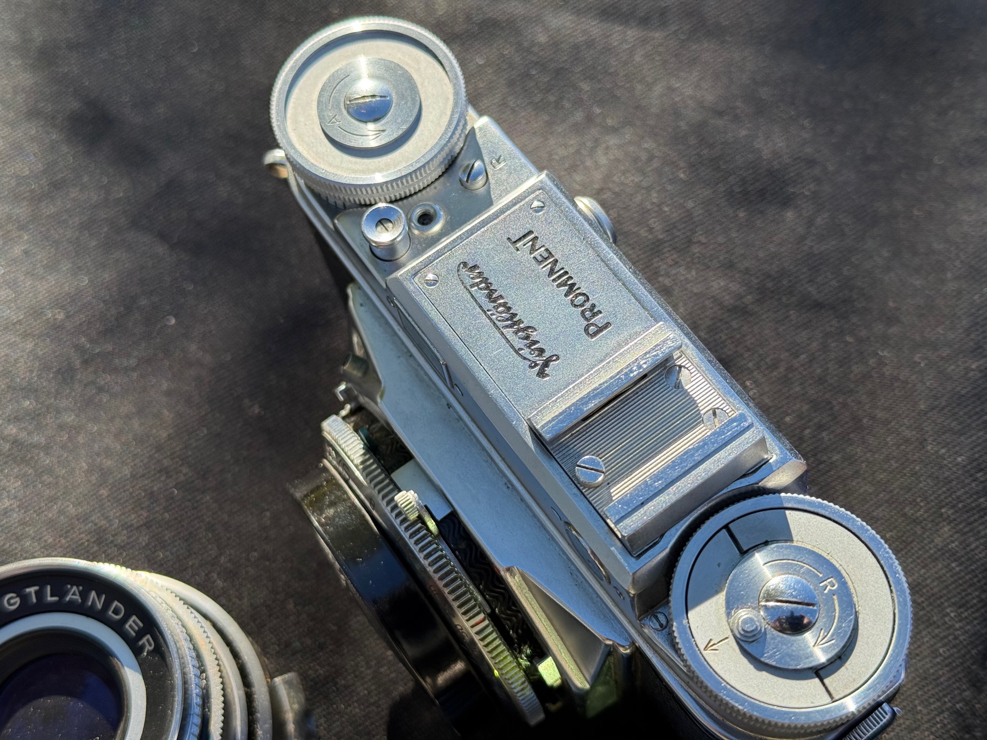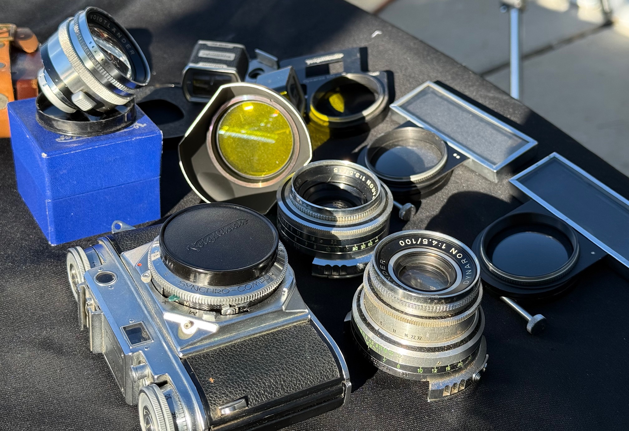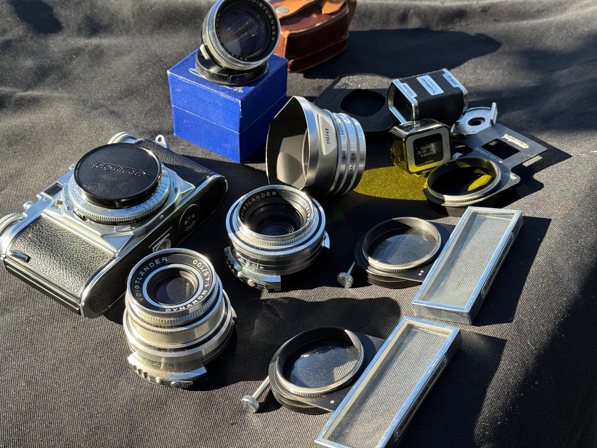 The Voigltander Prominent 35mm Rangefinder series Camera System was in neck to neck competition with Leica. These lenses are every bit as fine as Leica and some would say, they are better. Camera is in superb working condition with all accessories. Includes 35mm f3.5 Skoparon,, 50mm f1.5 Nokton & 100mm f4.5 Dynaron telephoto. Everything you see is included. TRADES. I'm a large format ~ soft focus guy. Open to interesting trades. Not going to miss a house payment, don't need to sell. Shipping is possible on your dime of course. Ask questions. The time delay feature on the shutter doesn't work but the shutter sounds great at all speeds. 1/2 second sounds like 1/2 second etc. Compur leaf shutter, not a curtain like the Leica.