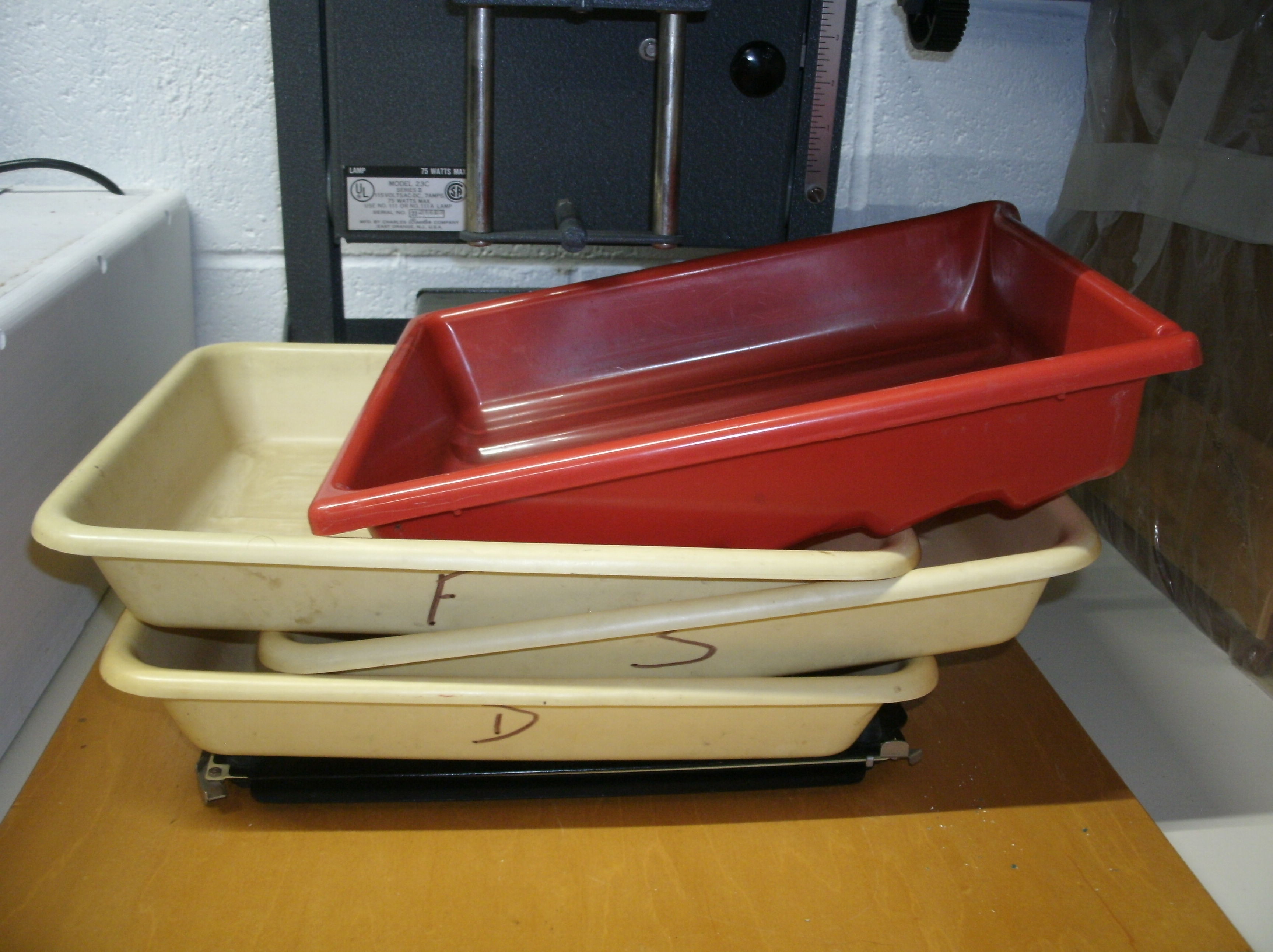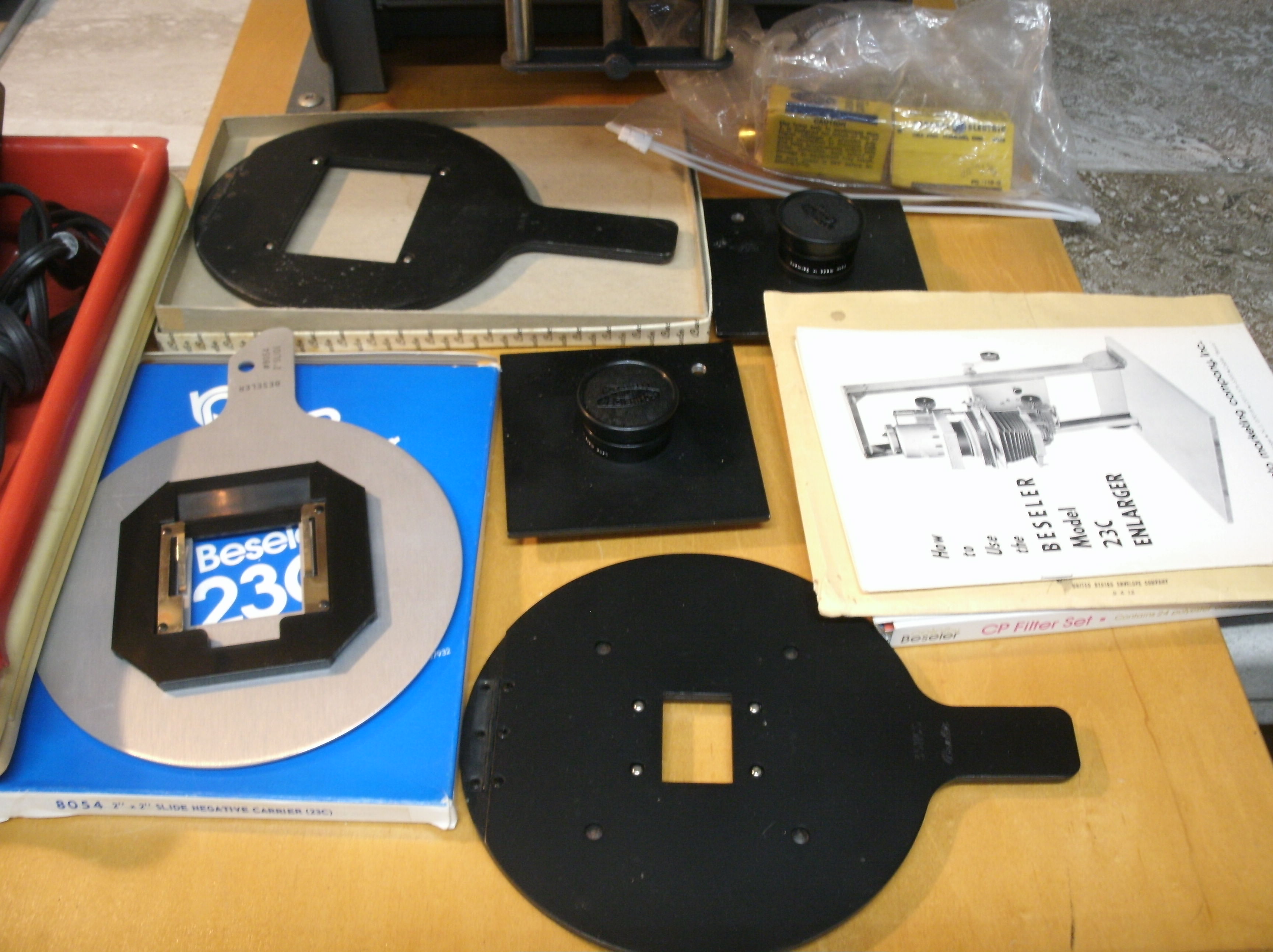 Well kept 23c enlarger for 35mm up to 6x9cm negatives. includes everything you see, timer, trays, neg carriers for 35mm, 2x2 mounted slide, 6x9 , 50mm and 105mm Schneider lenses on lensboards, owners manual, contrast filters, extra light bulbs. Enlarger has filter drawer, heat absorbing glass installed, red filter mounted under lens. Includes a set of 8x10 trays and an enlarging easel, plus a safelight.
