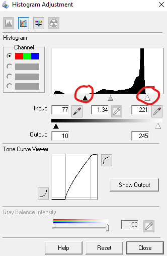 Alternatively, if you prefer to scan as a B&W negative in Epson scan so you get an inverted/positive image output directly: after doing a pre-scan and selecting the negative area to be scanned, go into the Histogram adjustment dialog: