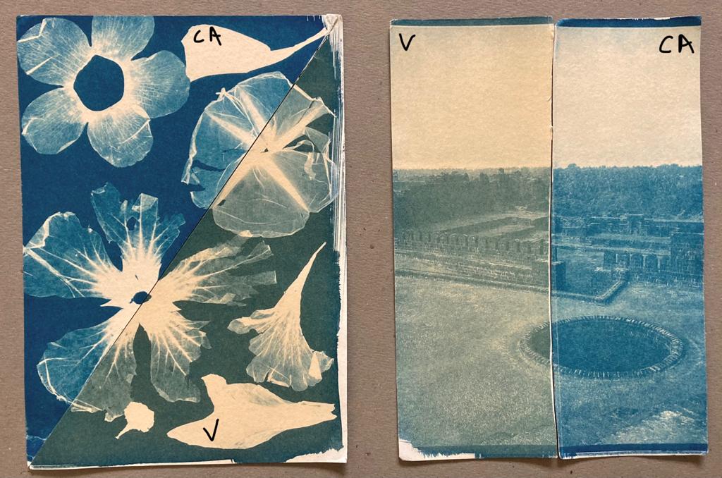 Other than that the print at this stage looks very much normal. Lightest where there is minimal exposure, turning green with some exposure, then on to blueish with some more and finally turning gray with maximum exposure where there is no coverage by the feathers. The last stage is called "solarization" where some of the Prussian blue gets photo-reduced to Prussian white making it revert from the blue tone to more neutral one. When you are exposing in the Sun, you can judge the correct exposure by looking at the shadows of the print and allow the exposure to proceed just past where the shadows start looking lighter/grayish than the mid-tones. This Prussian white gets oxidized back to Prussian blue as you leave it in air or by hydrogen peroxide treatment.