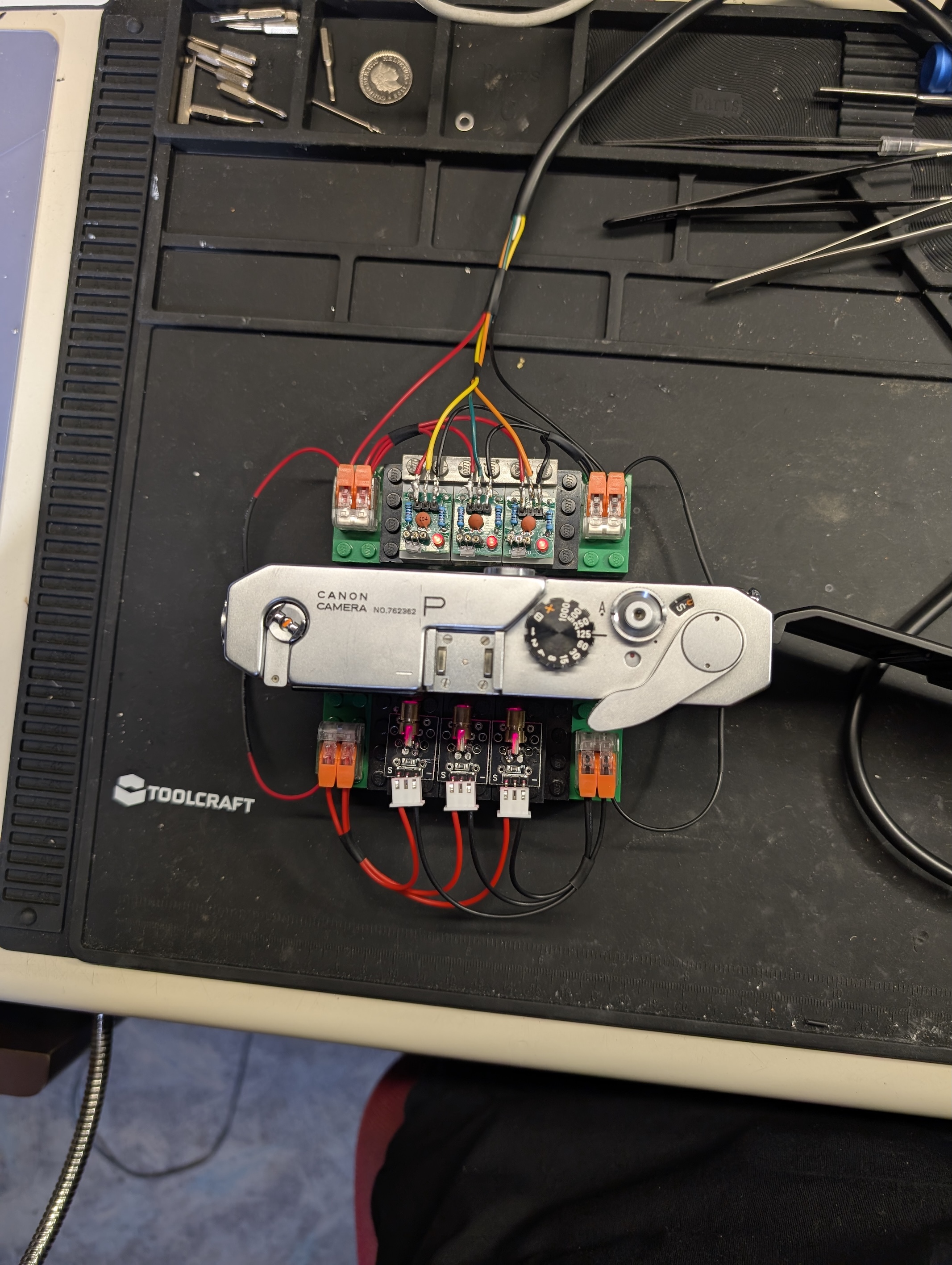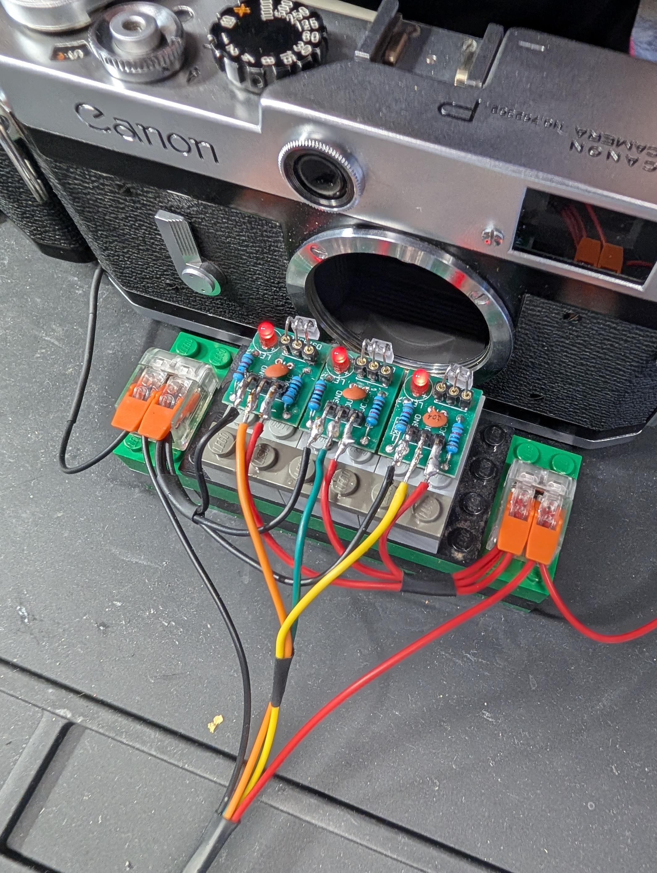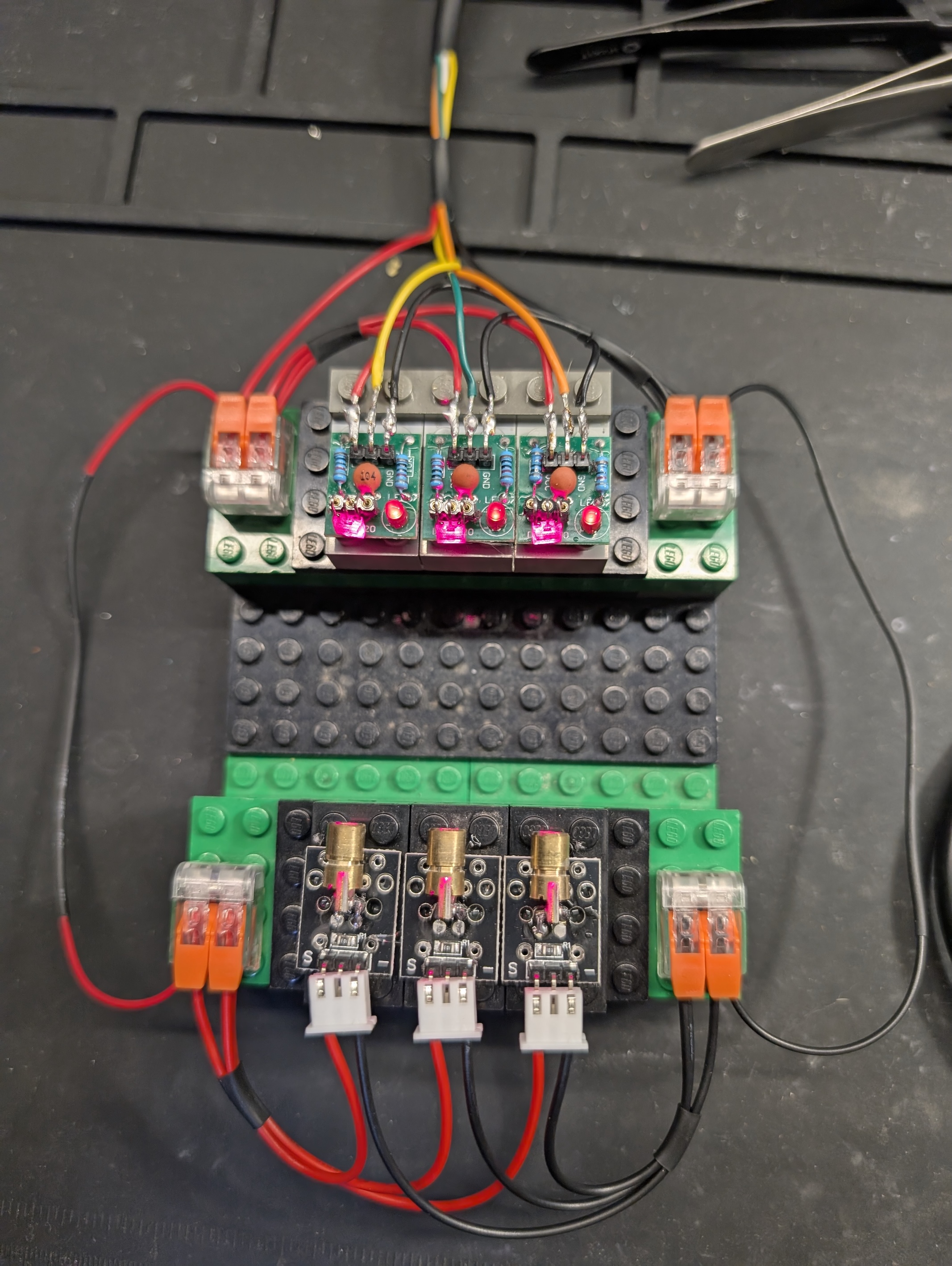 I listened to Niglyn's advice and aligned the lasers horizontally, not diagonally (I don't have a camera that works with a vertical shutter anyway). I used lego and hot glue to do this. I used connector blocks for the black and red wires. I also bent the sensors so that the little diode faces the outside of the board, which helps with the wiring.