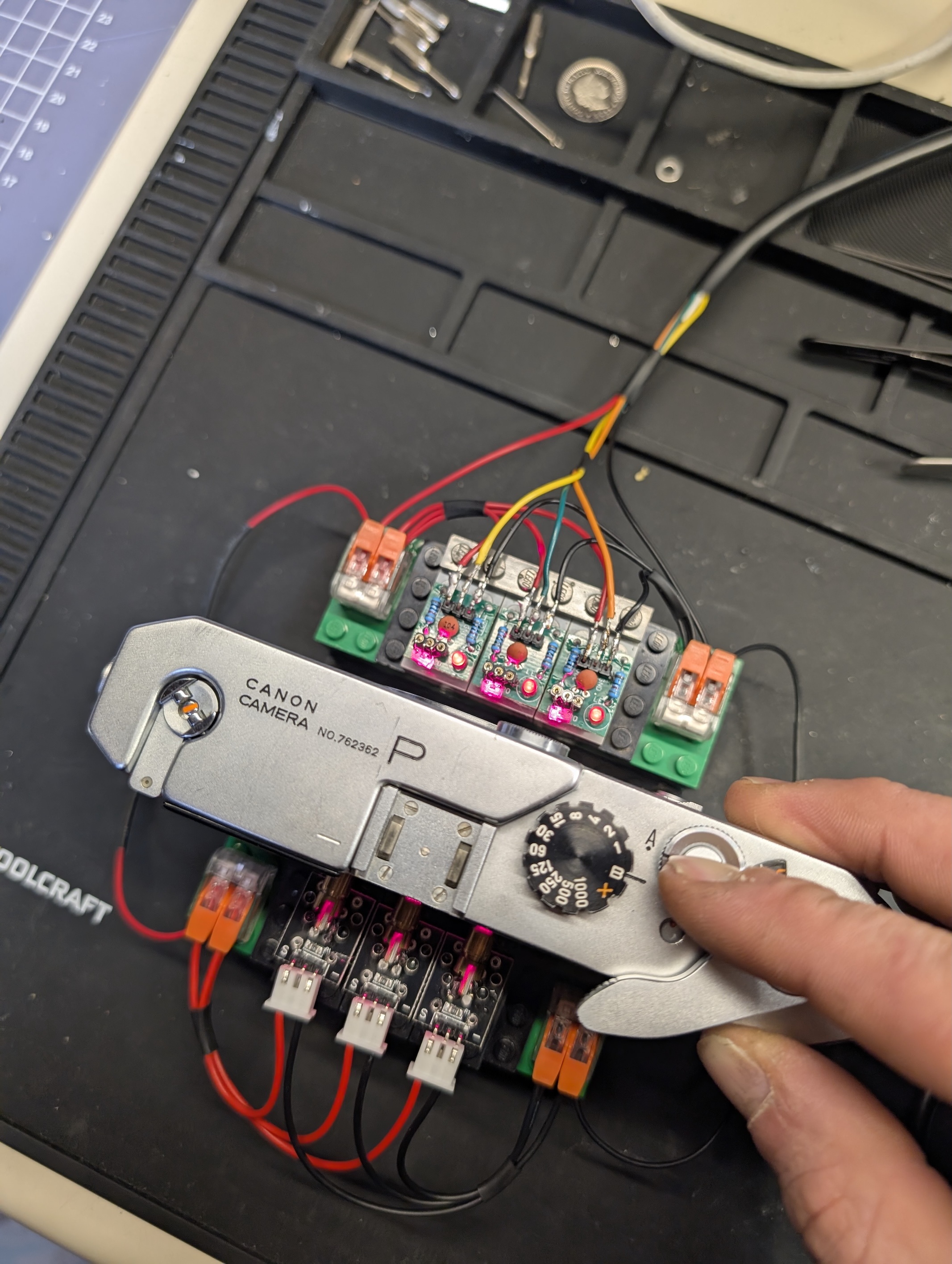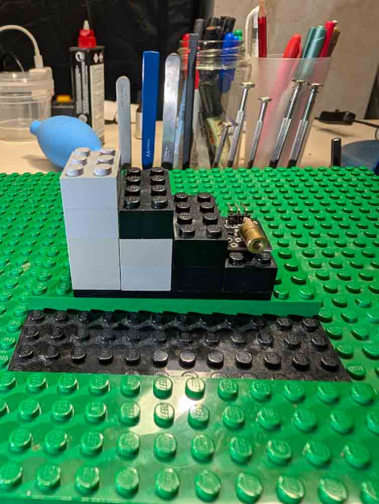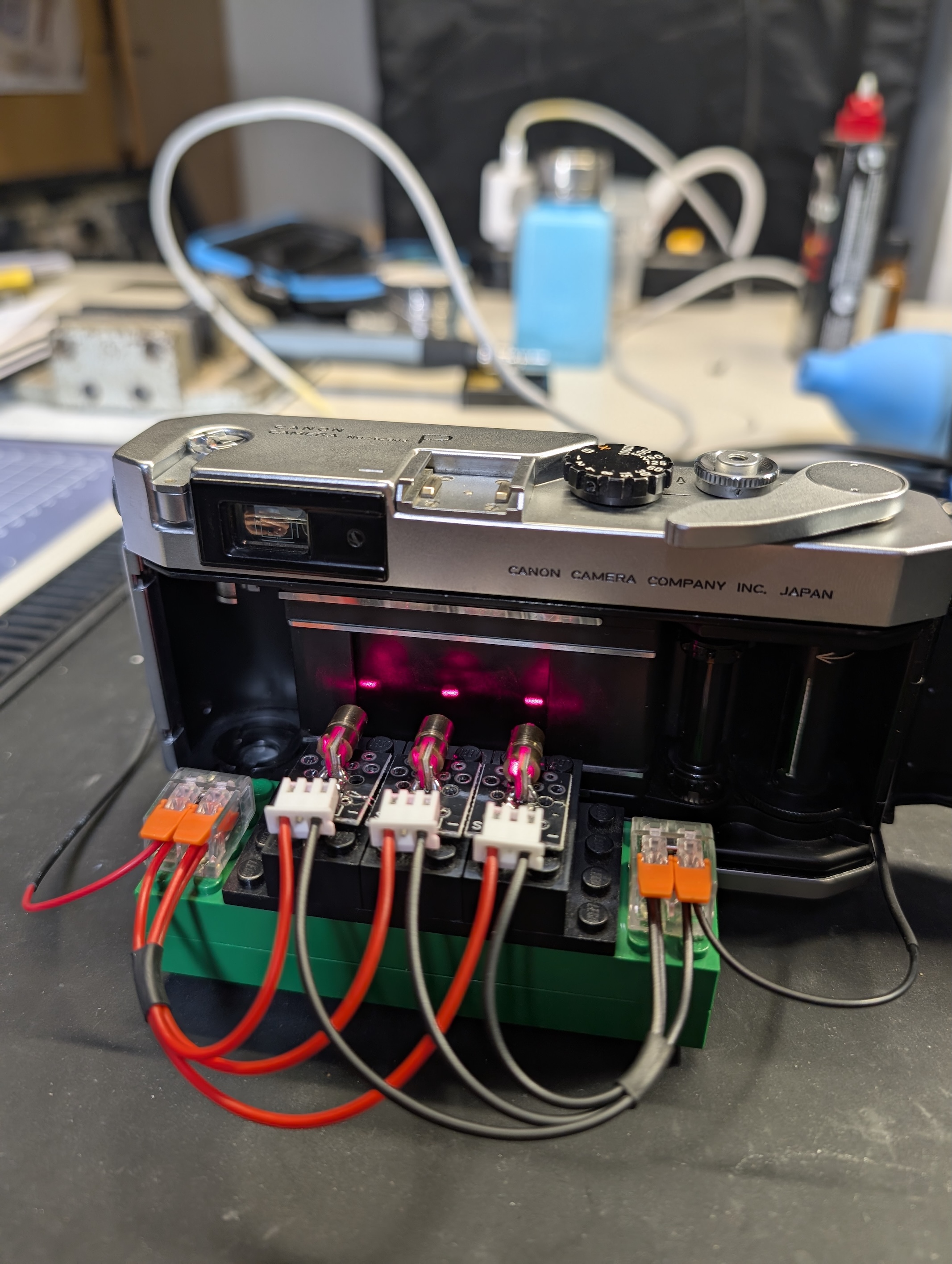 I listened to Niglyn's advice and aligned the lasers horizontally, not diagonally (I don't have a camera that works with a vertical shutter anyway). I used lego and hot glue to do this. I used connector blocks for the black and red wires. I also bent the sensors so that the little diode faces the outside of the board, which helps with the wiring.