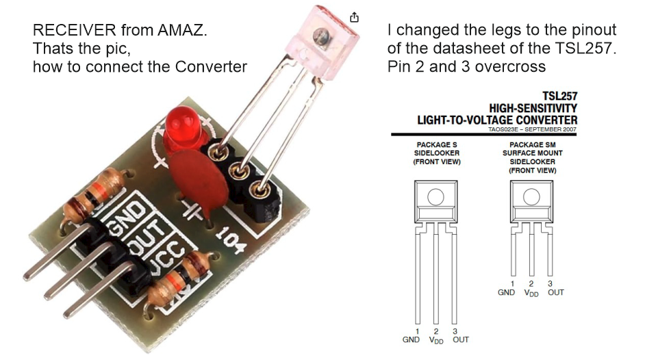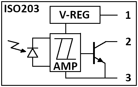 Der Sensor selbst ist ein ISO203, wie unten gezeigt. Er enthält eine optische Linse, einen Spannungsregler, einen Lichtsensor, einen Verstärker und einen Schaltausgang.