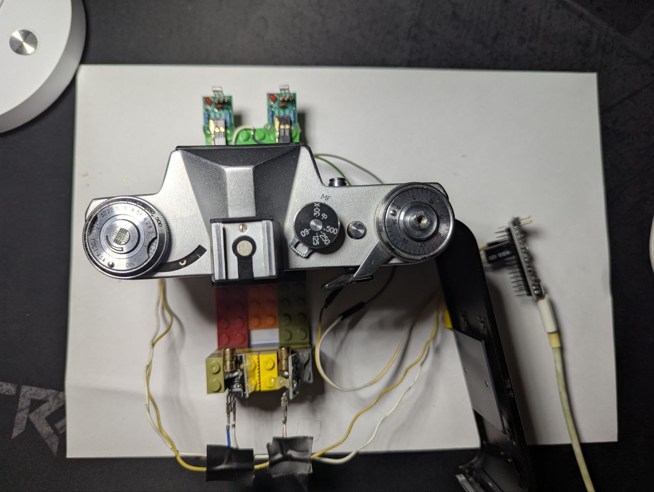 Hi Niglyn! I got my dad's Zenit-E film camera. I replaced the shutter curtains and curtain wires. It's mechanically sound. I'm looking for a way to adjust the shutter speed. I came across your project on GitHub and built myself a tester out of Lego. I downloaded the firmware, but it's asking for the code. Could you share it? I'm attaching a photo of the project and the camera.