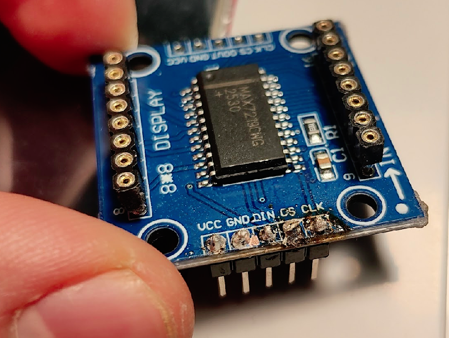 I'm currently working on an ESP32 shutter tester. Despite the fact that the main computer is working perfectly, I am having serious issues with the light meter and the optical shutter tester (LED matrix) (MAX7219CWG 2530+). The matrix has shown signs of a bad connection, as it hasn't worked properly (sometimes random LEDs were flashing). I only managed to turn it on properly once. I decided to fix the connections on the matrix board and resolder the connections with the DIN connector, but suddenly the matrix started turning off the whole system (it needs resetting, and then everything works smoothly). The case with the light meter module is different because the ESP can't read it. Even during the system's boot process, it says that the BH1750 is not connected. Everything has been checked with an electronic multimeter, and there are no short circuits, and both the matrix and the light meter connections are good.