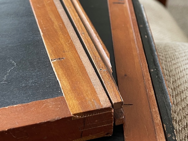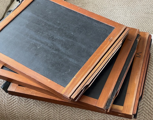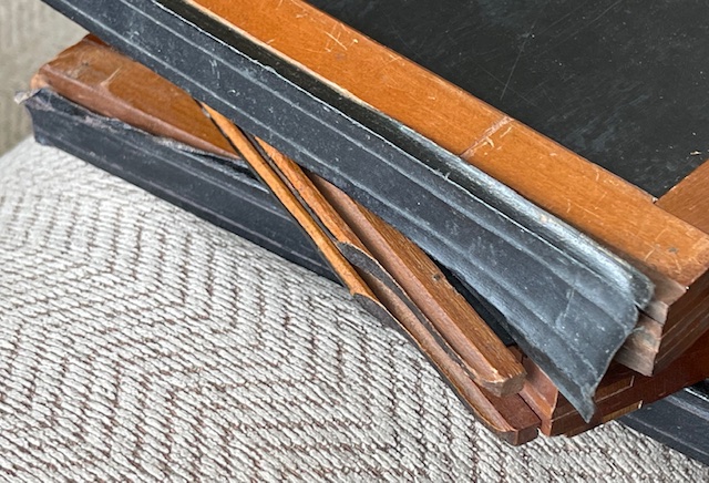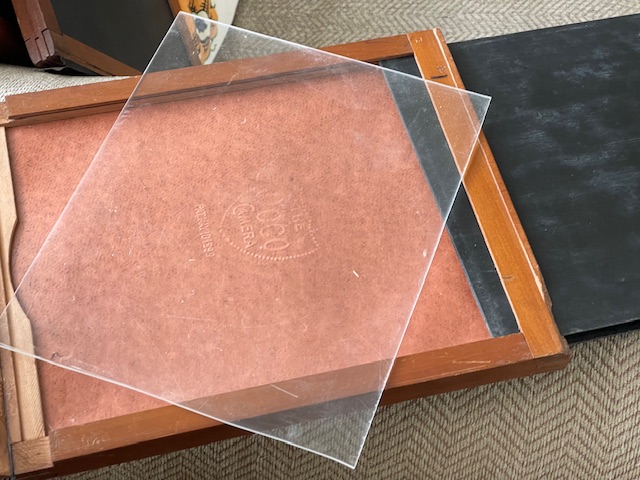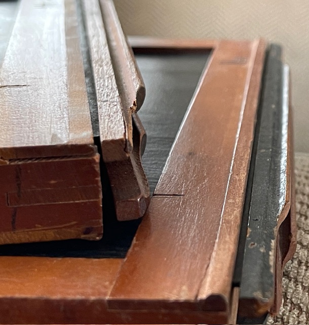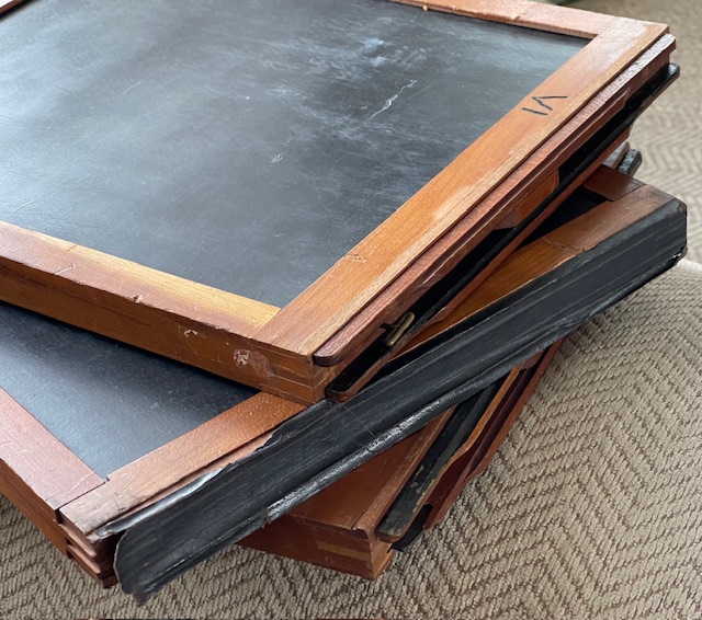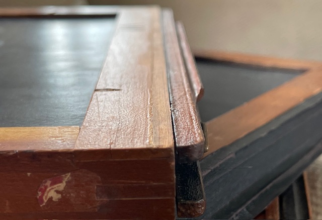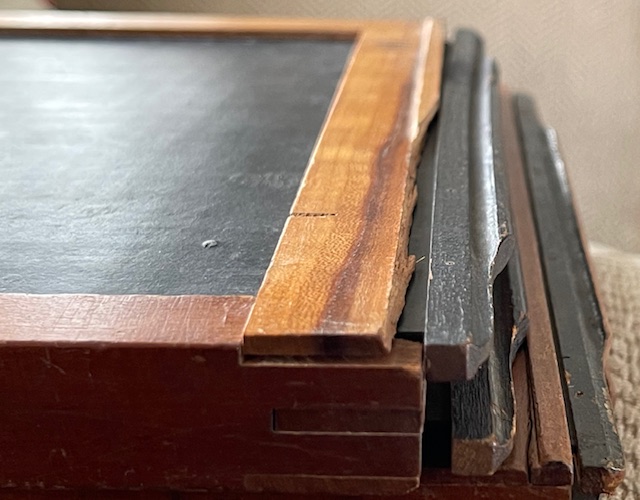 These began life as Sterling style 8X10 holders for glass plates or film if you had the sheath's. There are no sheaths but someone has put glass or plastic sheets in a couple of them to raise the plane for film perhaps, Me not know. Most have the "Sterling" light trap shaved off so they would lay flat in regular style 8X10 backs. I got them with the Korona Gundlach outfit I've got listed here also but it isn't Sterling so regular 810 holders will fit that when someone gets it. There are 6 good dark slides and a LOT of good potential for you guys who enjoy restoring wood things to their former usefulness. Shipping is a known at $18.40. They fit into a flat rate medium box. So let's say $40 total includes shipping and I'll try to keep a little over $20 bucks for these babies to offset my original costs. $40