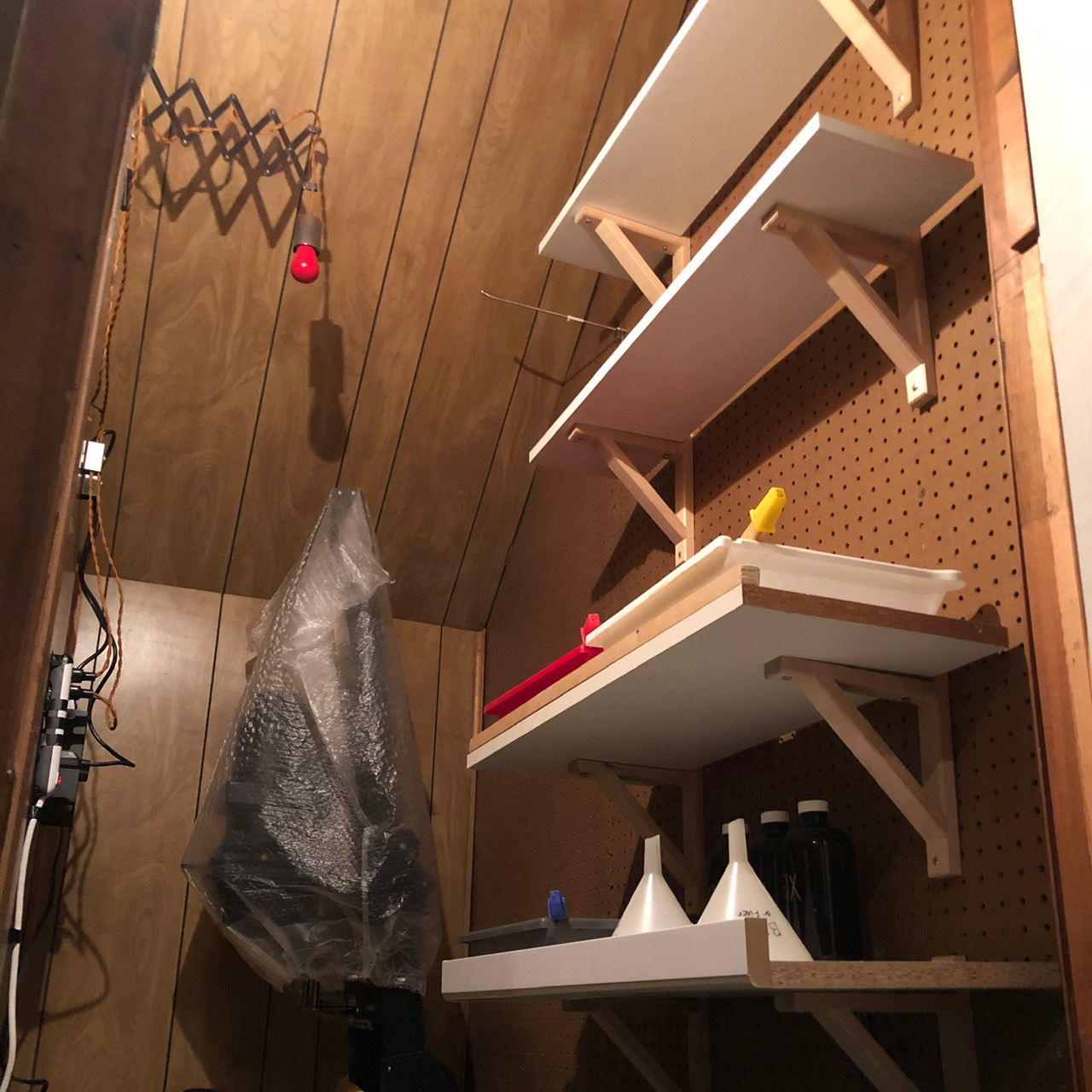 Ended up adding wider shelves with a lip, think it helps a lot. Now I just need to figure out where to put a tub of water. Think it will have to go below the shelves. I also made it to where my power strip and timer are hanging on the wall. The power strip wasn’t staying that well with the wall hooks it has so I had to add some electrical tape.Looks good!