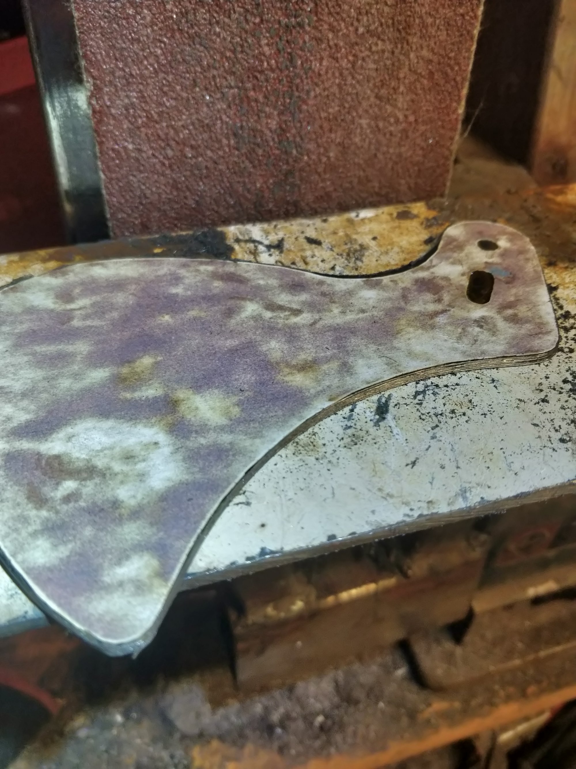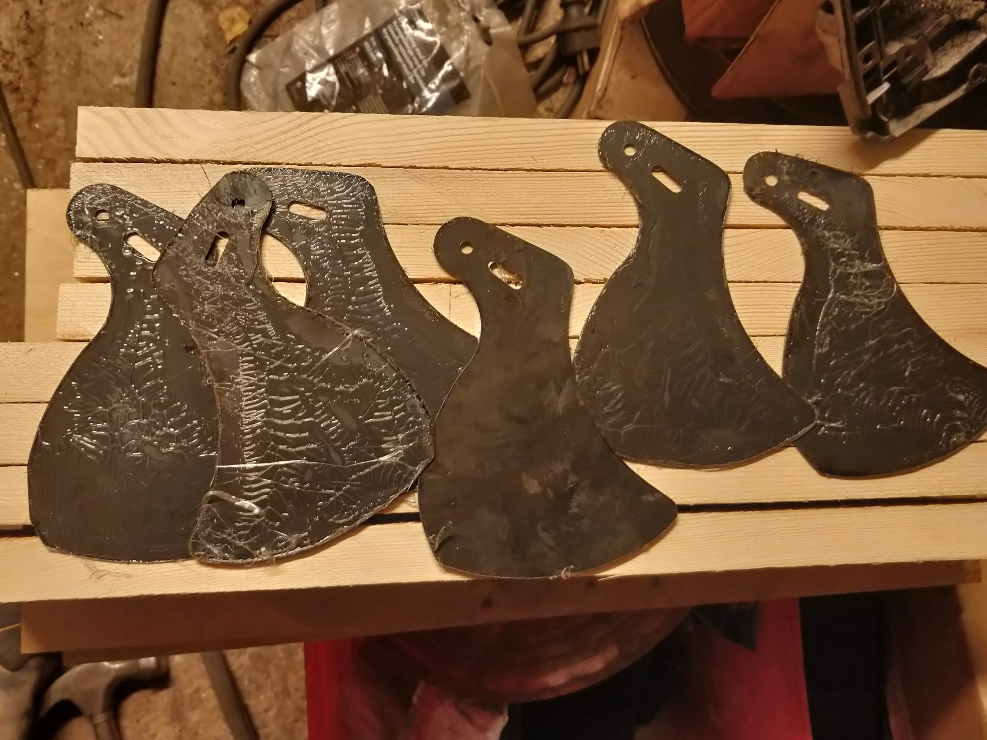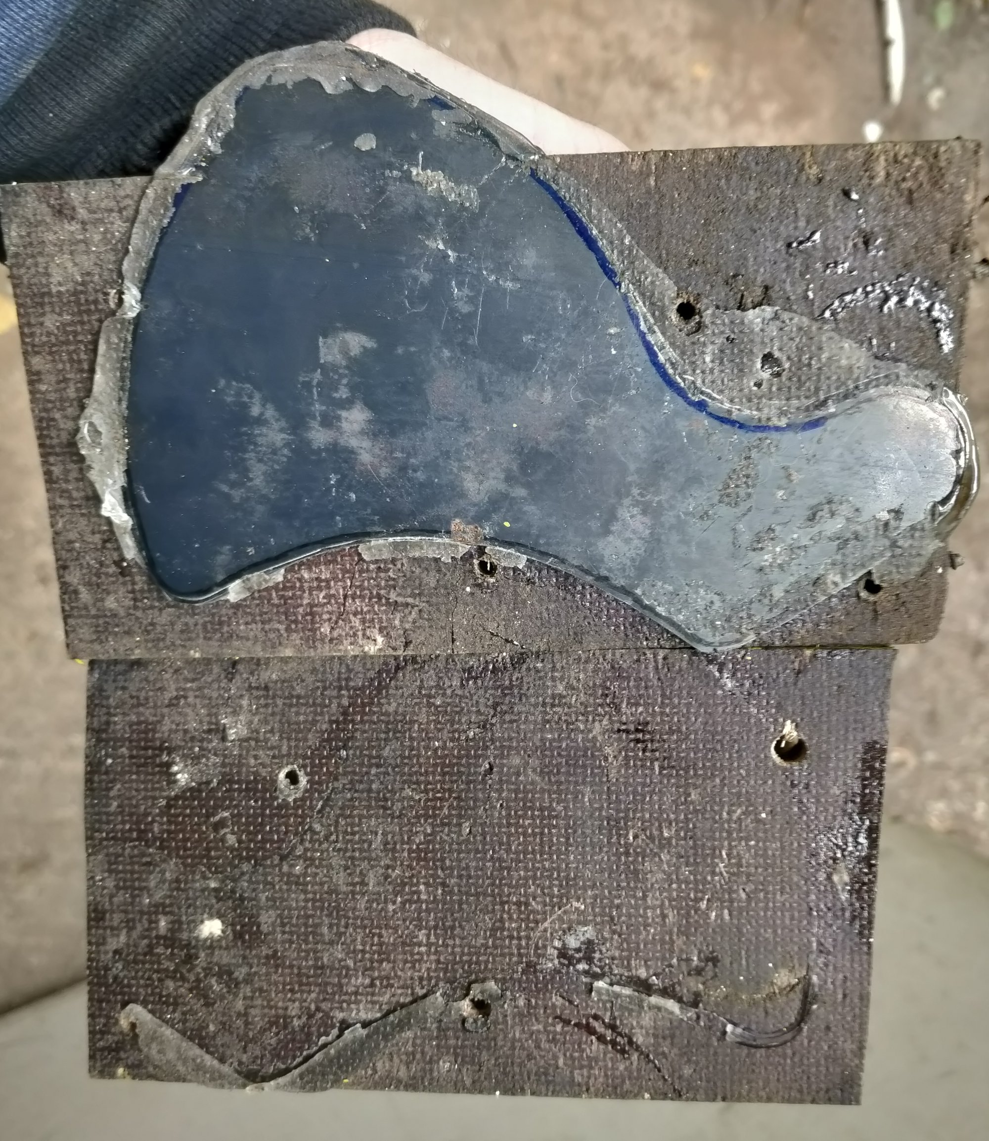 After this leafs were hot glued together, in oven at 180c, and squeezed together between plywood pieces. This helps me to get 6 similar pieces at once using belt sander and die grinder with stone.