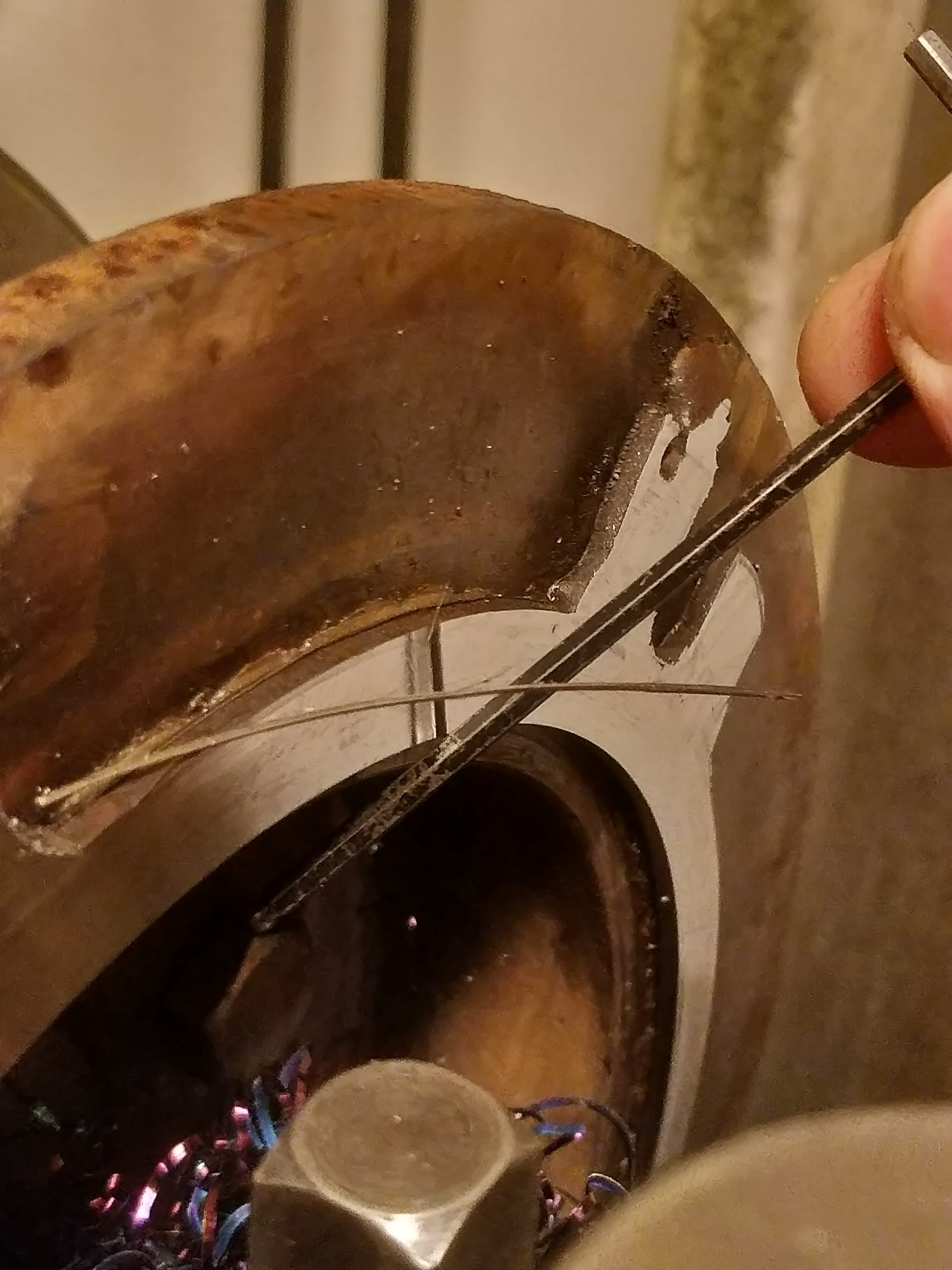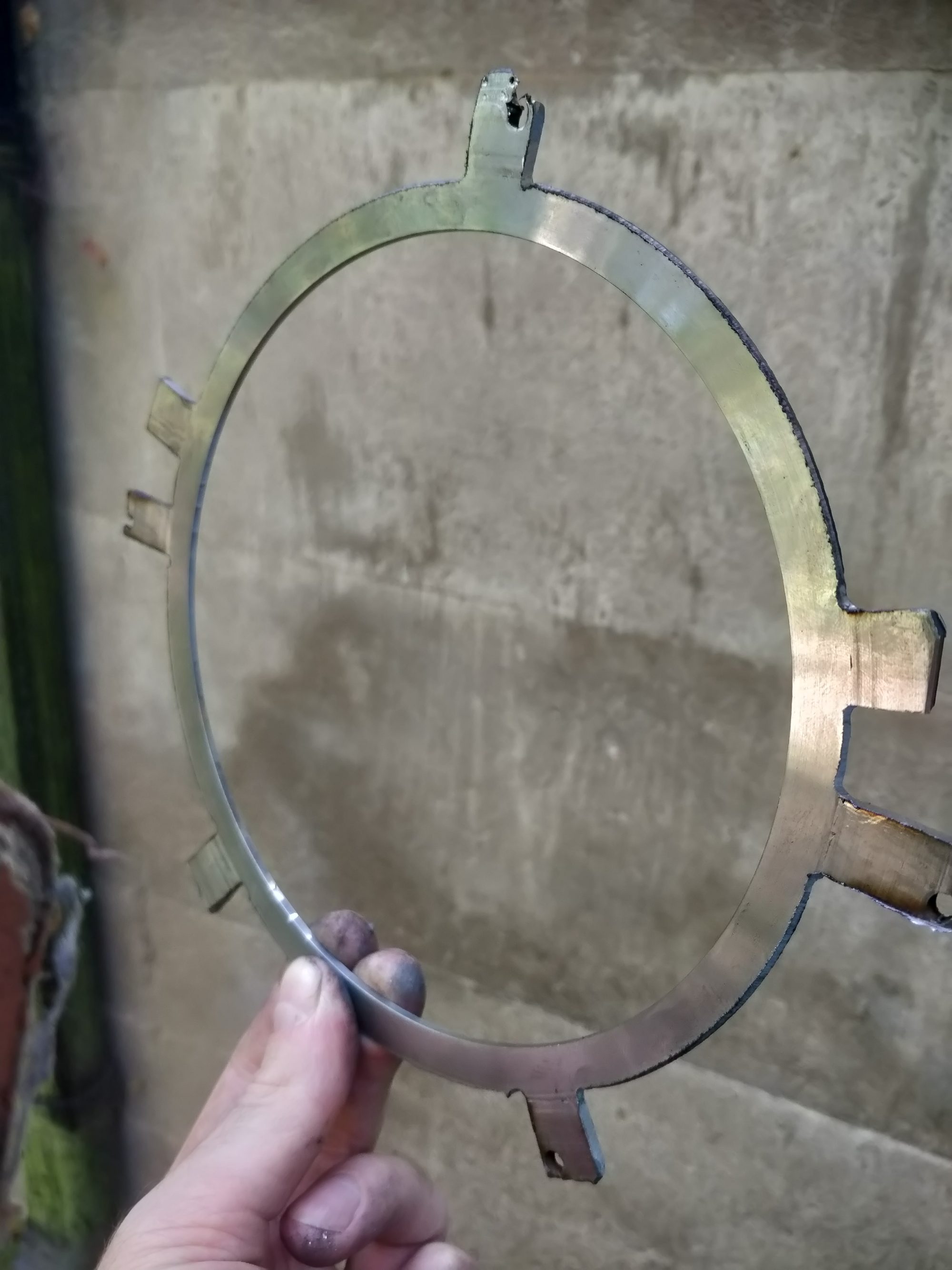 There inner surface is machined to be perfectly round, because it had gone 0.2mm out of round from all the welding mountings and machining earlier. Now its ready for trimming outer shapes and riveting the pins to it.