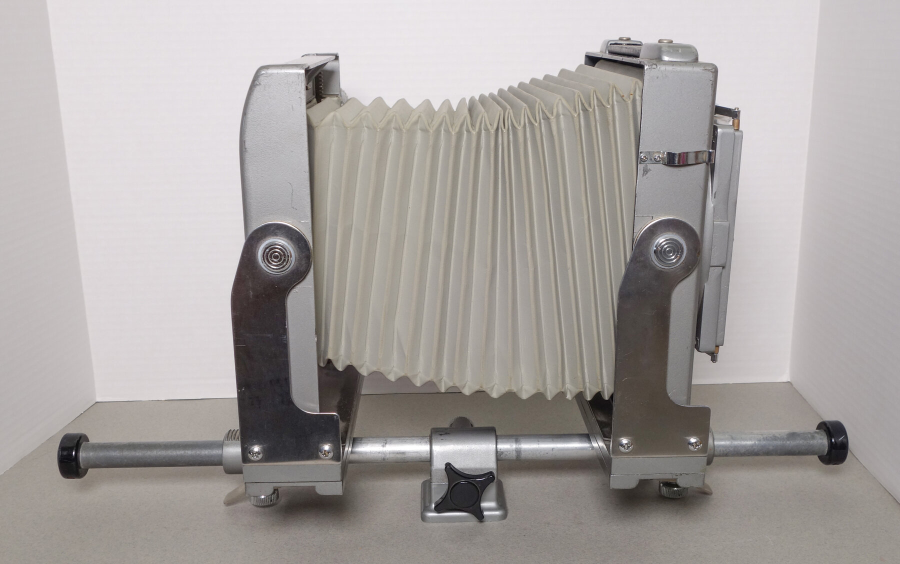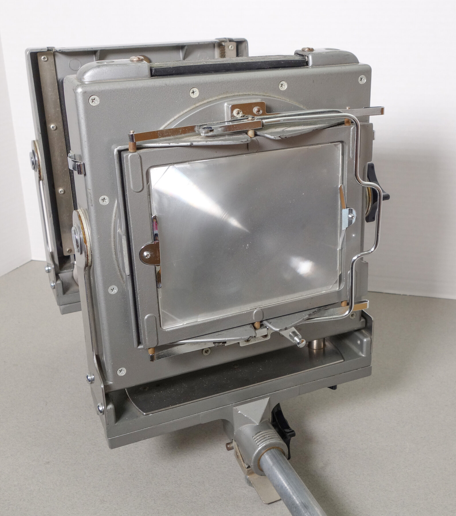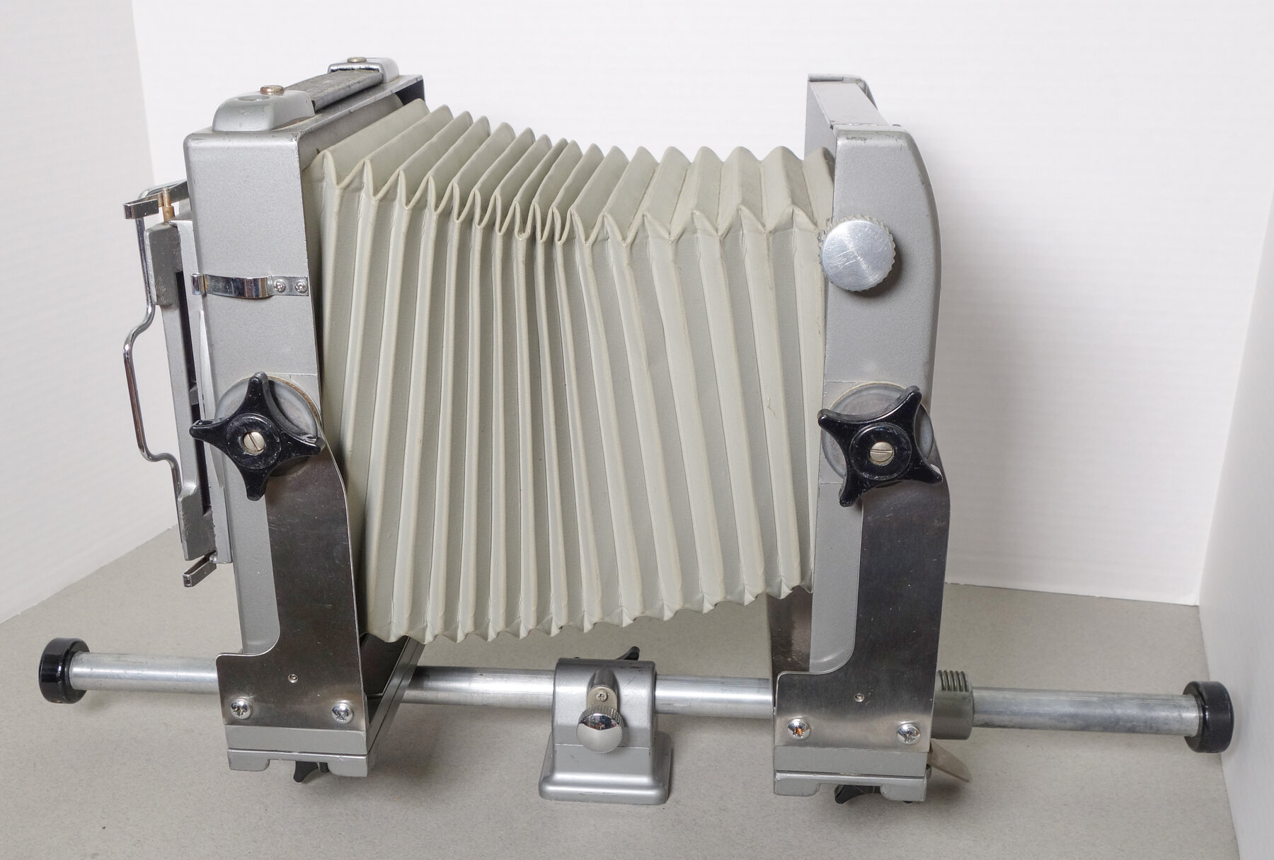 Camera works well. Has "bail" back for easy inserting film holders. I did find about 10 pinholes in the bellows when I stretched out the bellows. I filled them inside with some black acrylic paint. You should of course do your own flashlight test.