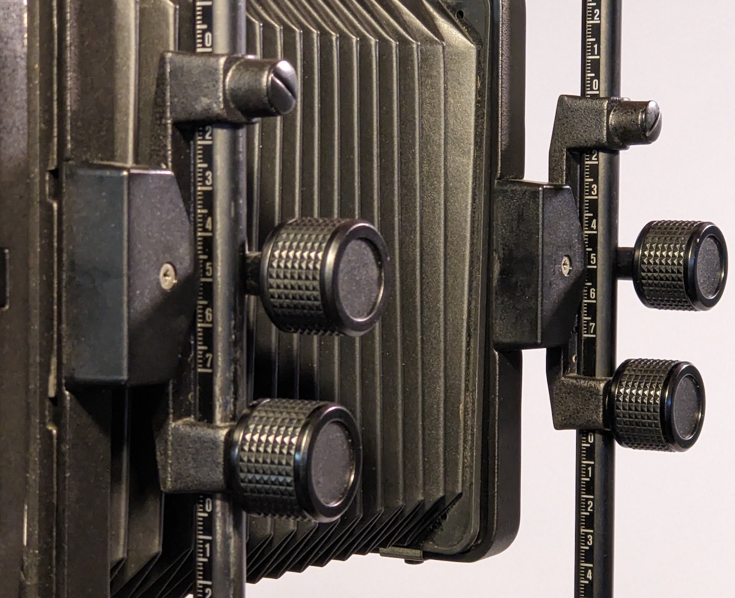 Rise and Fall Knobs. The rise and fall knobs on these cameras have what's called "brakes," which are a nylon bushings to exert pressure between the knob and the post to lock the movement. Most of these cameras are sold with mashed-in brakes: The former users exerted such pressure that the nylon compresses into the threads. As a result, the rise and fall movements are hard to position easily, and eventually the knobs won't lock at all. I cleaned out the sockets and installed new brakes (I'll include some extra brakes too). Remember - very little pressure is needed.