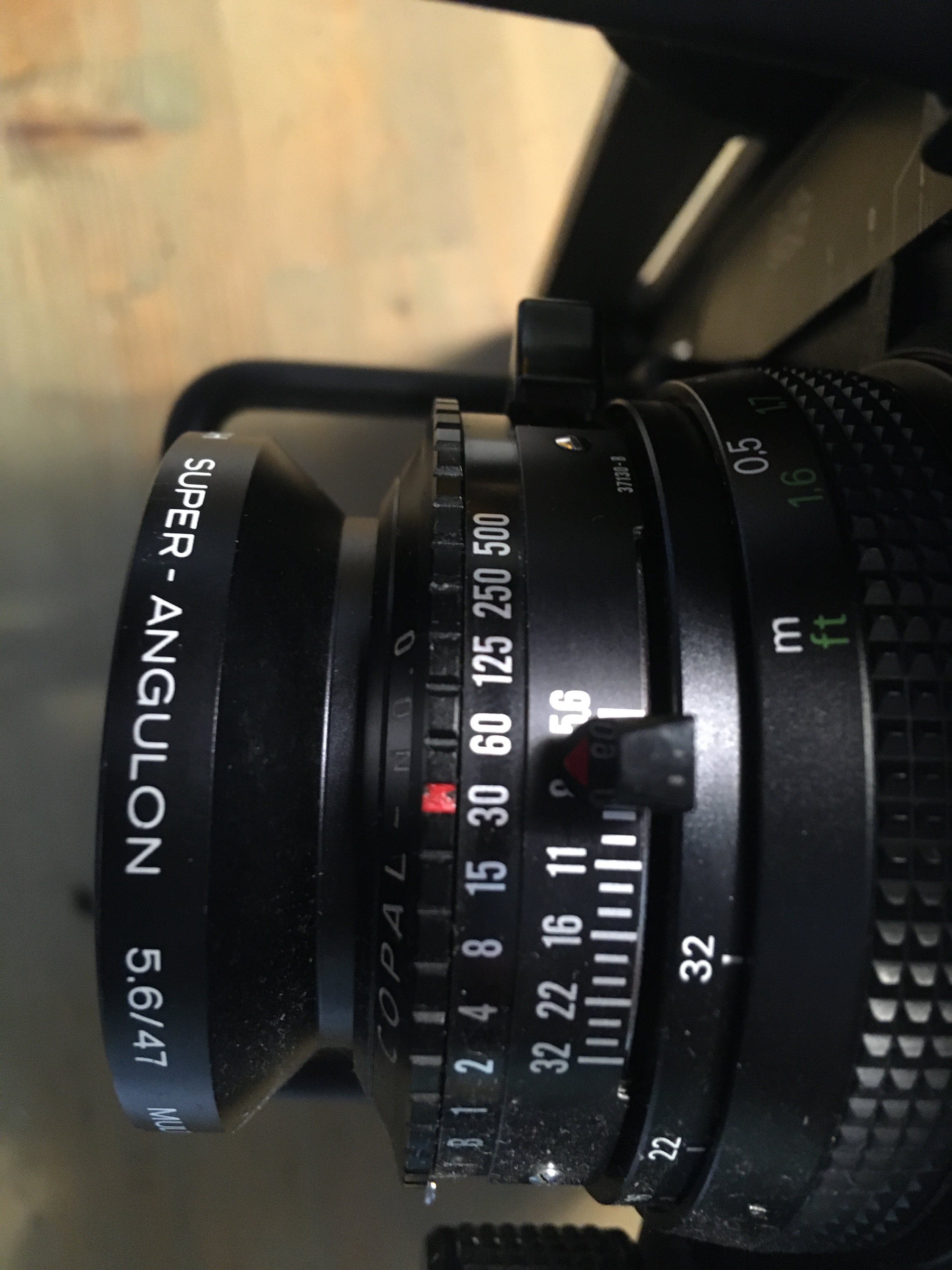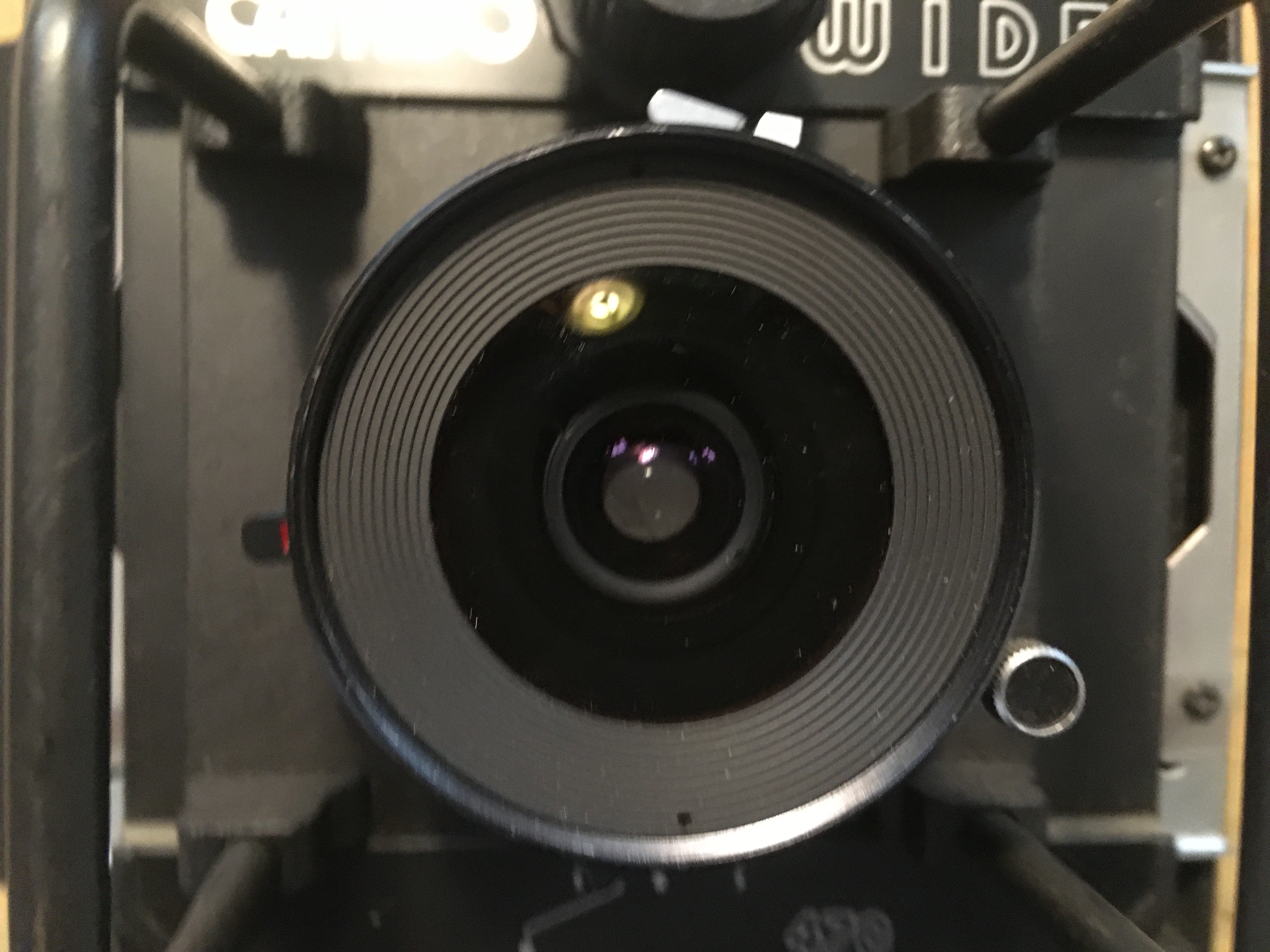 Selling my Cameo Wide 470. This is a 4x5 camera with a Schneider 47mm f5.6 lens. It's about as compact and light as you can get. It's basically lens in a focussing helicoid mounted on a frame with a handle and ground glass. Movements are provided in the form of limited horizontal or vertical shift (either-or; not both). The 47mm lens is extremely wide and quite sharp. The one on this camera is clean and works as it should. Please note that this lens does not fully cover 4x5; you will definitely see vignetting, even stopped down. It was intended for use with roll film backs up to 6x12, which it fully covers. (There is a "47xl" version of this camera with a 47mm lens that does fully cover 4x5, but they seem to be pretty scarce). The camera takes standard Graflok backs, so you can mount most any roll film, Polaroid or sheet film back meant for 4x5 cameras.