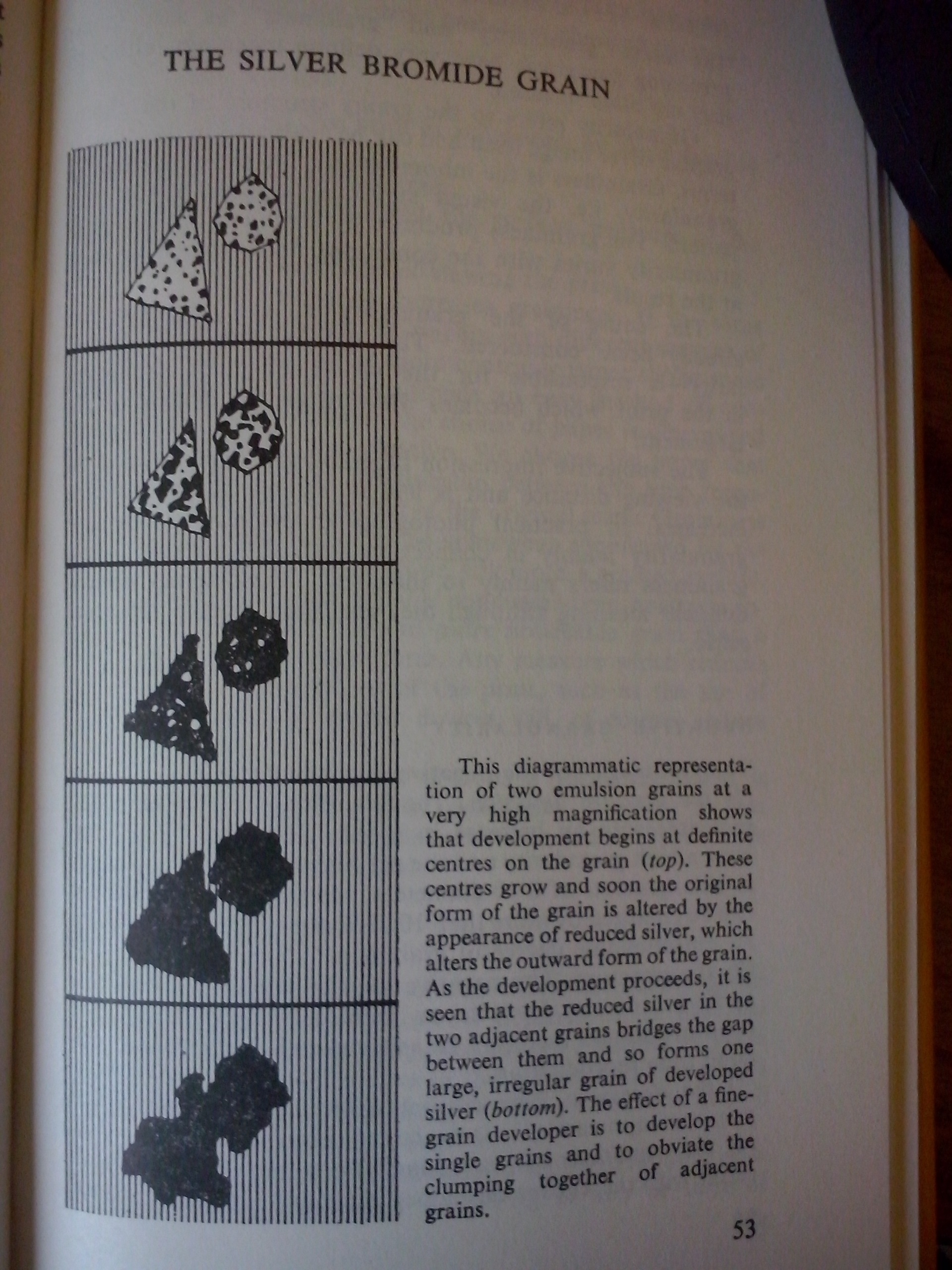 I understand that AgX crystals are fixed in place and cannot migrate in an emulsion, however I was just reading Kurt Jacobsen's book "Developing" (18th ed.) and on page 53 there is a diagram and explanation of what he calls grain clumping -- where the reduced silver between two adjacent AgX grains that are developing can form a bridge between each other, thus forming a single, irregularly shape large silver grain. Is this notion of "grain clumping" also incorrect? I'd be interested to learn more about it. I don't take Jacobsen's book to be an absolute authority on photographic science (such as Haist's or Mees'), but I was under the impression that his book was fairly reputable (at least the later editions). Has the meaning of grain clumping changed over the years from "an actually occurring process of discrete adjacent AgX crystals developing into a larger irregular mass of silver" to "a fictional process whereby AgX crystals can move throughout the emulsion"?
