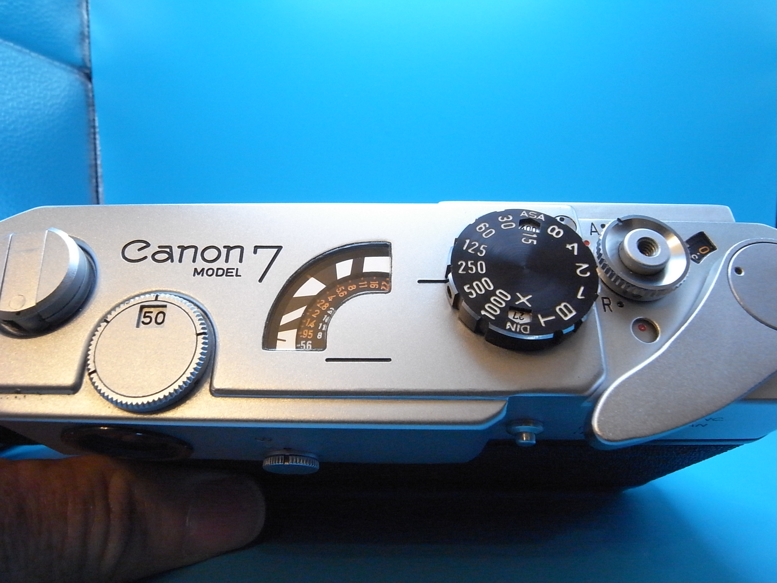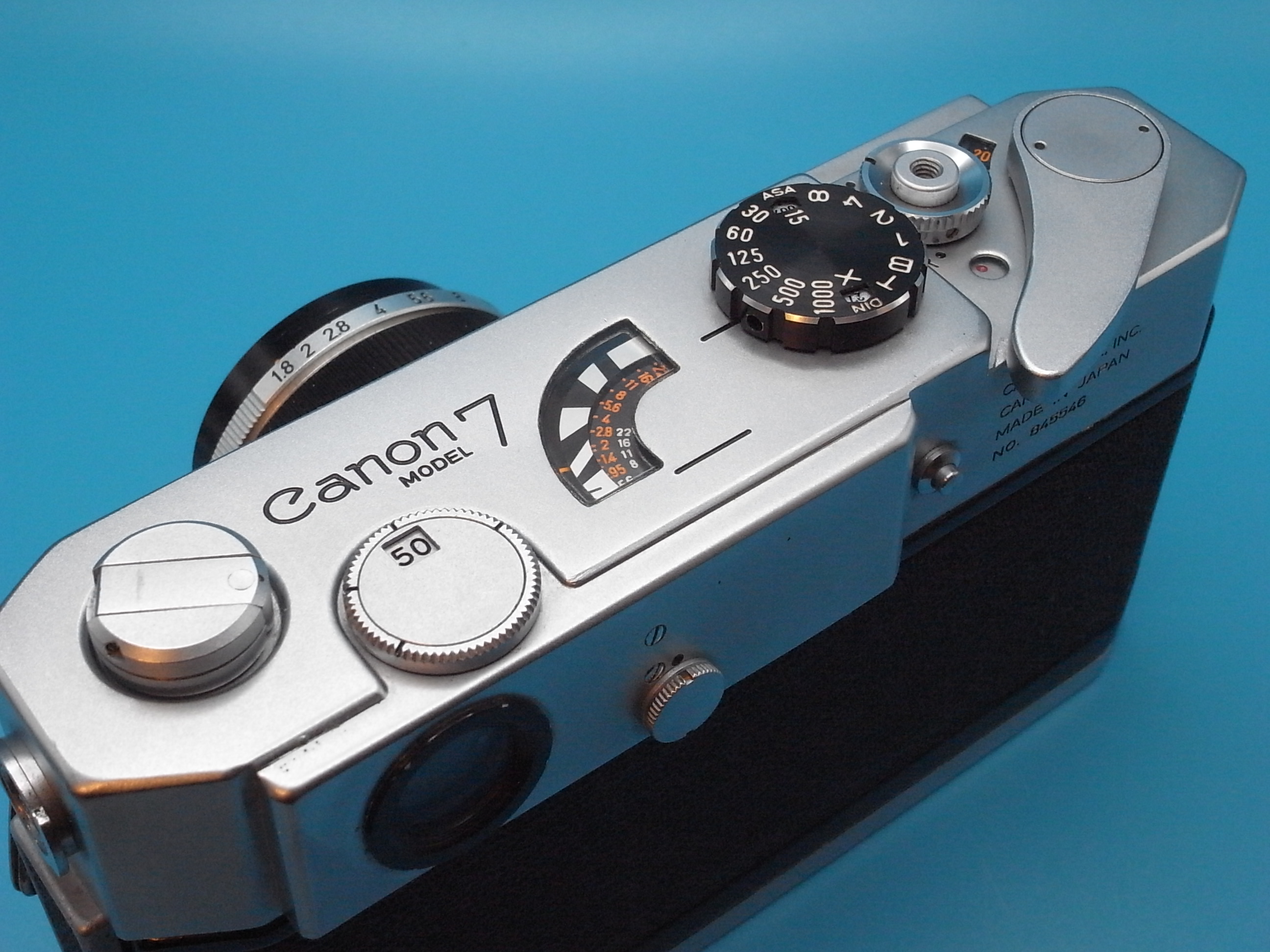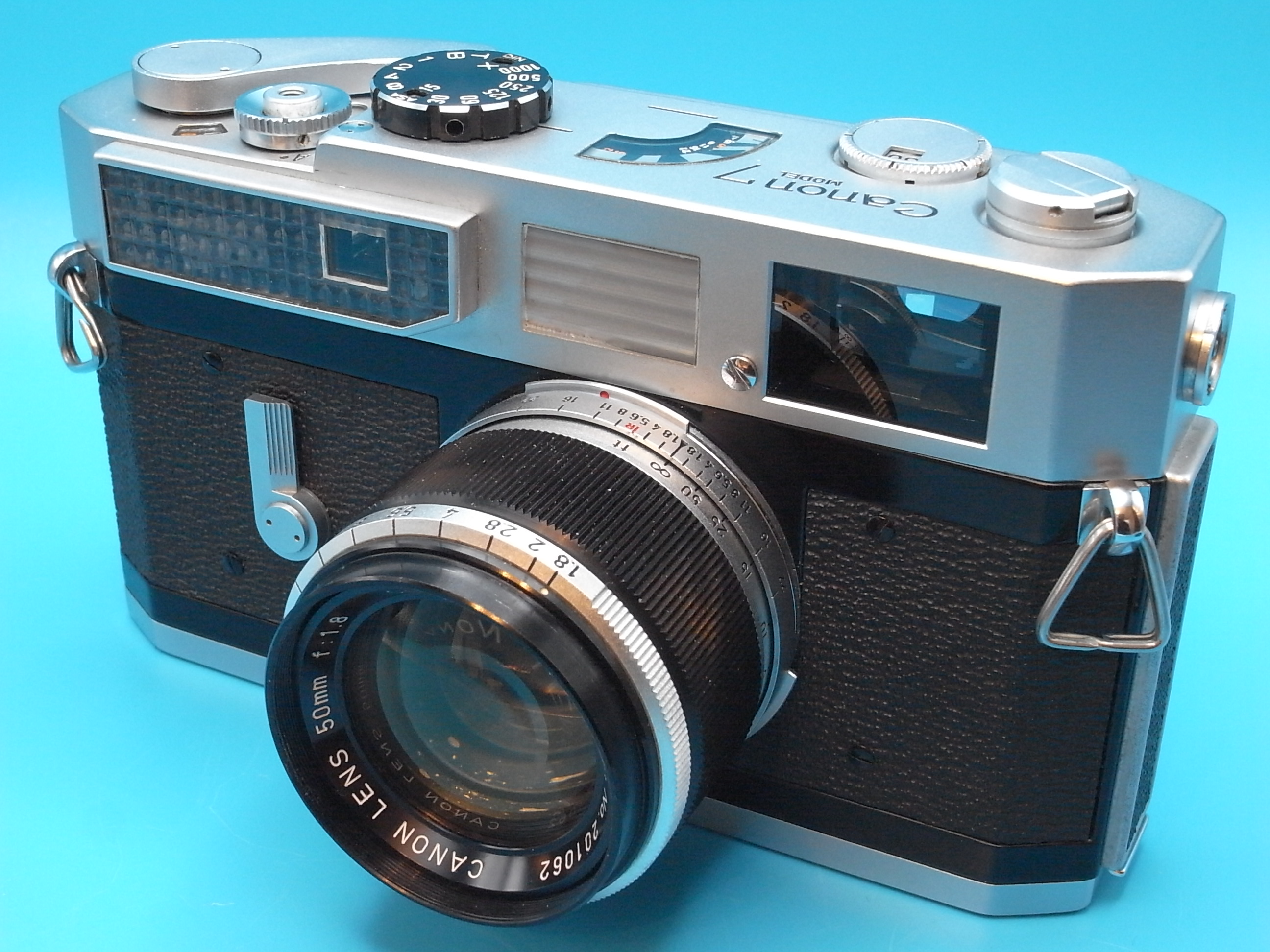 Here is a recently CLA'd Canon 7 camera with it's standard 50mm f1.8 lens. The camera is in wonderful condition with little sign of use. The viewfinder is clean, bright, and clear, the rangefinder is contrasty and clean, frame lines all bright and clean. The meter works perfectly both standard and low ranges working. Winder is good, frames spaced properly. Film tested. The curtains are titanium and better than most, there is one little ding on the first curtain. The lens is clean and clear throughout, very, very sharp at all apertures too. The focusing is silky smooth. This is a great kit and the Canon 7 gives you metering and frame lines for different lenses, something that Leica Barnacks don't do. $280 shipped in USA, I prefer an F&F payment.