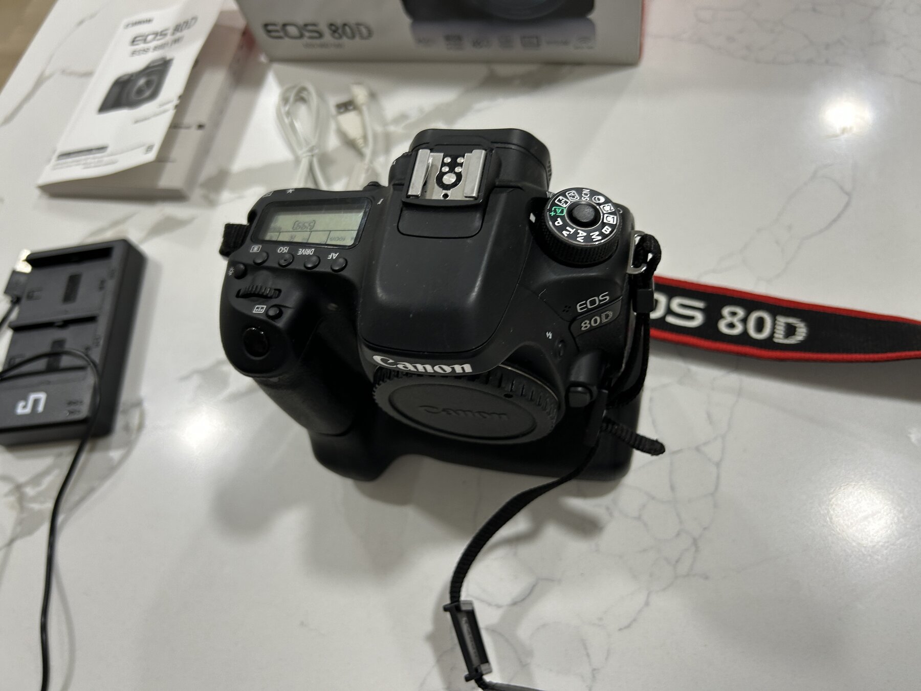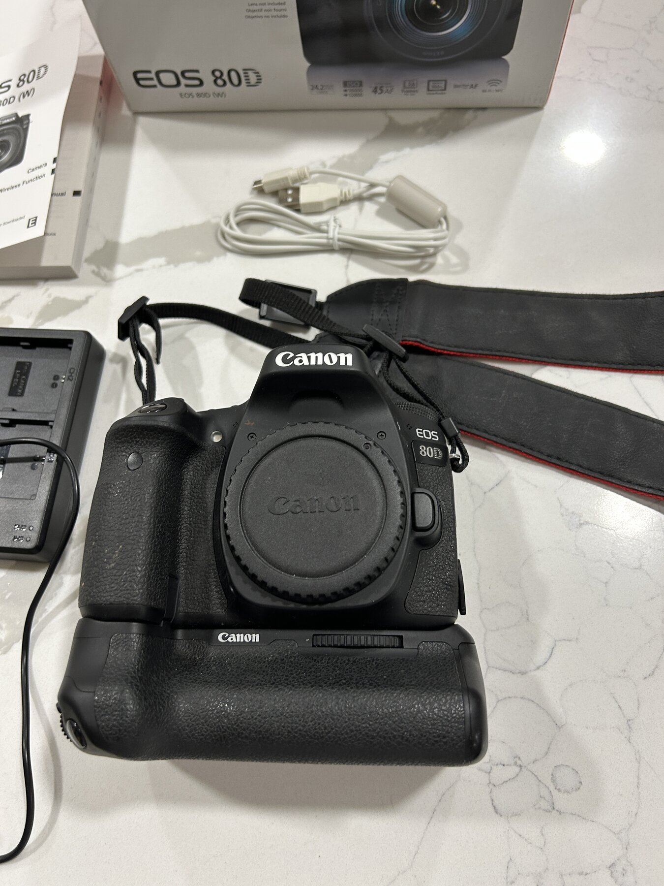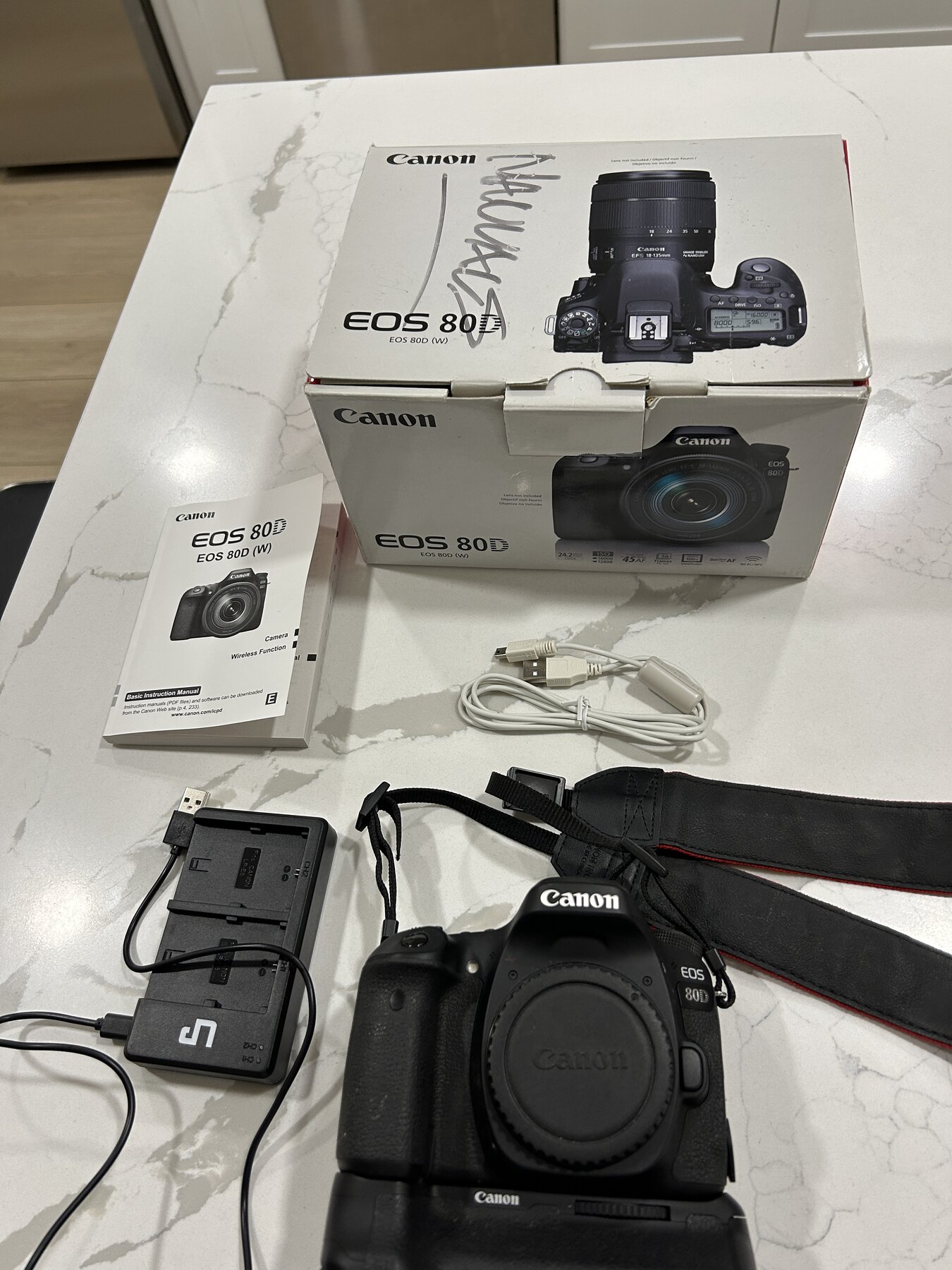 I am selling a Canon EOS 80D camera body in excellent working condition. The sale includes the camera, the original box, original body cap, original fine Canon strap, original manual, a new USB cable, and a new aftermarket battery and charger. The EOS 80D is a sophisticated digital SLR with extensive capabilities. The box has a note written on the top of it by a previous owner, otherwise it is in good condition.