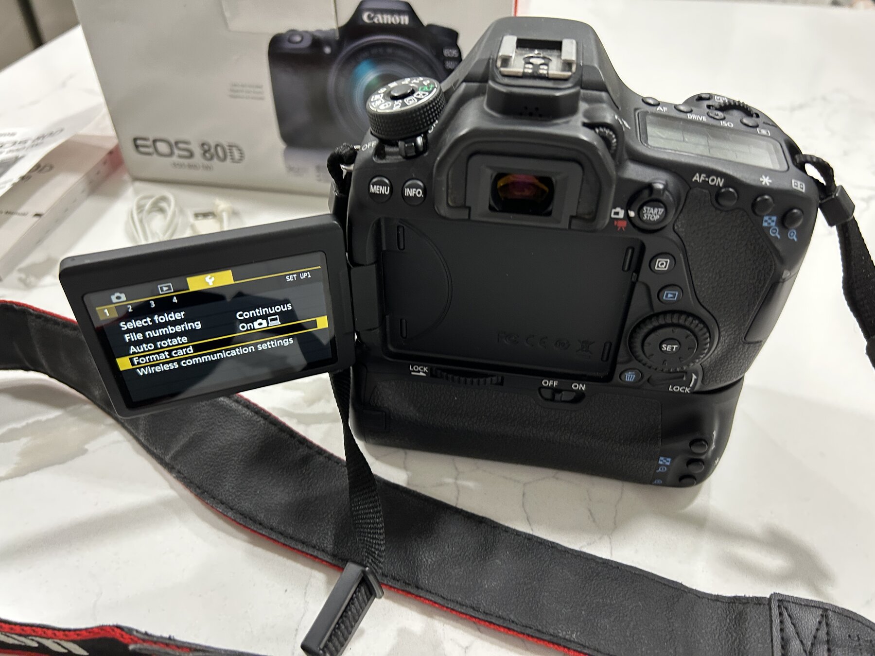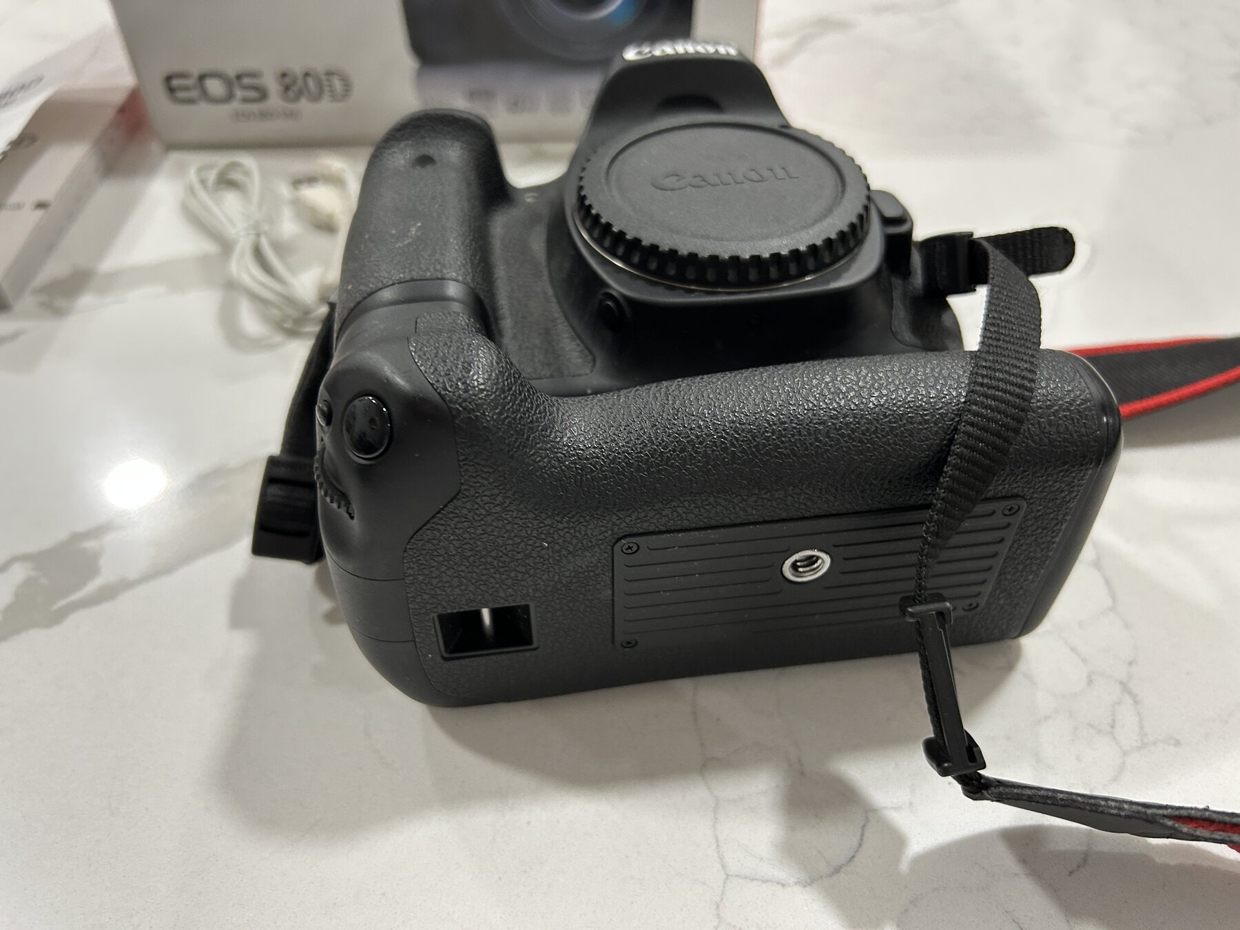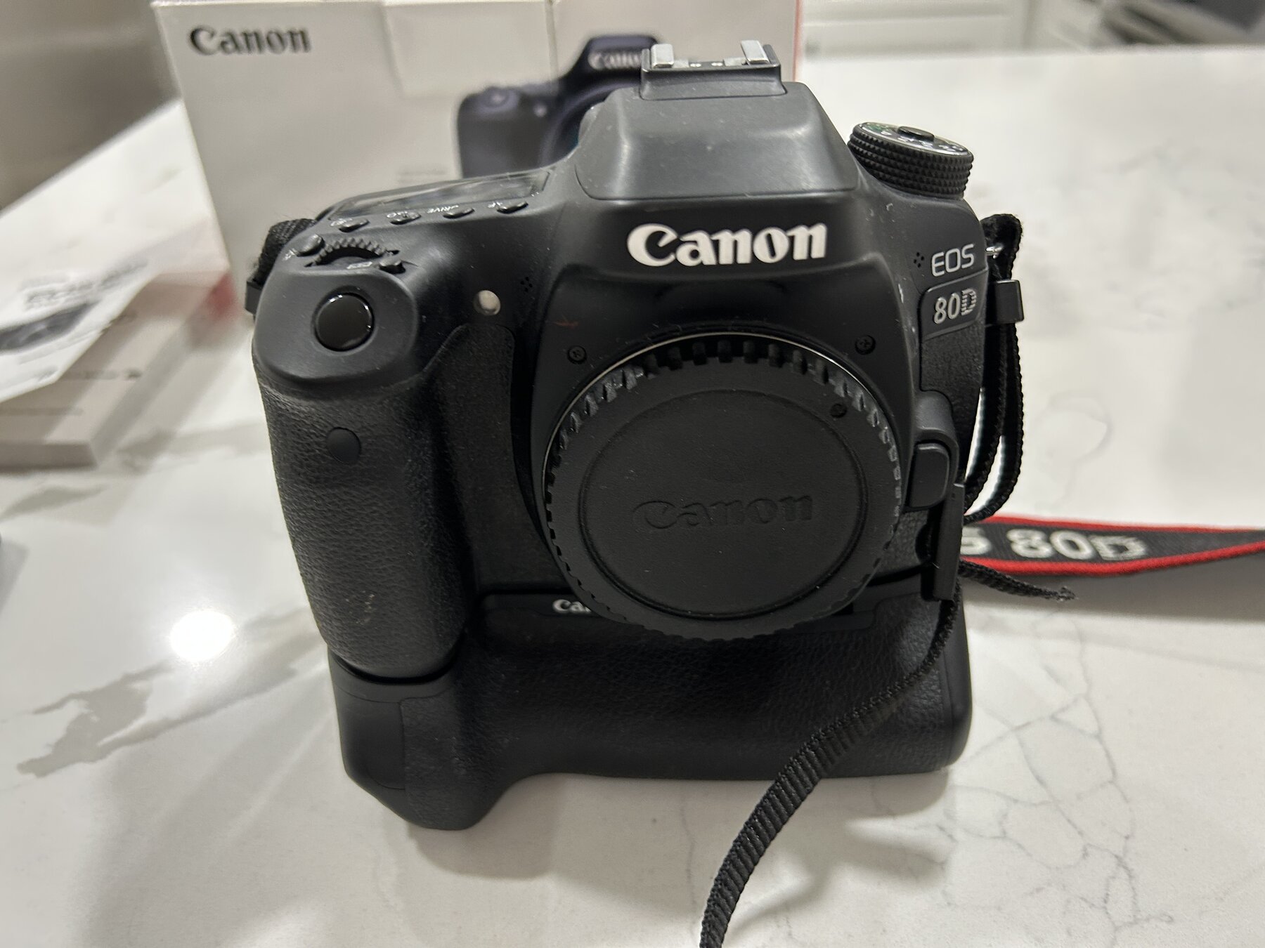 I am selling a Canon EOS 80D camera body in excellent working condition. The sale includes the camera, the original box, original body cap, original fine Canon strap, original manual, a new USB cable, and a new aftermarket battery and charger. The EOS 80D is a sophisticated digital SLR with extensive capabilities. The box has a note written on the top of it by a previous owner, otherwise it is in good condition.