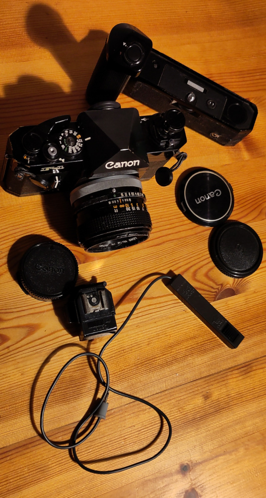 Included are the body and lens caps, the original plate for the body, plus an "L" flash coupler and a remote for the winder.